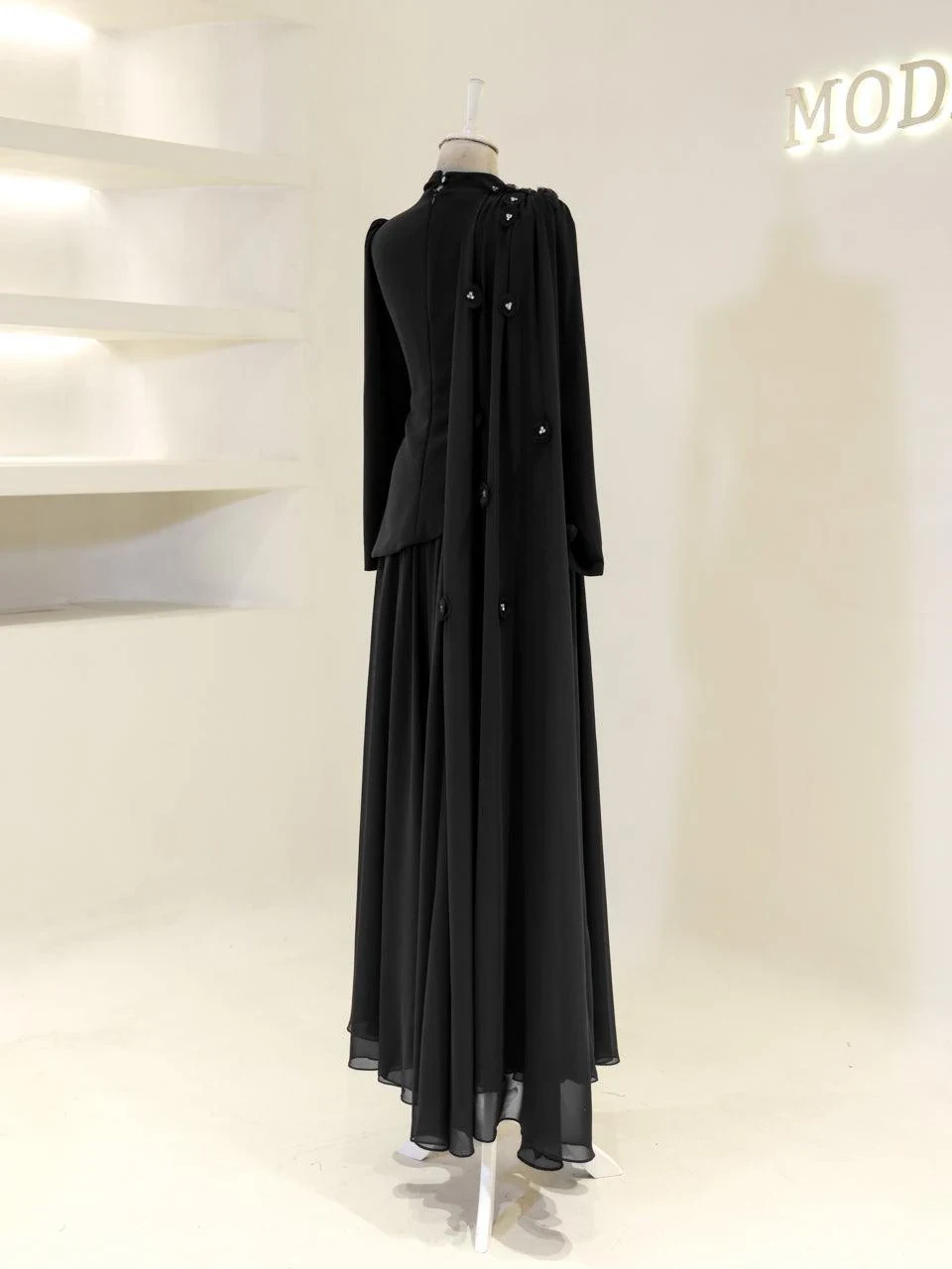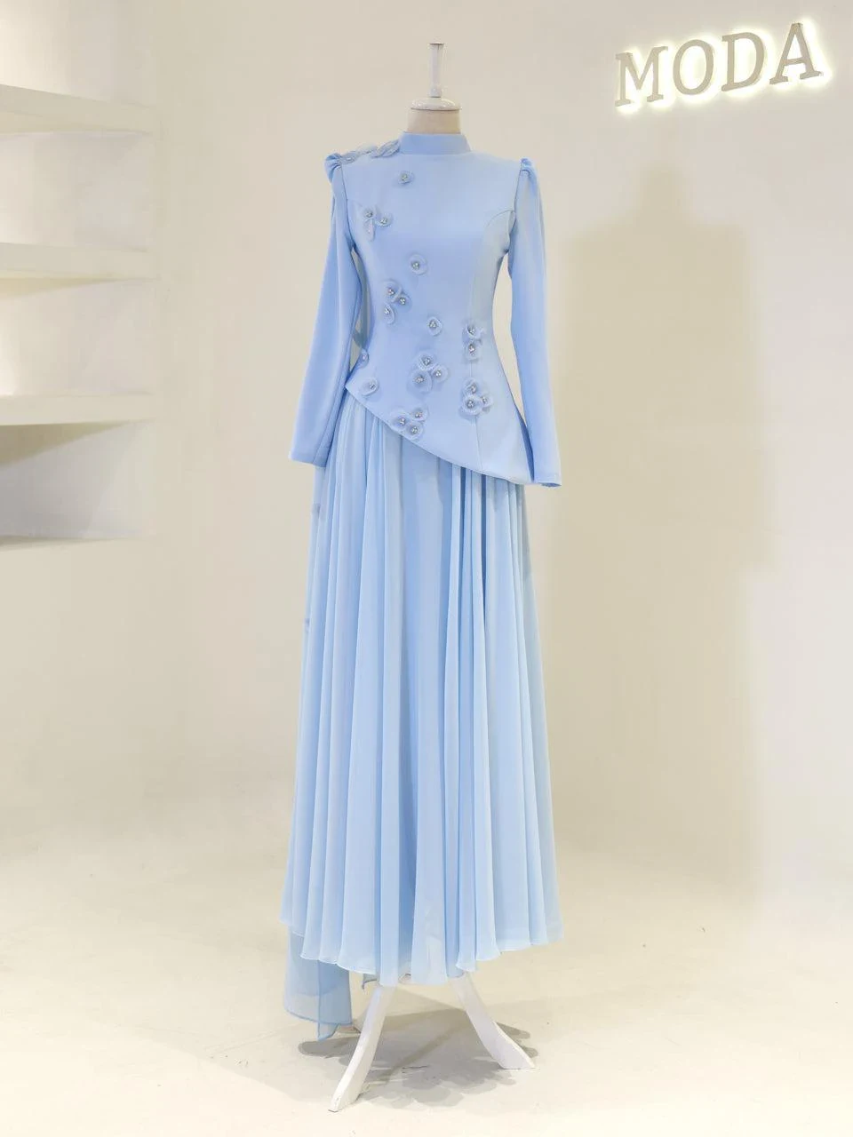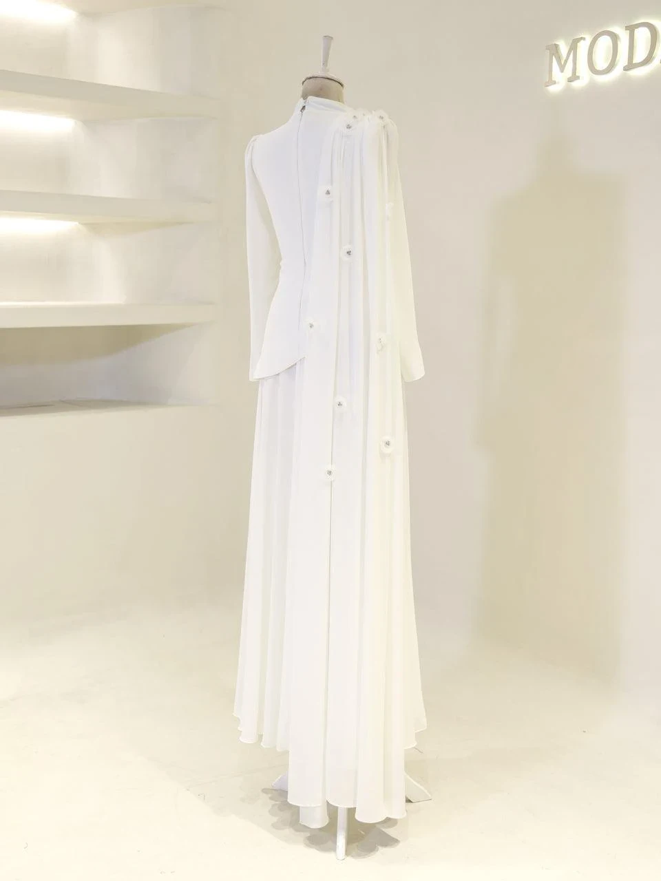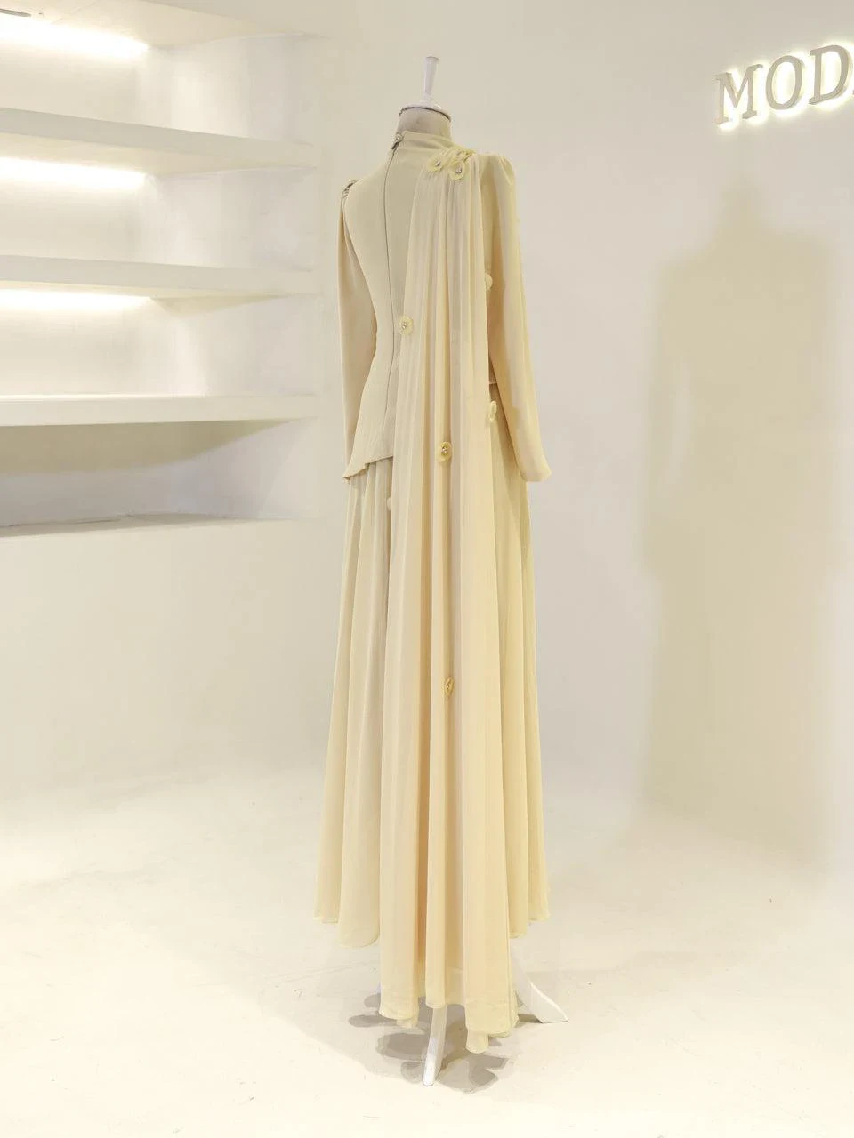 The Levana Modest Evening Dress is designed with a true-to-size fit and measures 150 cm in length. The lower part of the dress is made from chiffon, while the upper part is crafted from crepe fabric. It includes a lining and a back zipper closure for ease of wear. The dress is equipped with a built-in chest pad and features a cape detail that extends from the right shoulder to the hem. The embellishments are securely attached and not glued. It has a flared skirt design.