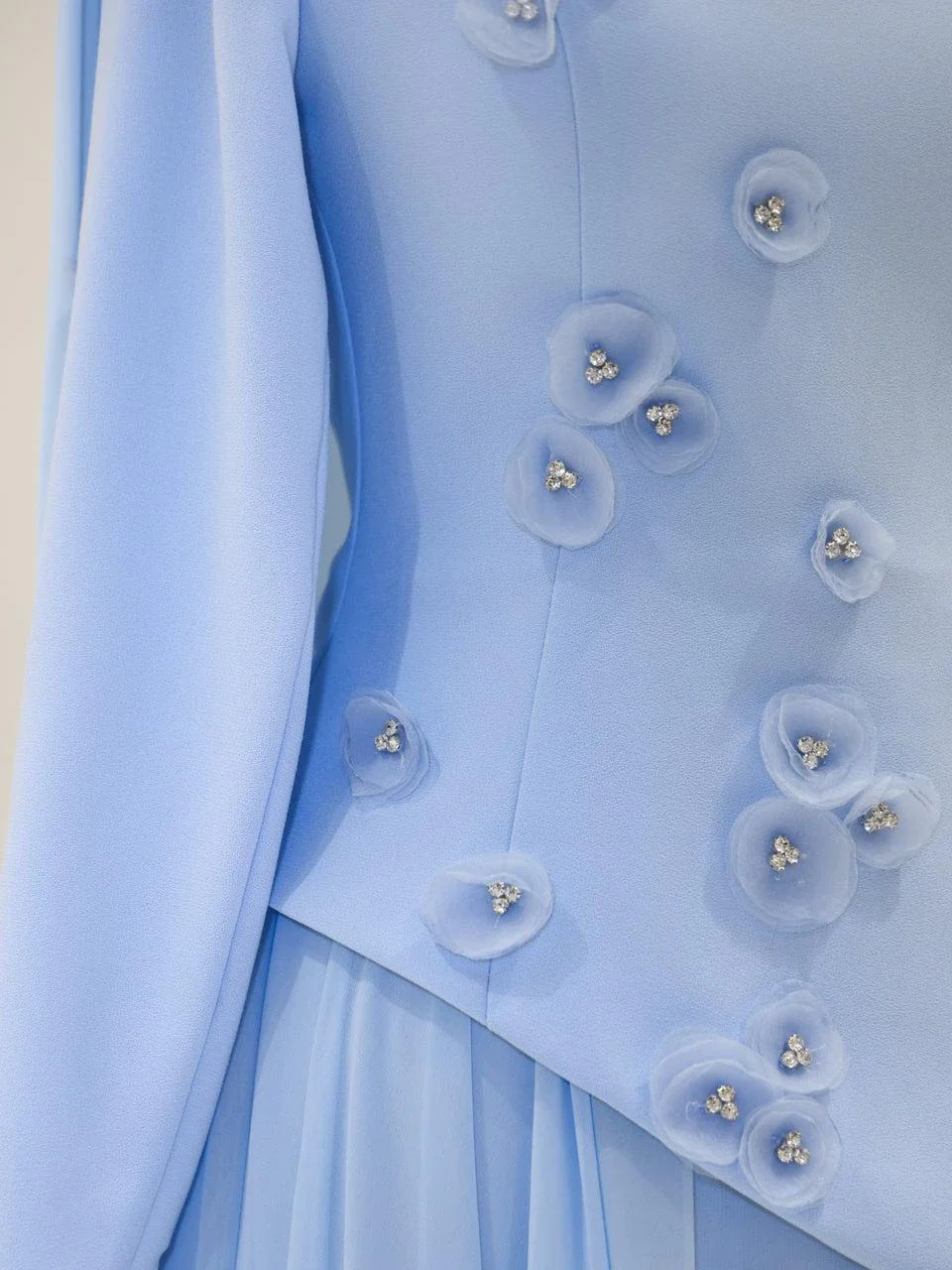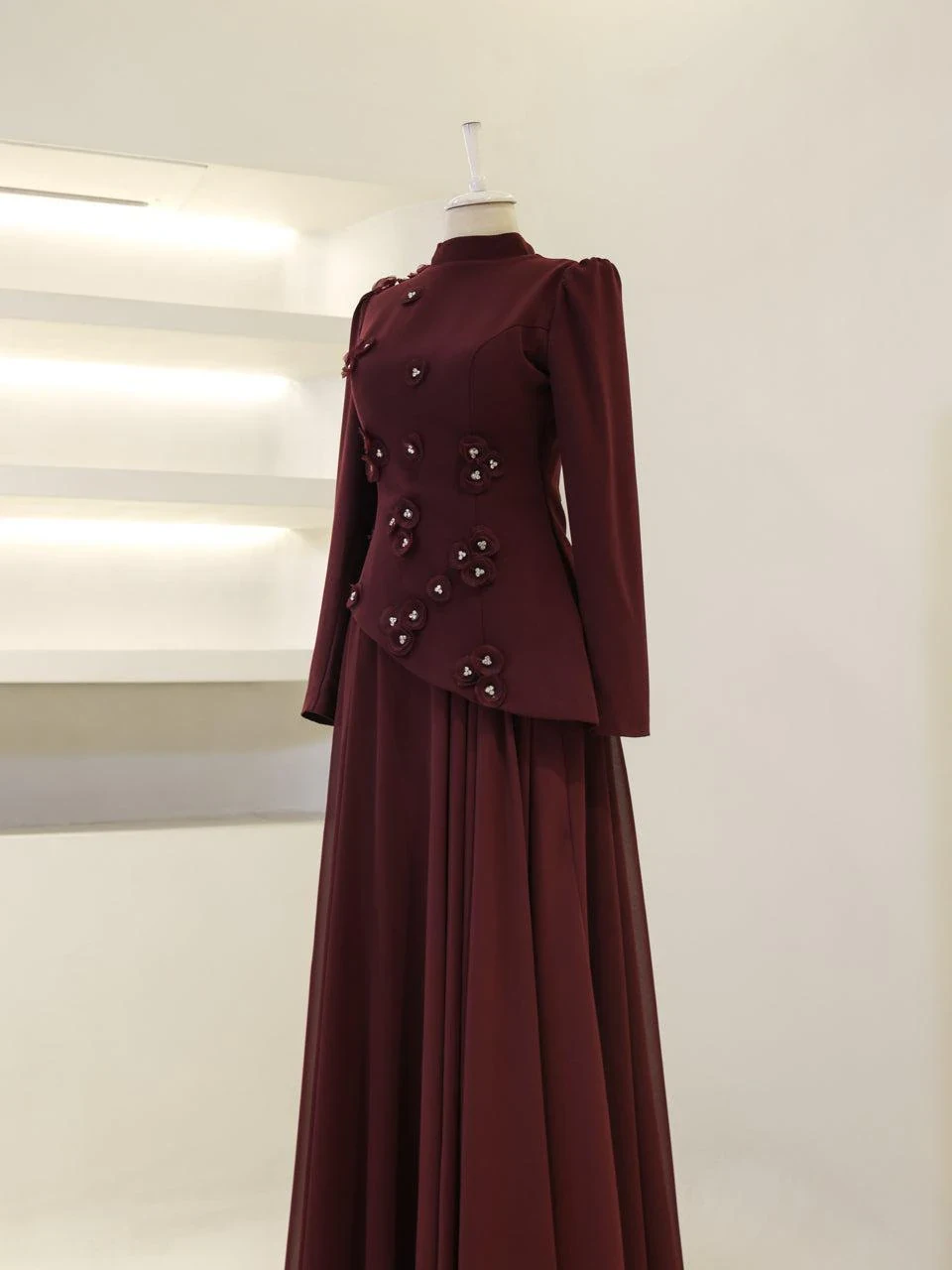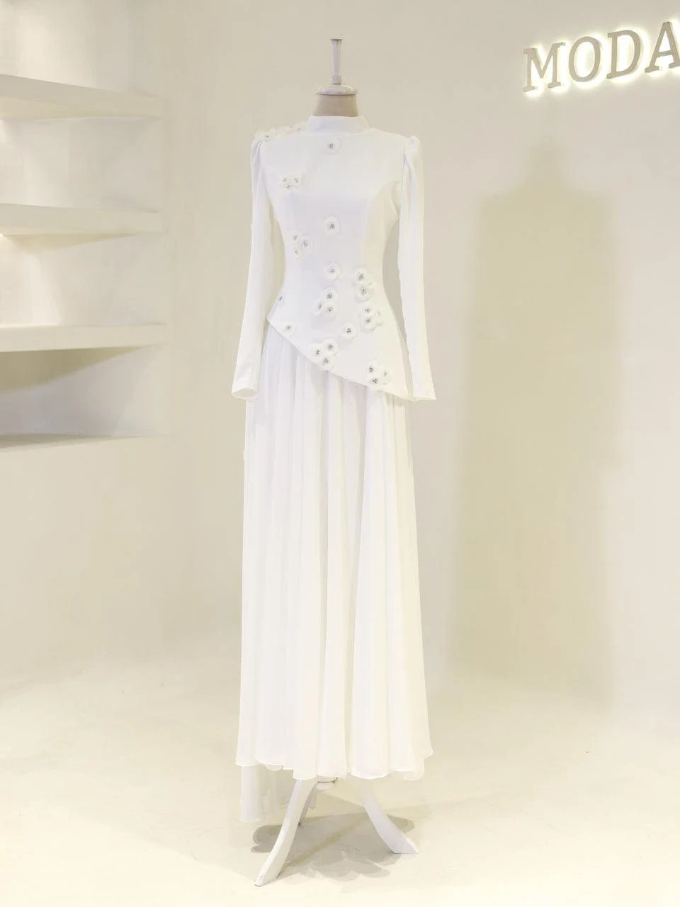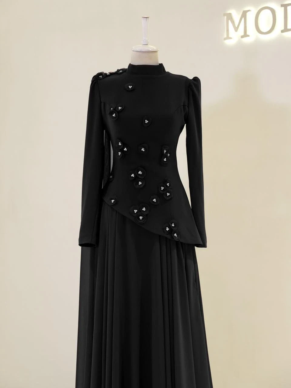 The Levana Modest Evening Dress is designed with a true-to-size fit and measures 150 cm in length. The lower part of the dress is made from chiffon, while the upper part is crafted from crepe fabric. It includes a lining and a back zipper closure for ease of wear. The dress is equipped with a built-in chest pad and features a cape detail that extends from the right shoulder to the hem. The embellishments are securely attached and not glued. It has a flared skirt design.