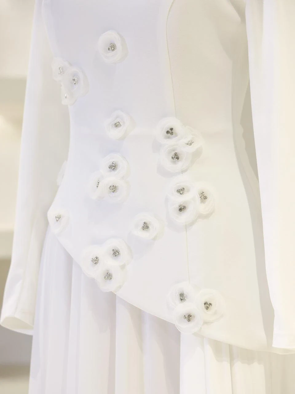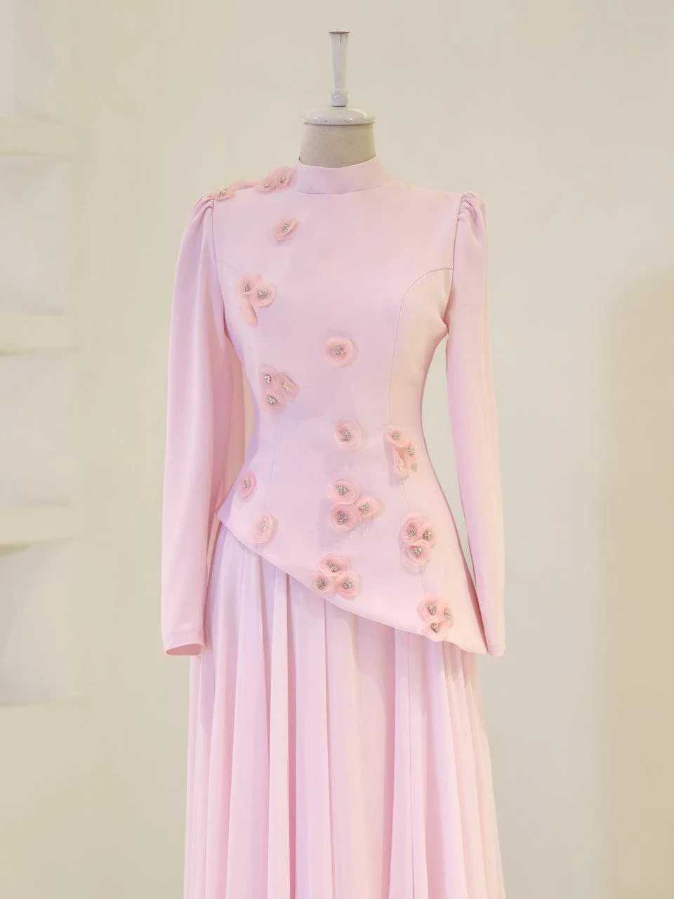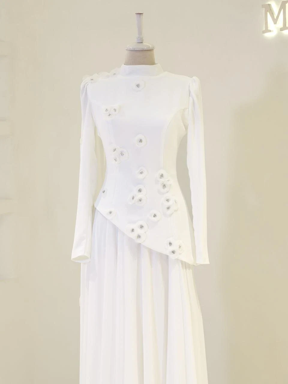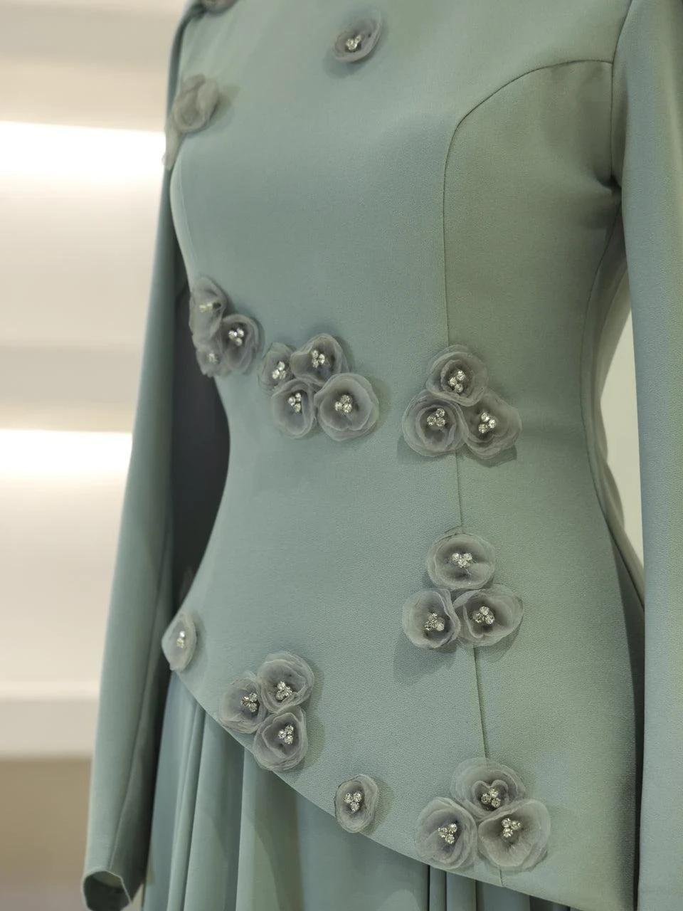 The Levana Modest Evening Dress is designed with a true-to-size fit and measures 150 cm in length. The lower part of the dress is made from chiffon, while the upper part is crafted from crepe fabric. It includes a lining and a back zipper closure for ease of wear. The dress is equipped with a built-in chest pad and features a cape detail that extends from the right shoulder to the hem. The embellishments are securely attached and not glued. It has a flared skirt design.