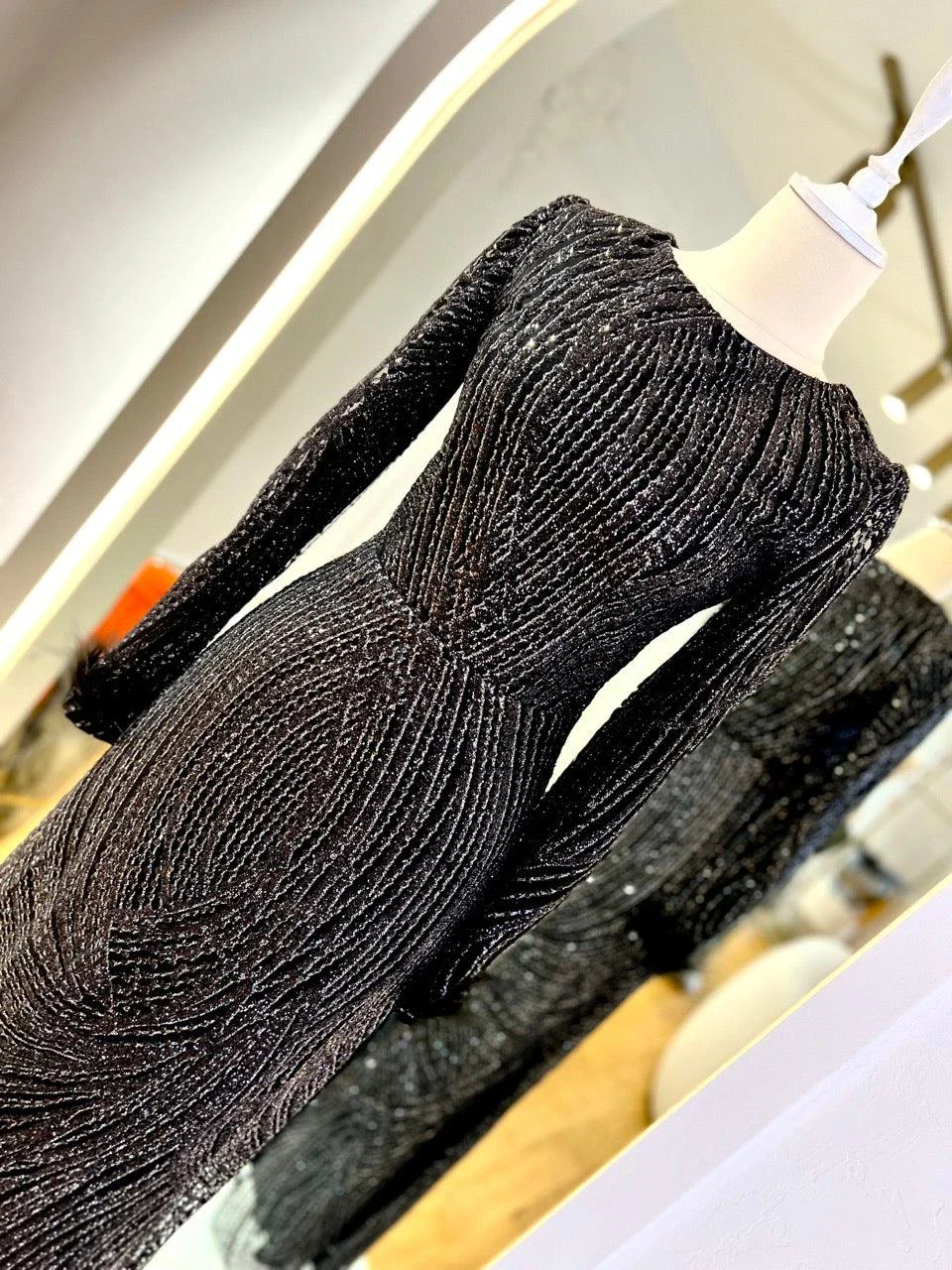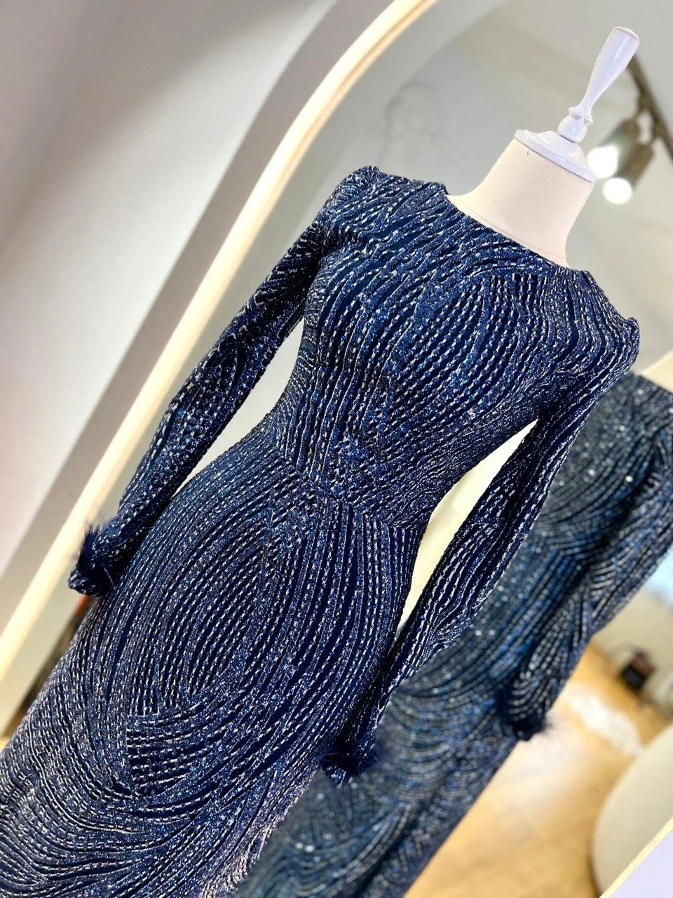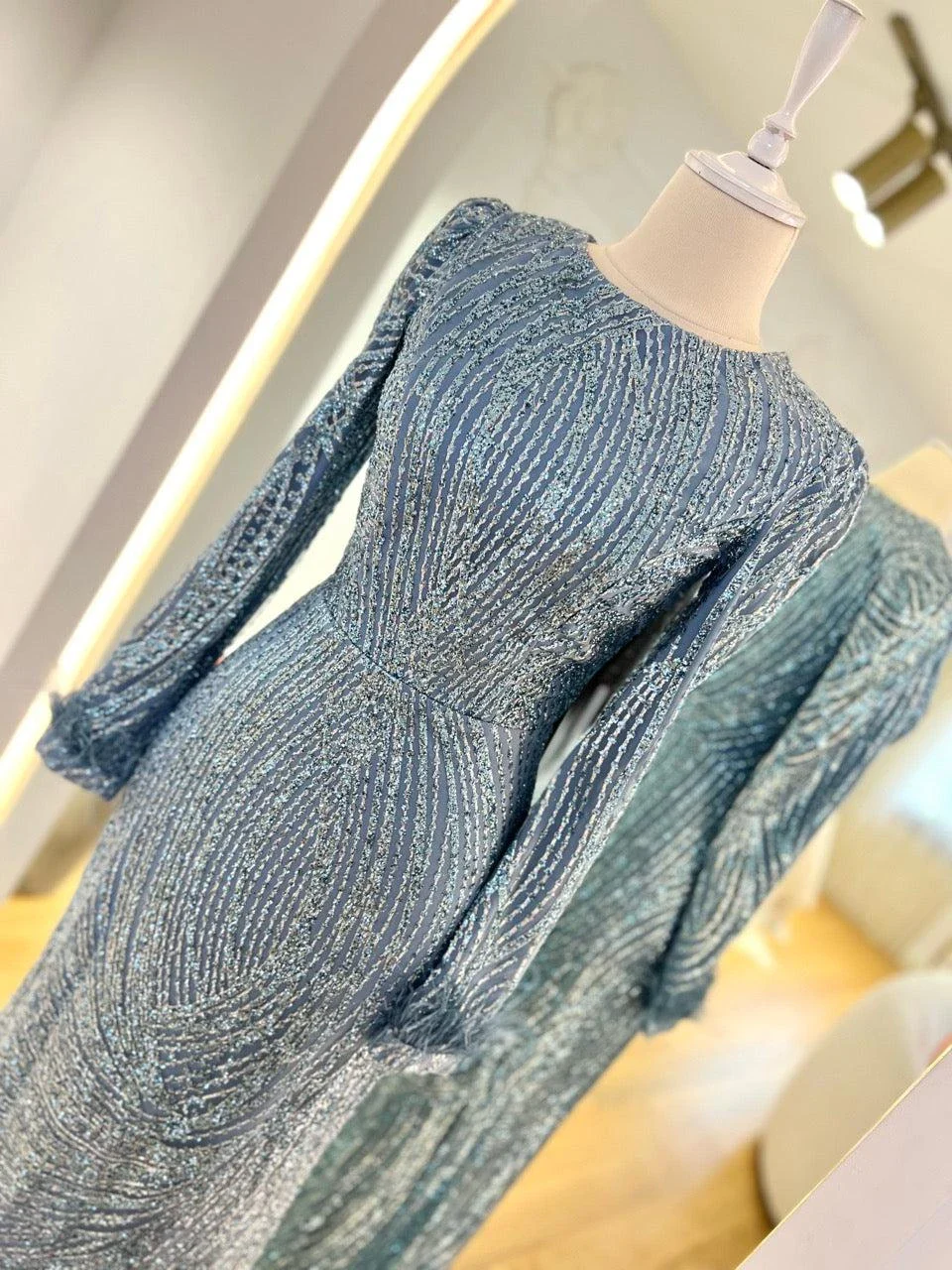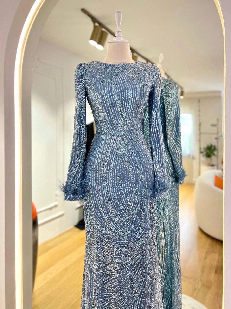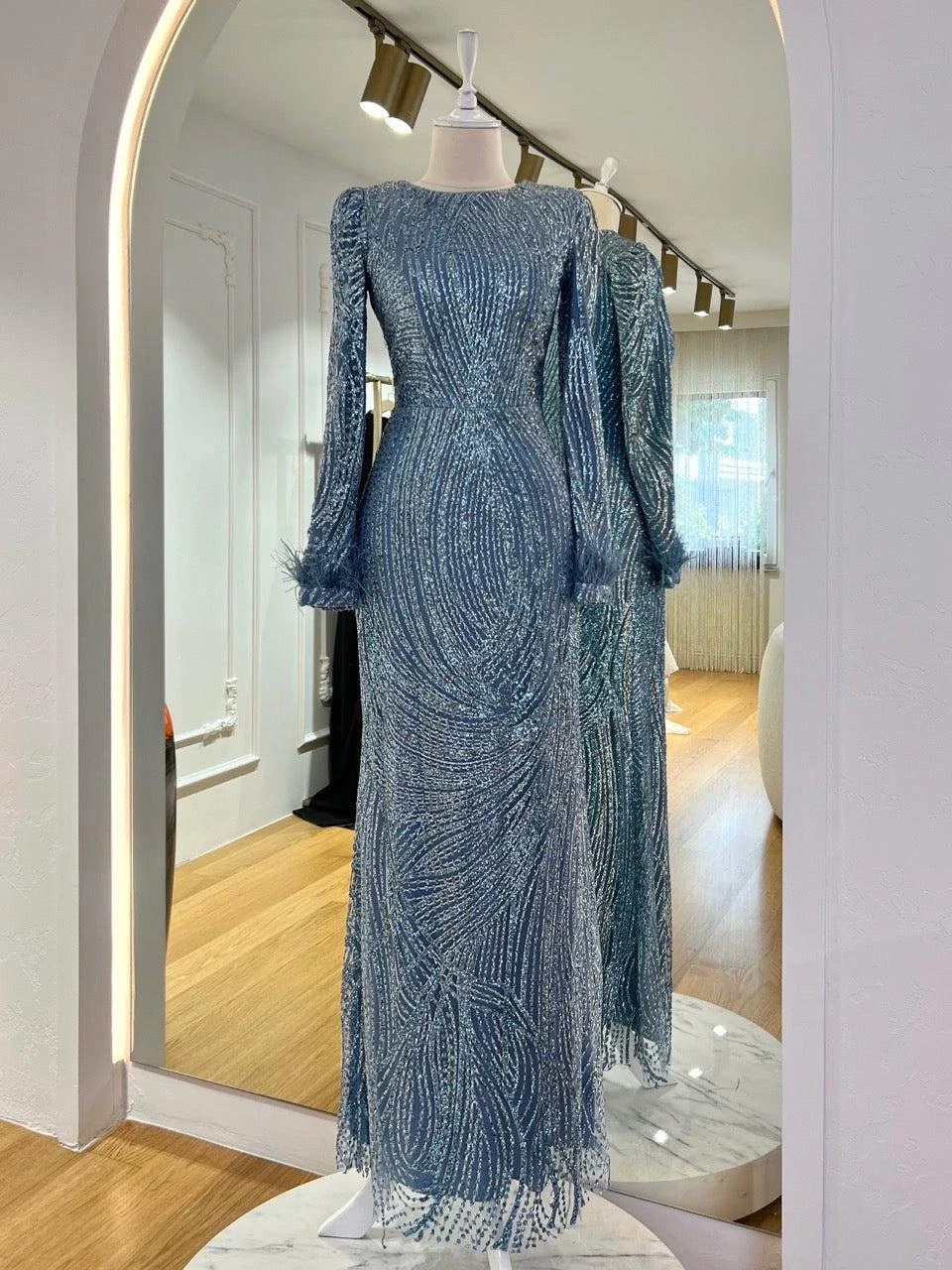 The Lilyana Modest Evening Dress is designed to fit true to size and has a length of 155 cm. Crafted from glitter fabric, this dress includes a lining for added comfort. It features a pencil silhouette with a high-waist skirt and is equipped with a back zipper for easy wear. The cuffs are adorned with non-detachable feather details, adding a unique touch to the design. Please note that due to the adhesive nature of the embellishments, some shedding may occur, but this will not affect the overall appearance of the dress.