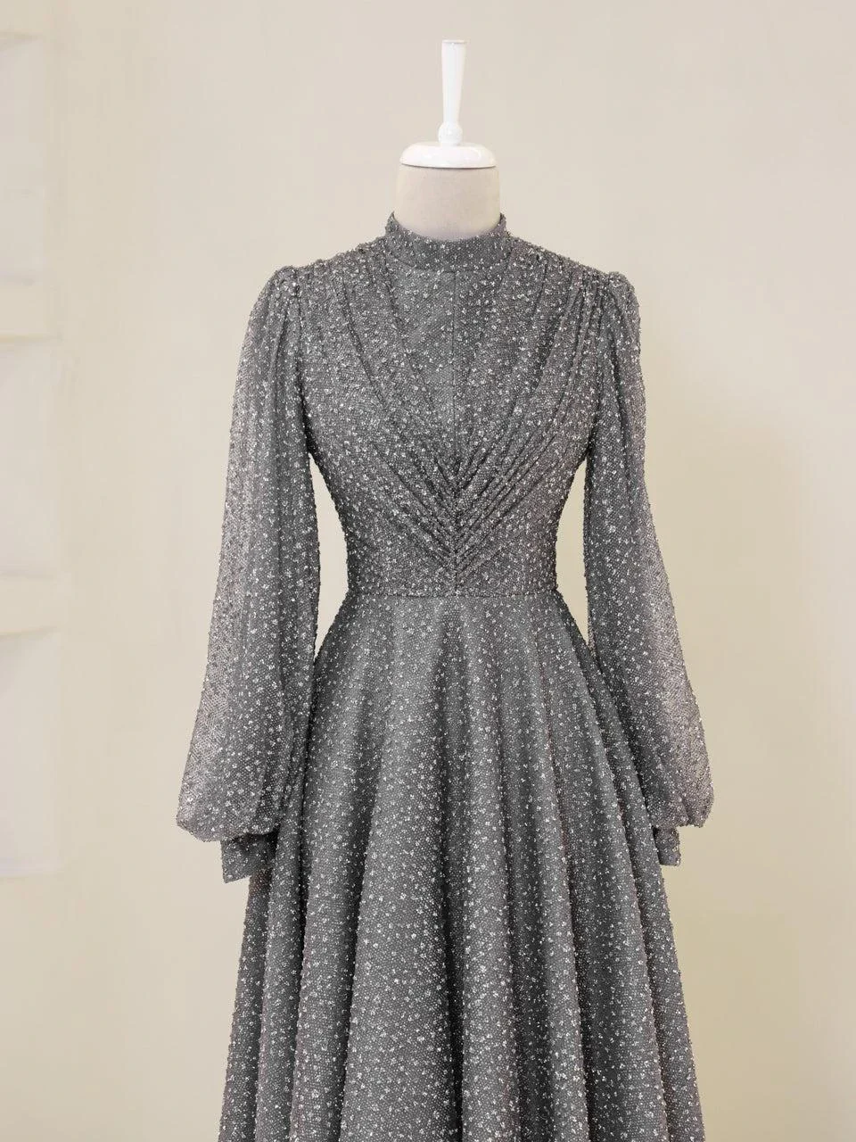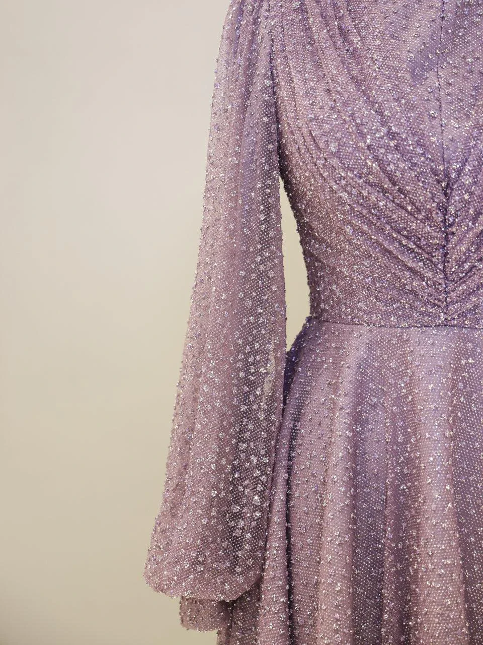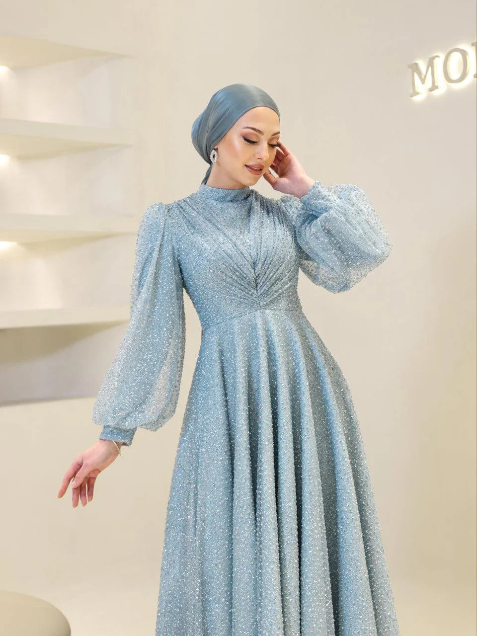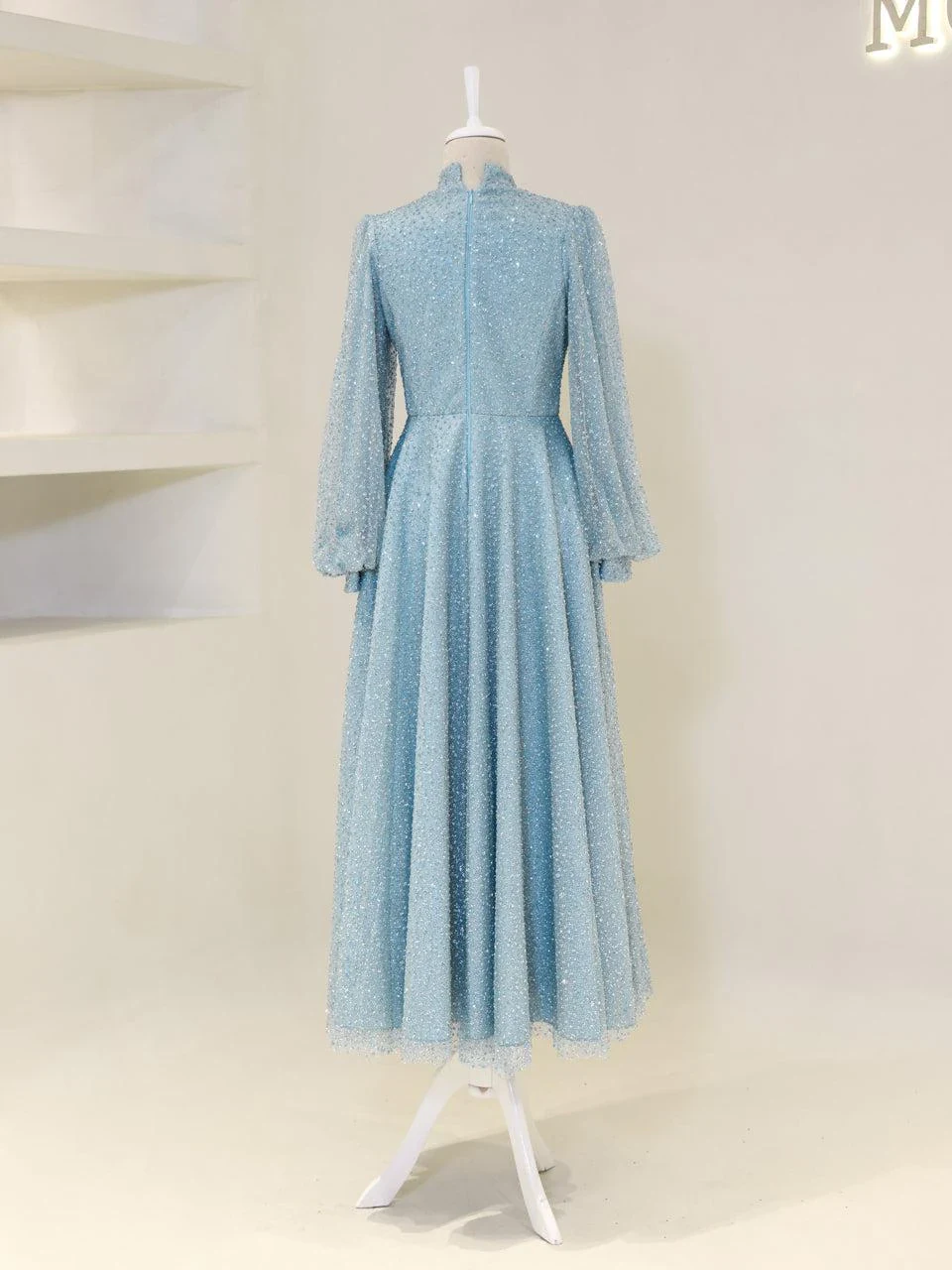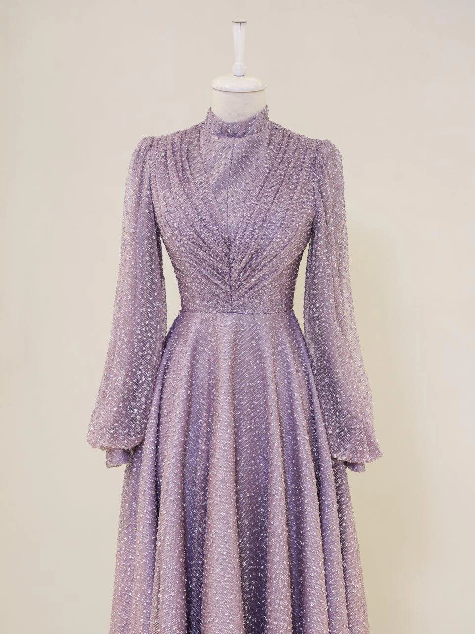 The Linda Modest Evening Dress is designed with a full fit and an average length of 145 cm. It features tulle fabric and includes a built-in chest pad for comfort. The dress is adorned with glued embellishments and has a back zipper closure. It is fully lined and comes with balloon sleeves, offering an A-line skirt form. Please note that due to the glittery nature of the embellishments, some shedding may occur, but it will not affect the overall appearance of the dress.