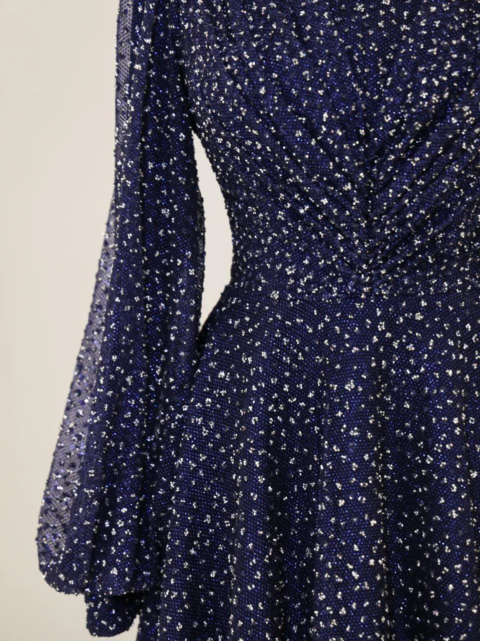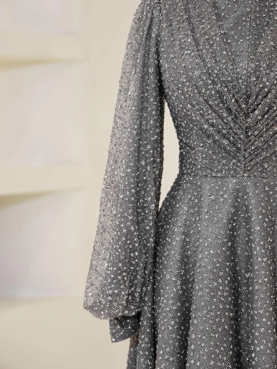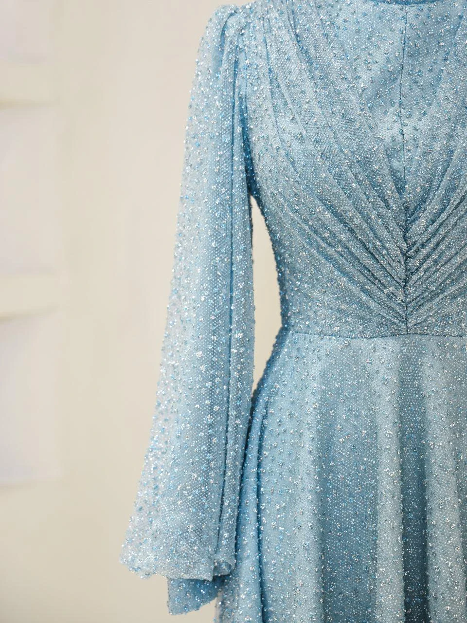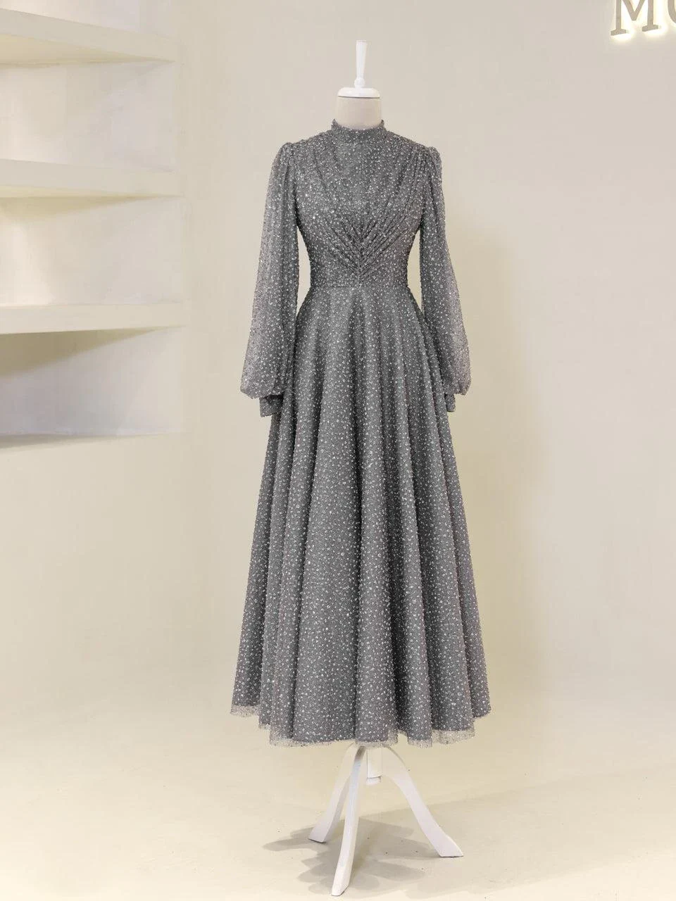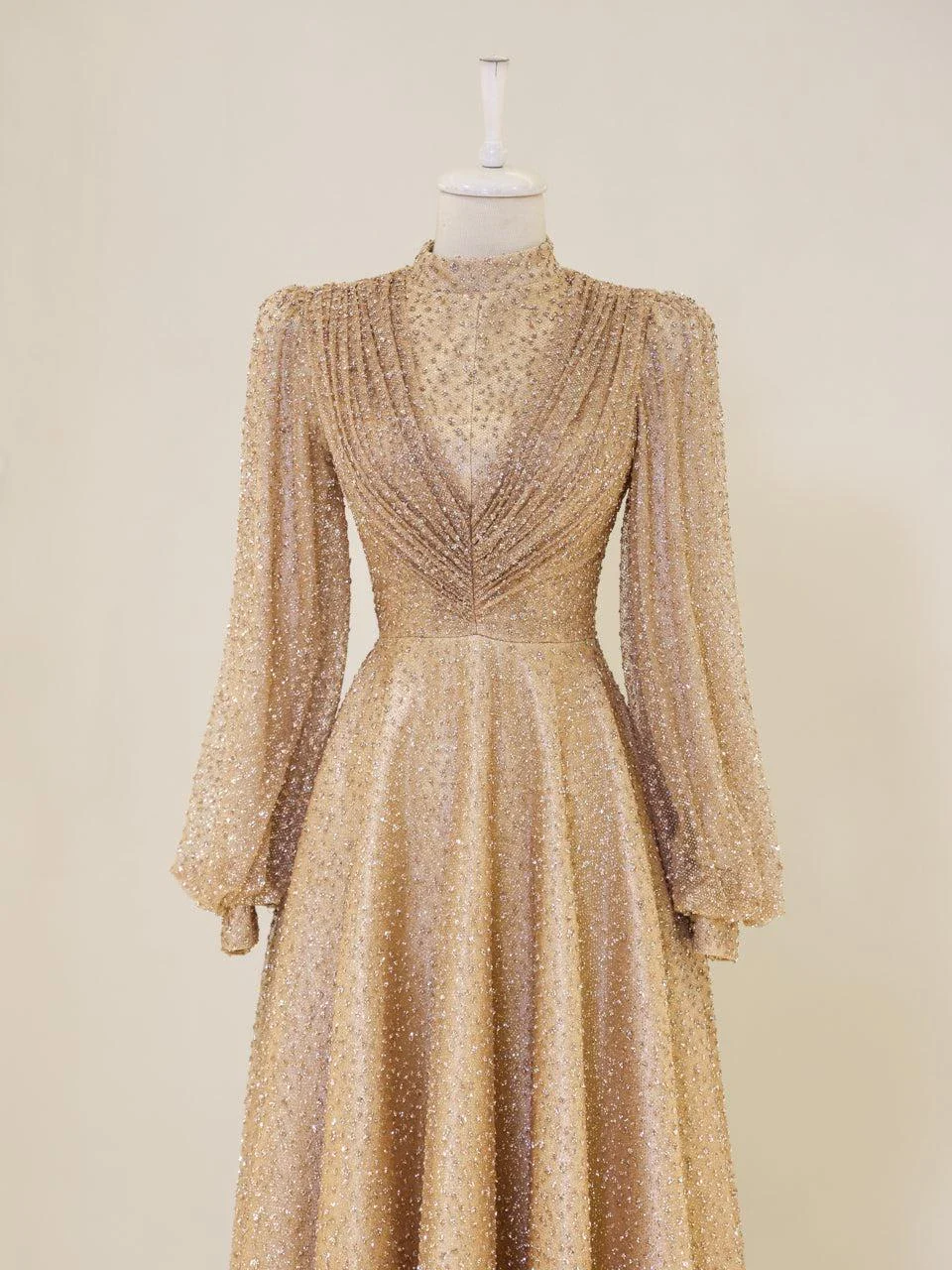The Linda Modest Evening Dress is designed with a full fit and an average length of 145 cm. It features tulle fabric and includes a built-in chest pad for comfort. The dress is adorned with glued embellishments and has a back zipper closure. It is fully lined and comes with balloon sleeves, offering an A-line skirt form. Please note that due to the glittery nature of the embellishments, some shedding may occur, but it will not affect the overall appearance of the dress.