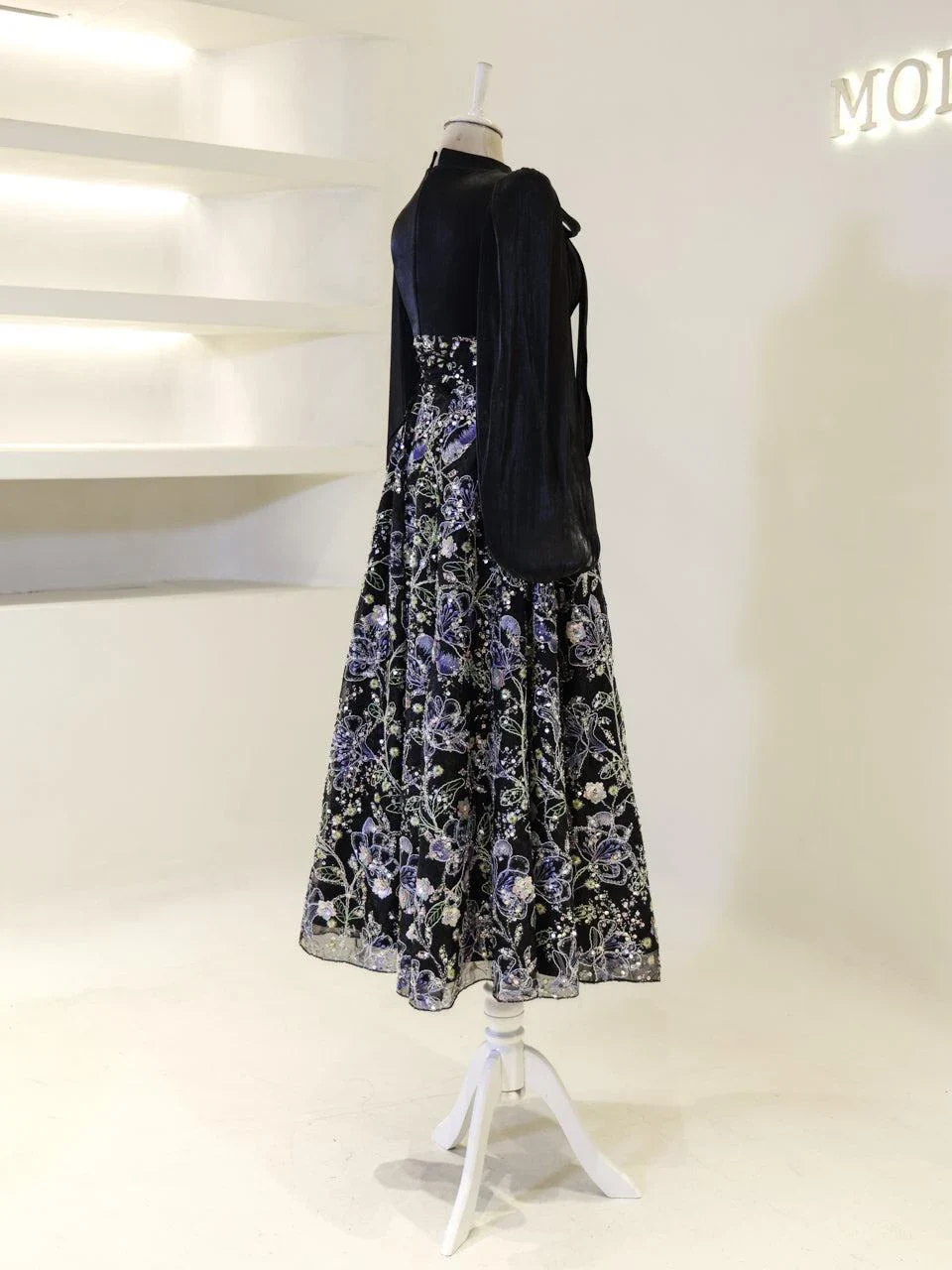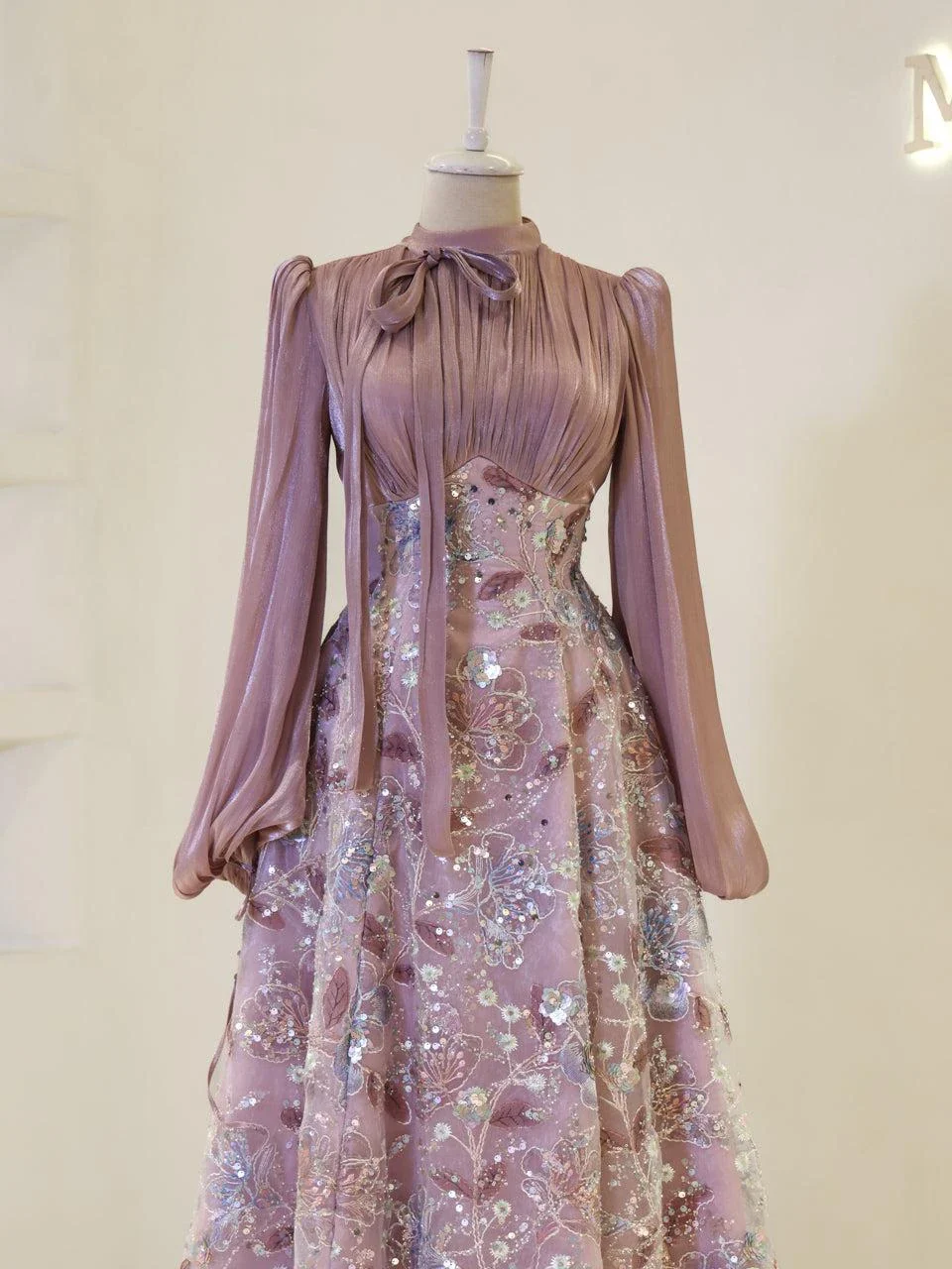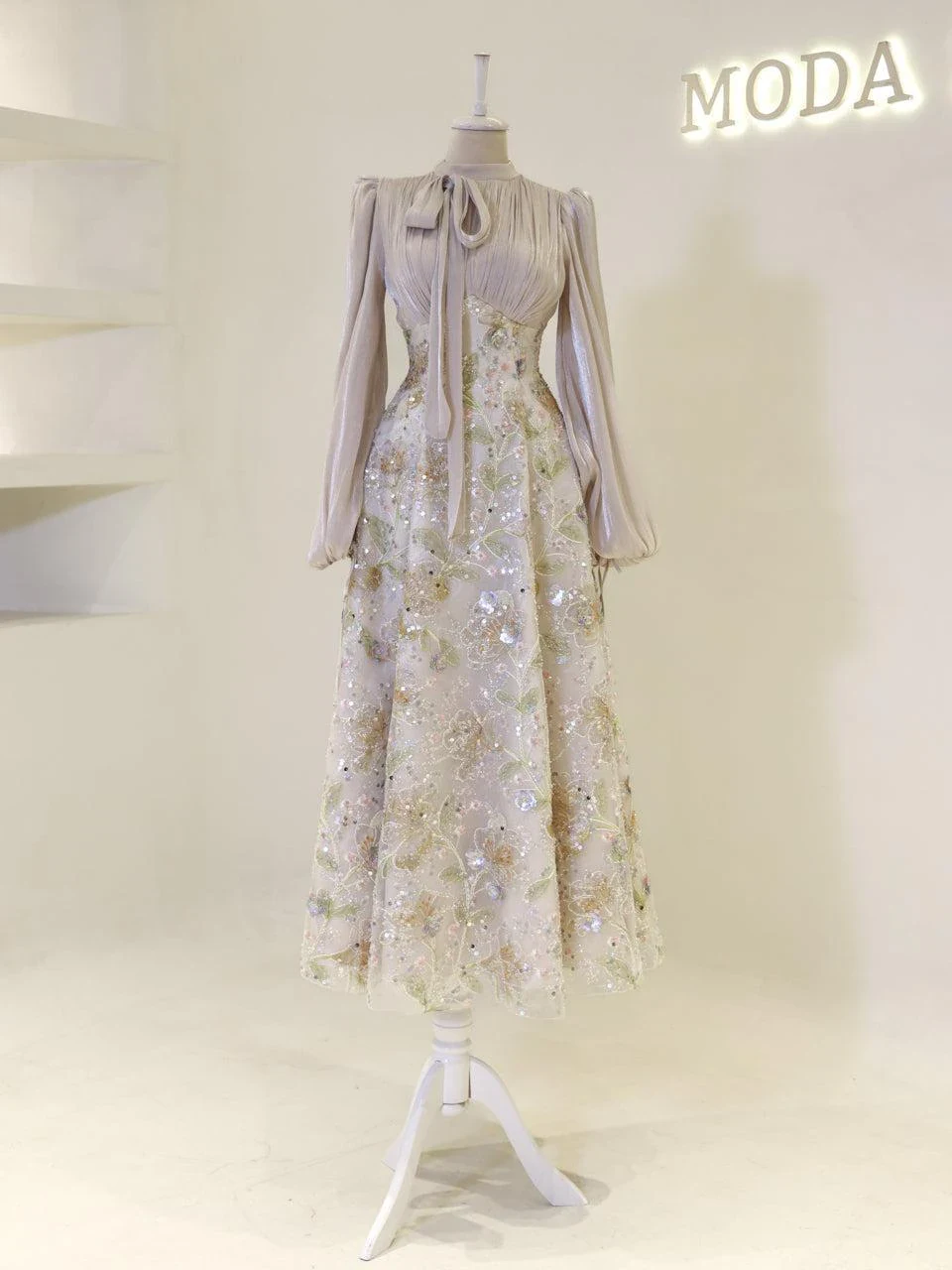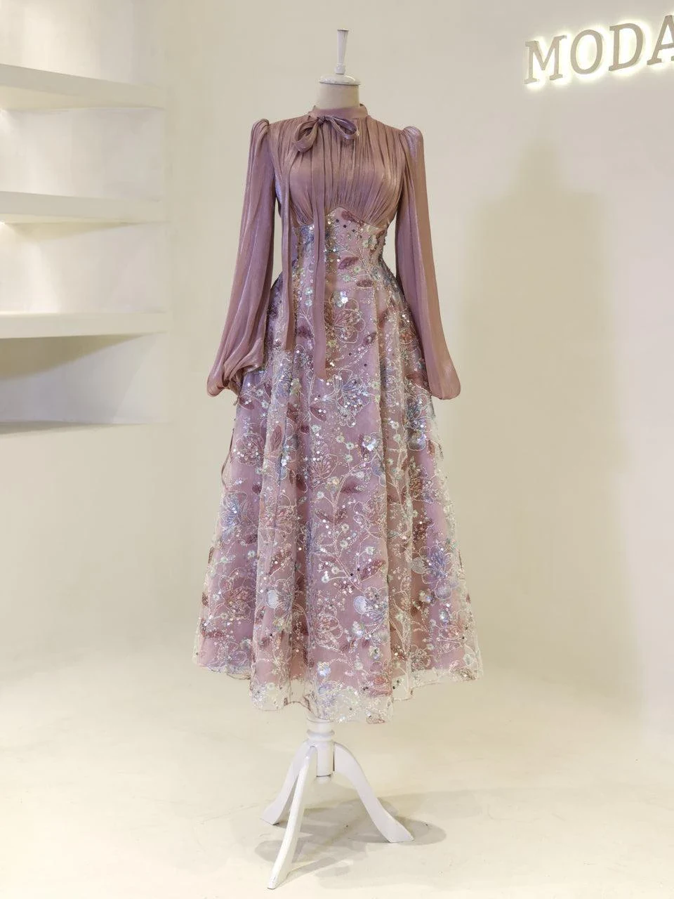 The Lisbonne Modest Evening Dress is designed for a perfect fit, with an average length of 145 cm. The dress features an orchid fabric on the upper part and an embroidered fabric on the lower part, providing a sophisticated look. It is fully lined and includes a back zipper and lacing for a secure fit. The dress is equipped with a chest pad and has balloon sleeves. The embroidery is sewn, not glued, ensuring durability. The dress has a flared skirt form, offering elegance and comfort. This special design is available in limited stock, and exchanges or returns are not accepted. For size and measurement inquiries, please contact us.