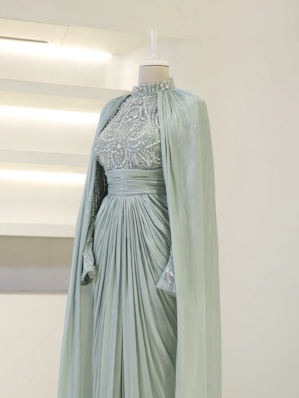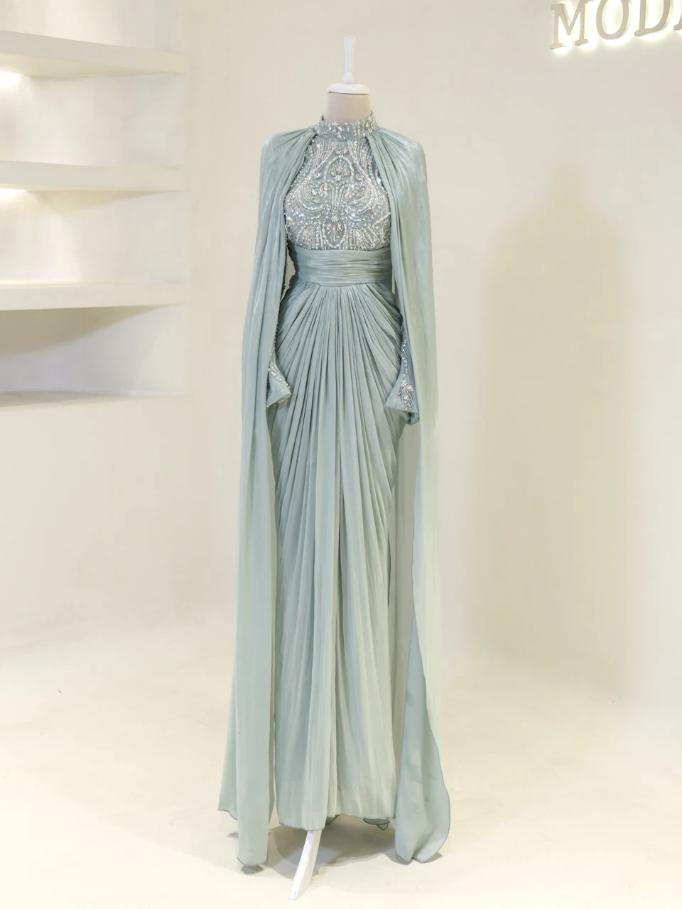 The Lobelia Modest Evening Dress offers a precise fit with a front length of 150 cm and a back length extending an additional 15 cm. Crafted from orchid fabric, this dress features a rear zipper closure and includes a chest pad for added comfort. It is fully lined and showcases a cape detail that flows from the shoulders to the hem. The embellishments are securely attached, ensuring durability. The dress has a straight skirt form, providing a sleek silhouette.