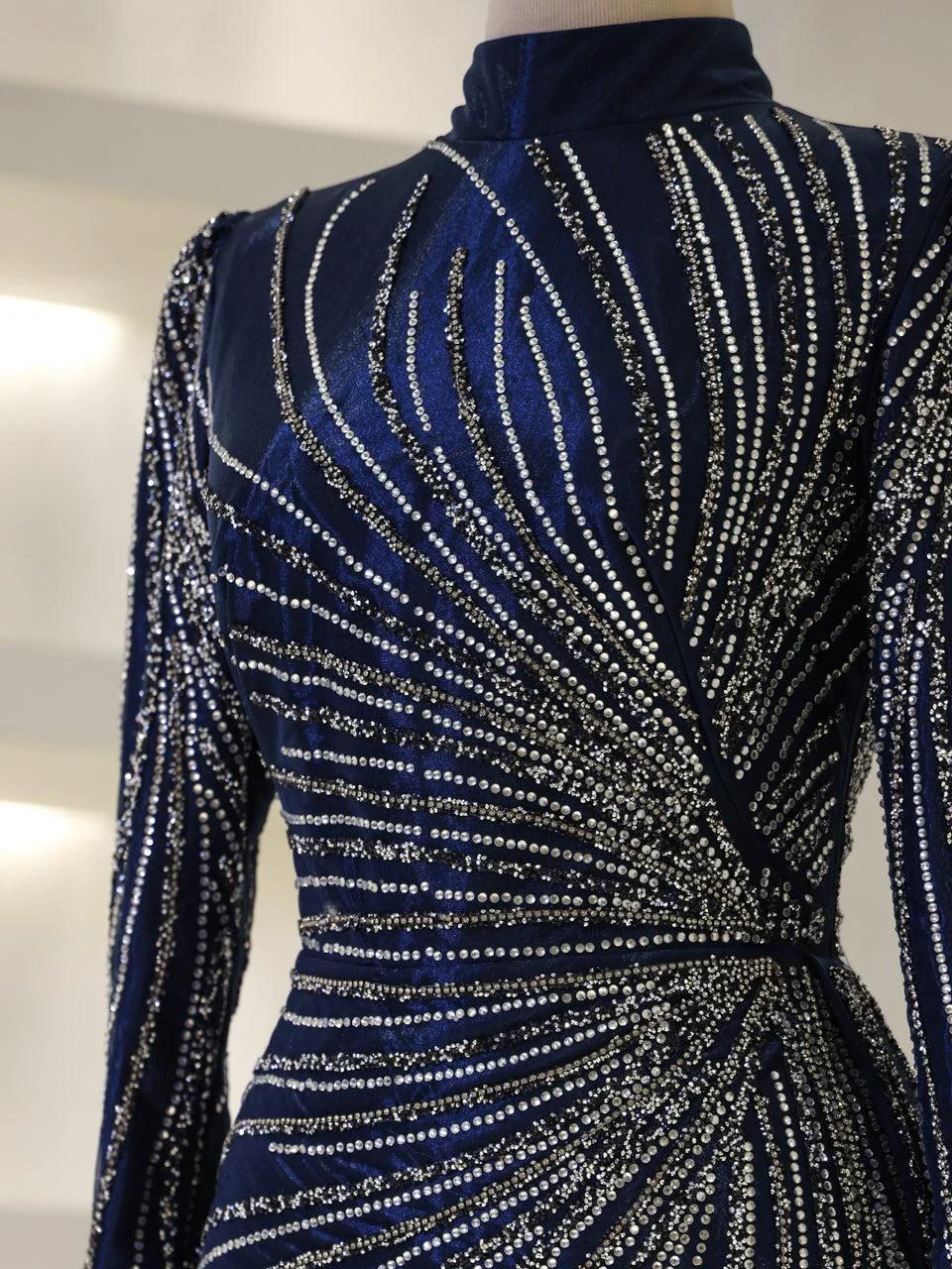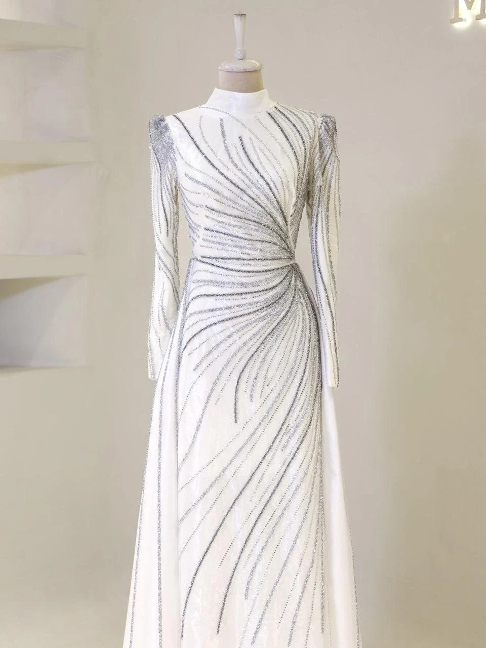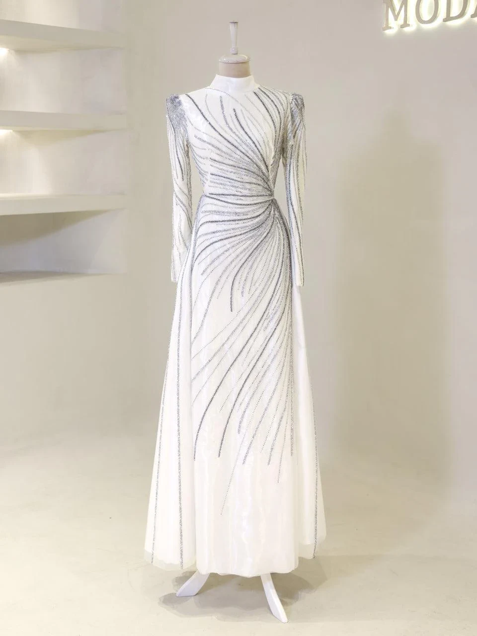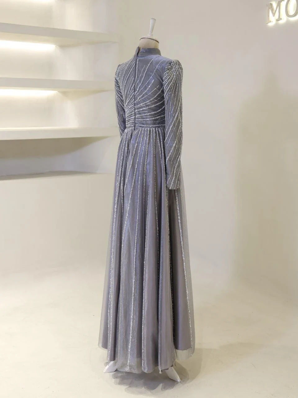 The Maika Modest Evening Dress is designed to offer a flattering fit with its full-length 155 cm design. Made from tulle fabric, this dress does not include a chest pad but is fully lined for comfort. It features a zipper closure at the back and a cape-style detail on the rear skirt, which is not detachable. The embellishments are adhesively applied, and while some shedding may occur, it will not affect the overall appearance of the dress.
