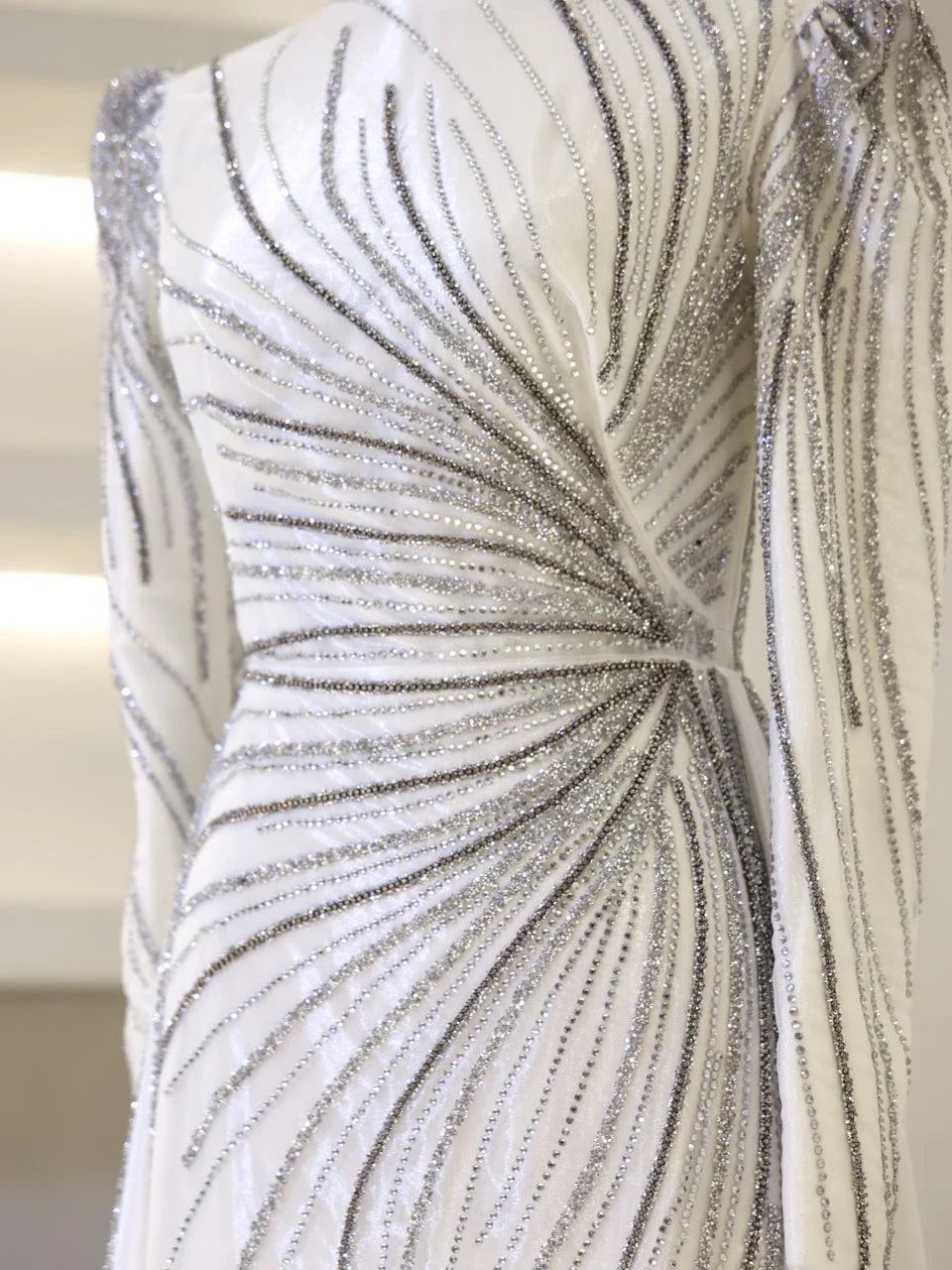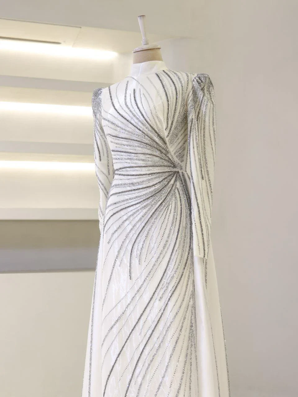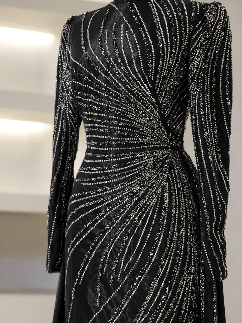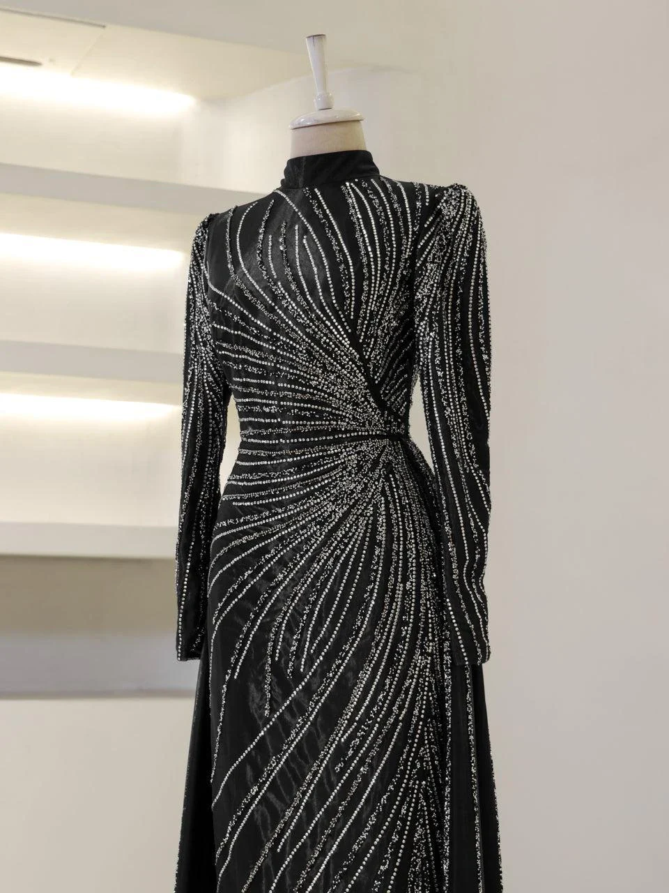 The Maika Modest Evening Dress is designed to offer a flattering fit with its full-length 155 cm design. Made from tulle fabric, this dress does not include a chest pad but is fully lined for comfort. It features a zipper closure at the back and a cape-style detail on the rear skirt, which is not detachable. The embellishments are adhesively applied, and while some shedding may occur, it will not affect the overall appearance of the dress.