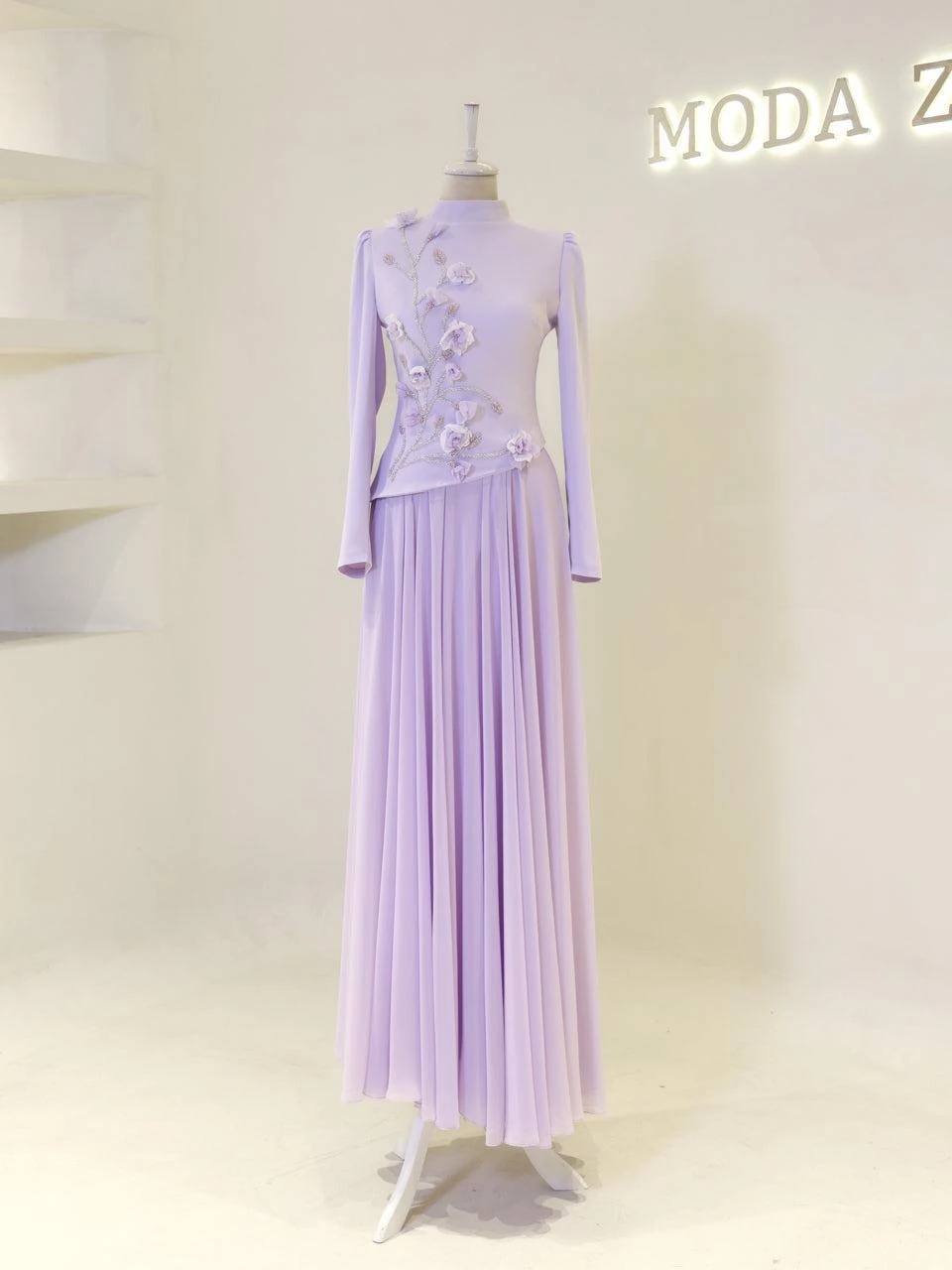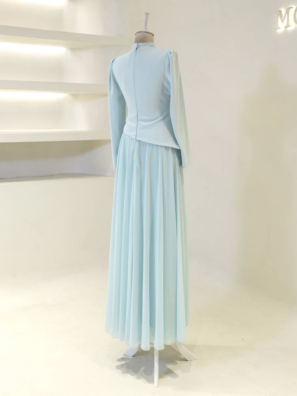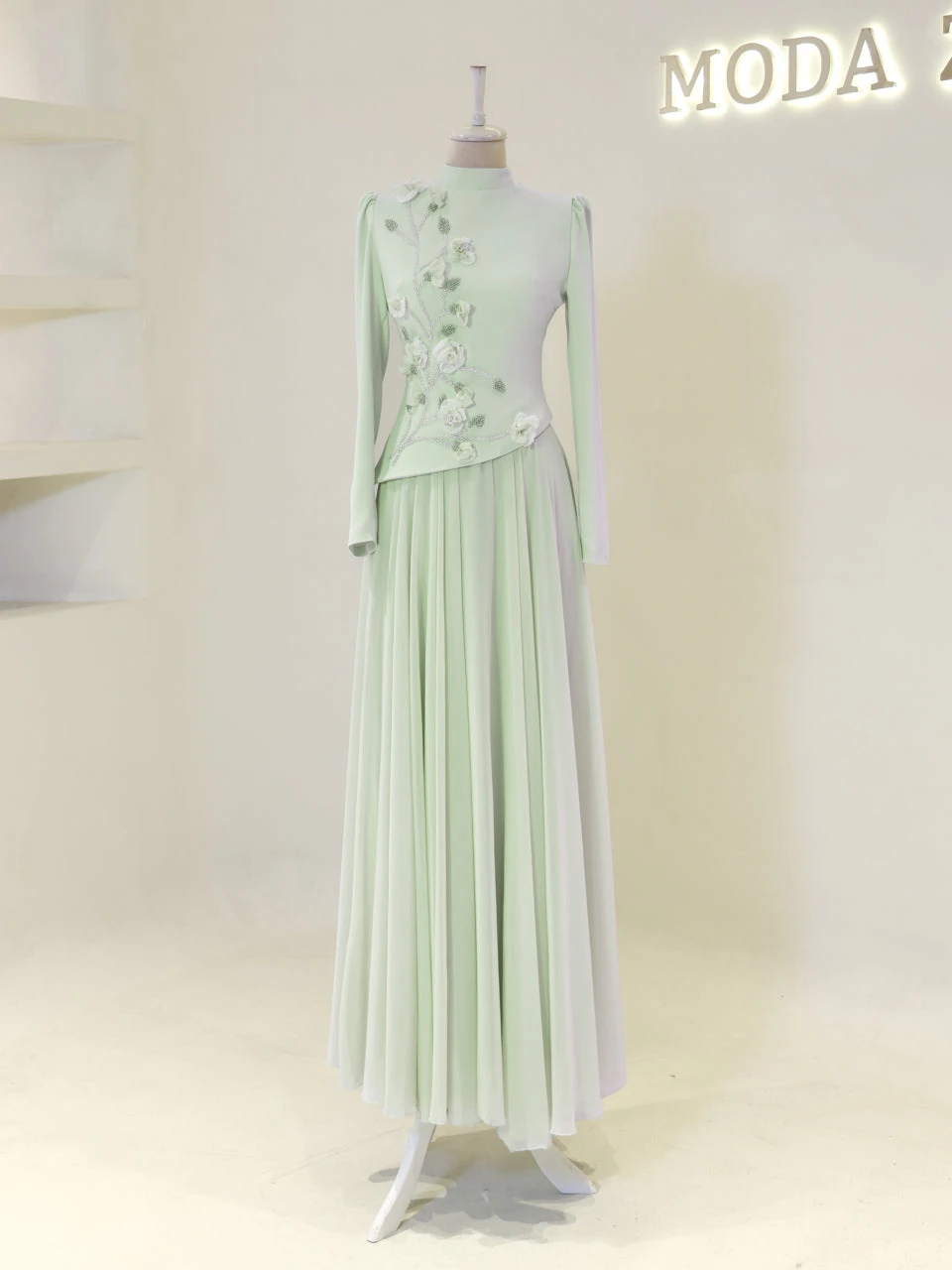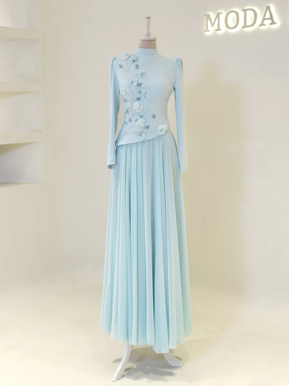 The Maral Modest Evening Dress is designed for a full-size fit and measures approximately 155 cm in length. It is crafted with a chiffon lower section and a crepe upper section, providing a sophisticated look. The dress is fully lined and includes a back zipper for easy wear. It is equipped with a built-in chest pad for added comfort. The embellishments are securely attached, not glued, ensuring durability. The dress has a flared skirt design, adding elegance to its overall style.