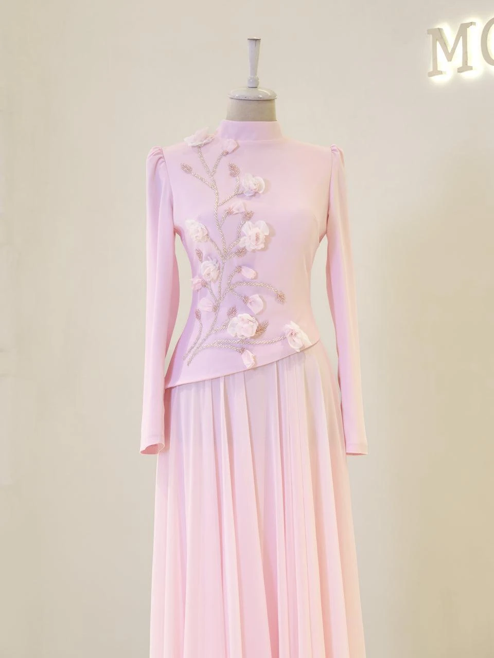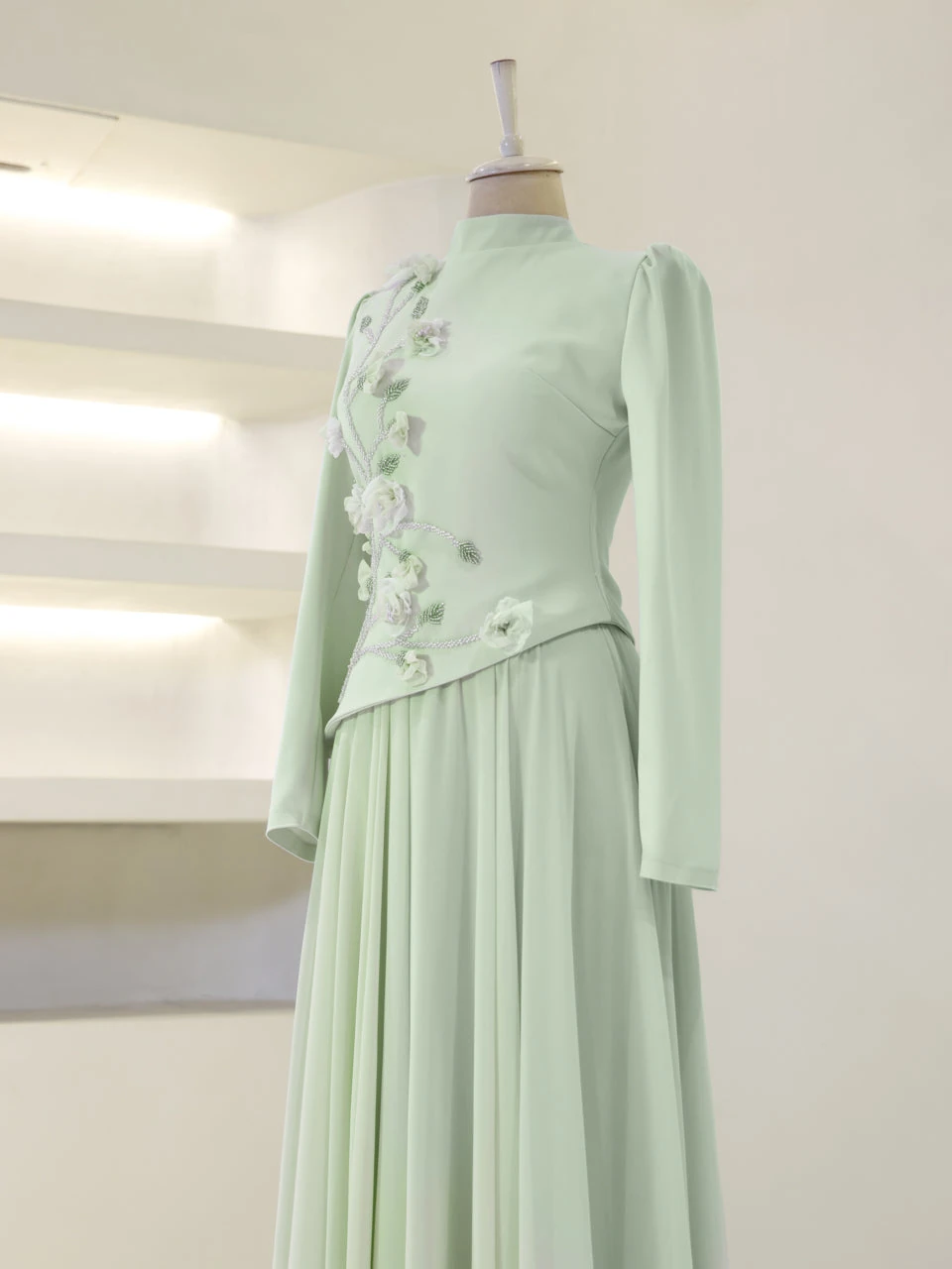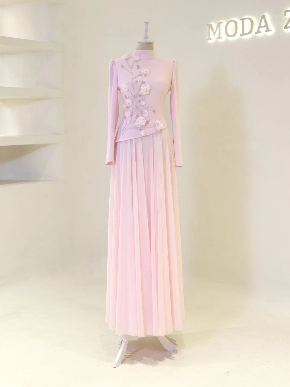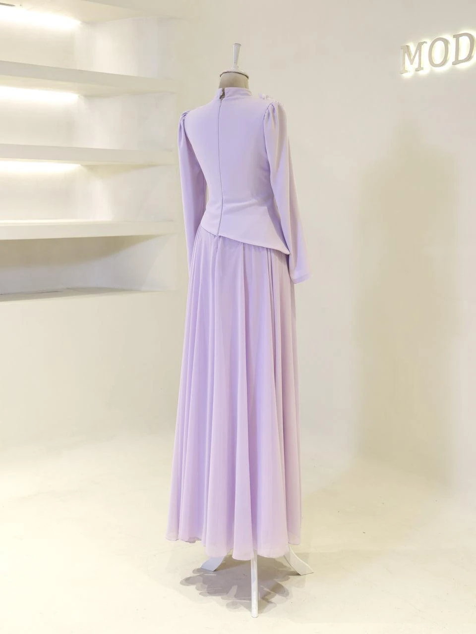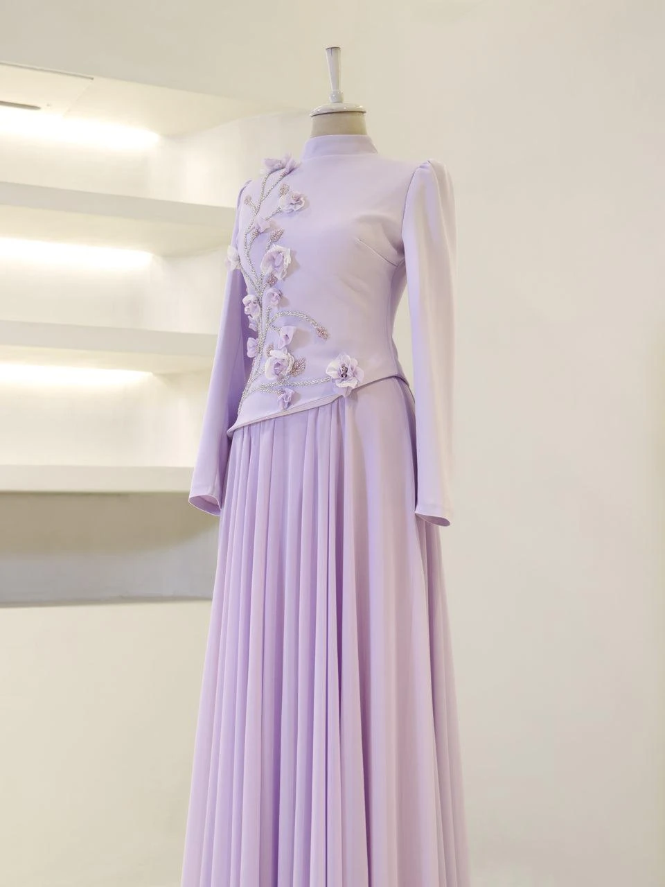 The Maral Modest Evening Dress is designed for a full-size fit and measures approximately 155 cm in length. It is crafted with a chiffon lower section and a crepe upper section, providing a sophisticated look. The dress is fully lined and includes a back zipper for easy wear. It is equipped with a built-in chest pad for added comfort. The embellishments are securely attached, not glued, ensuring durability. The dress has a flared skirt design, adding elegance to its overall style.