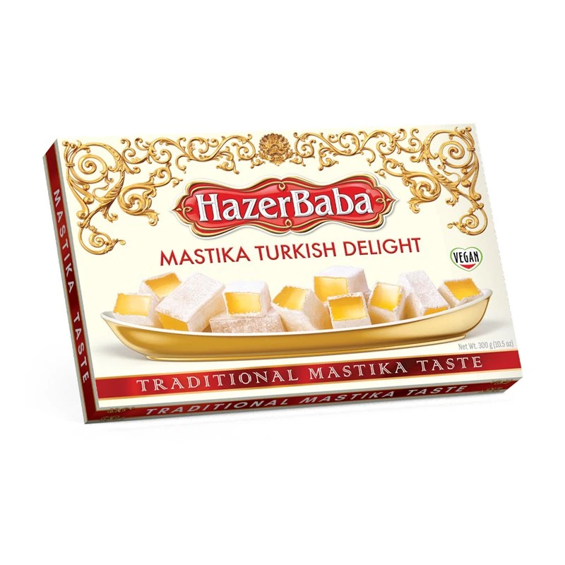 This Mastic Flavored Turkish Delight is a traditional sweet treat made with sugar, corn starch, water, and a natural mastic aroma. It contains 0.2% mastic and is enhanced with citric acid as an acidity regulator. This product may contain traces of other nuts, gluten, sesame, sulfur dioxide, milk, and dairy products. Proudly made in Turkey.