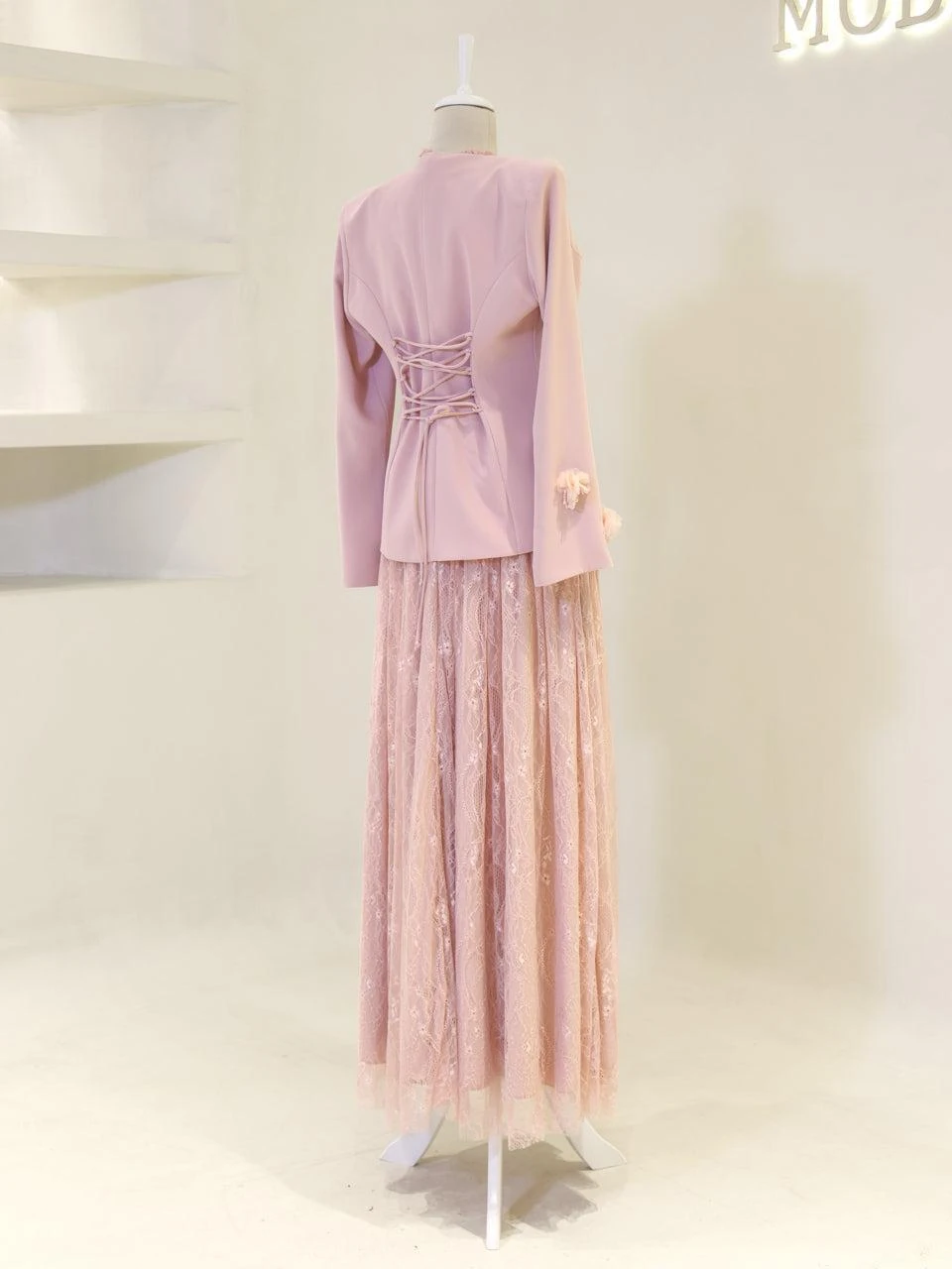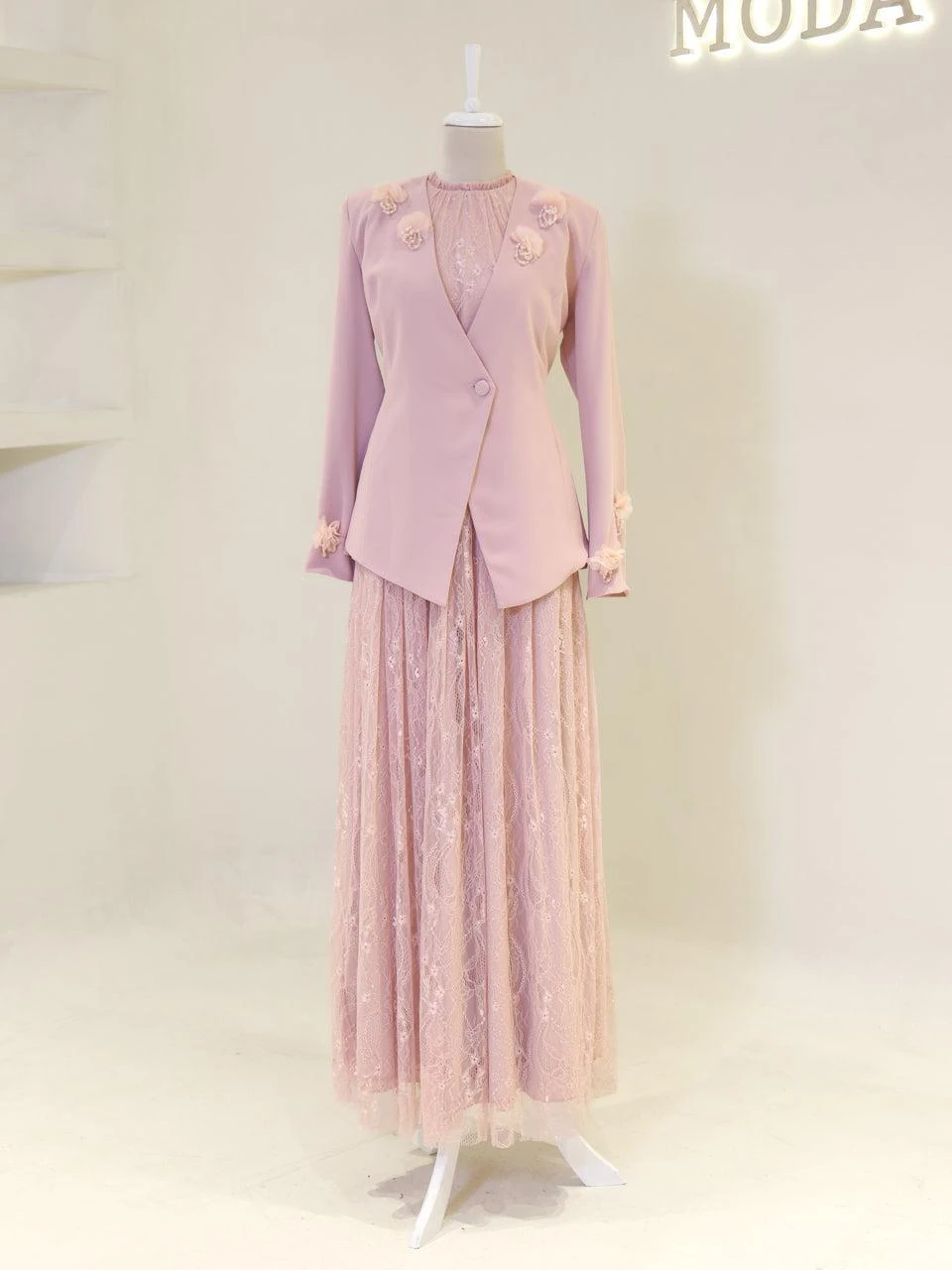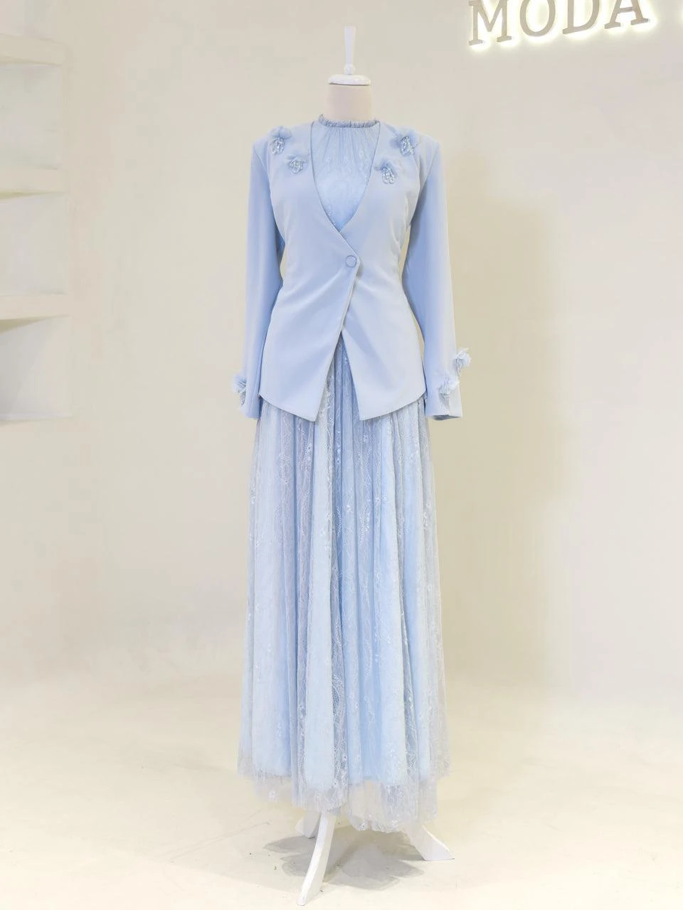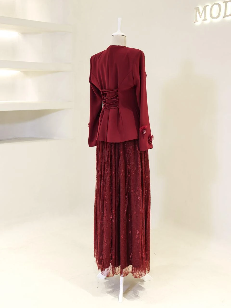 The Maxine Modest Outfit Set is crafted to offer both style and comfort. The set includes a lace inner dress and a crepe jacket. The inner dress is equipped with a back zipper for easy wear, while the jacket features a detachable design with a lace-up back. The outfit is fully lined and showcases a flared skirt silhouette. The embellishments on the set are securely attached, ensuring durability.