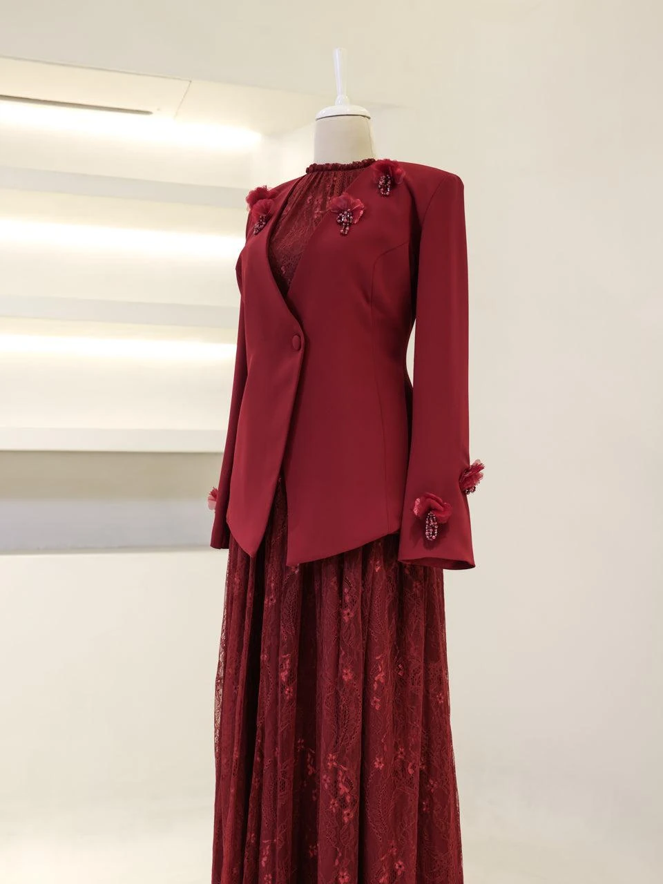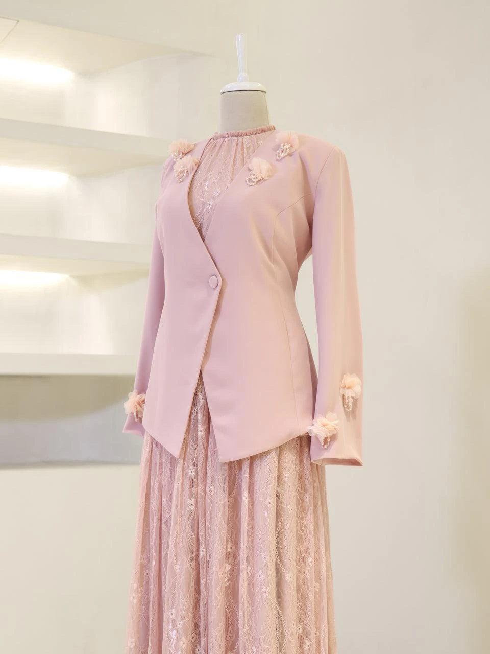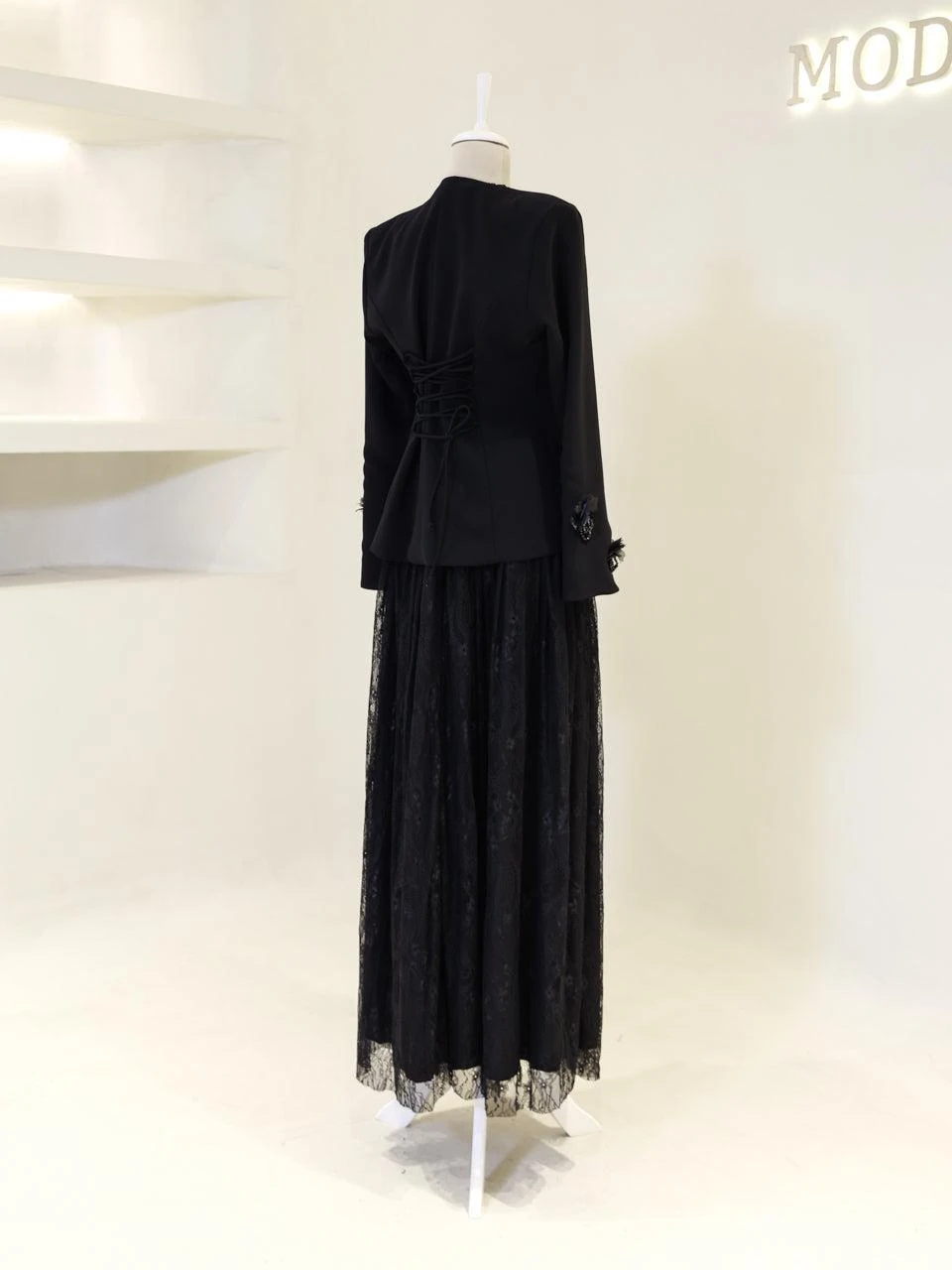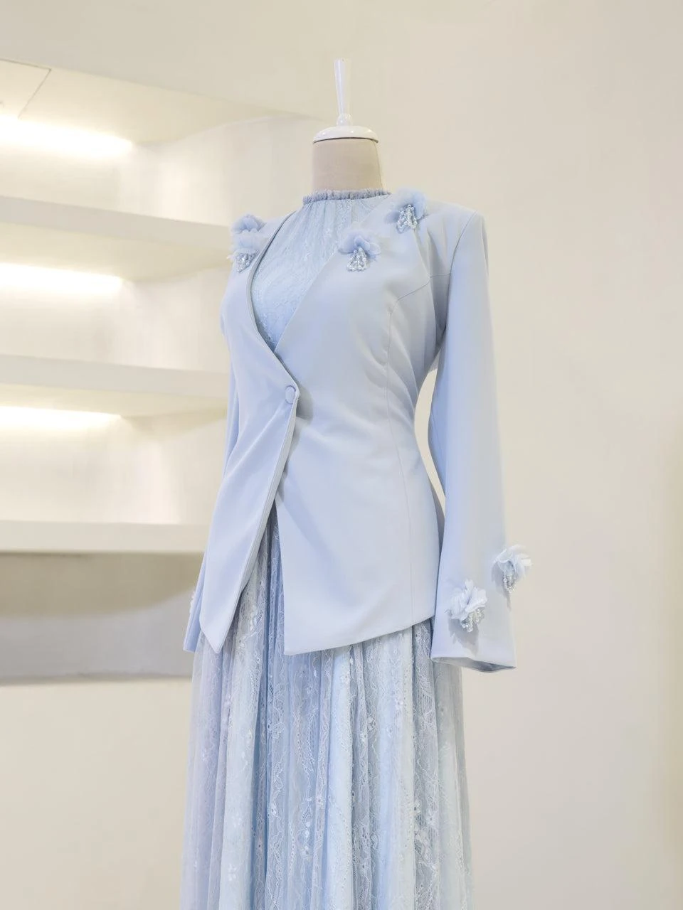 The Maxine Modest Outfit Set is crafted to offer both style and comfort. The set includes a lace inner dress and a crepe jacket. The inner dress is equipped with a back zipper for easy wear, while the jacket features a detachable design with a lace-up back. The outfit is fully lined and showcases a flared skirt silhouette. The embellishments on the set are securely attached, ensuring durability.