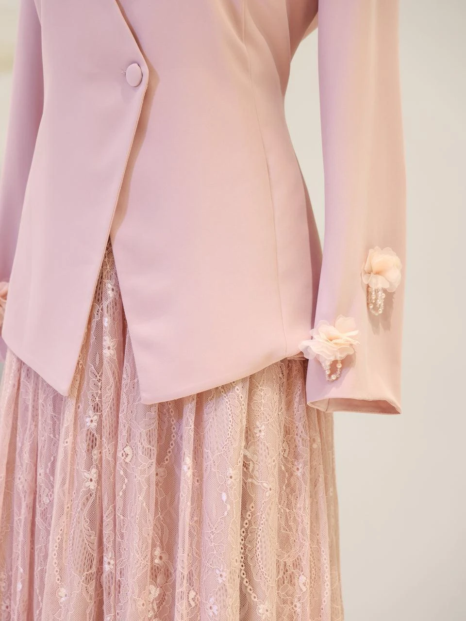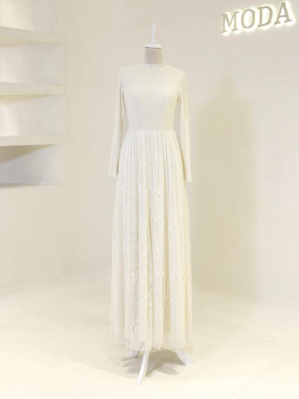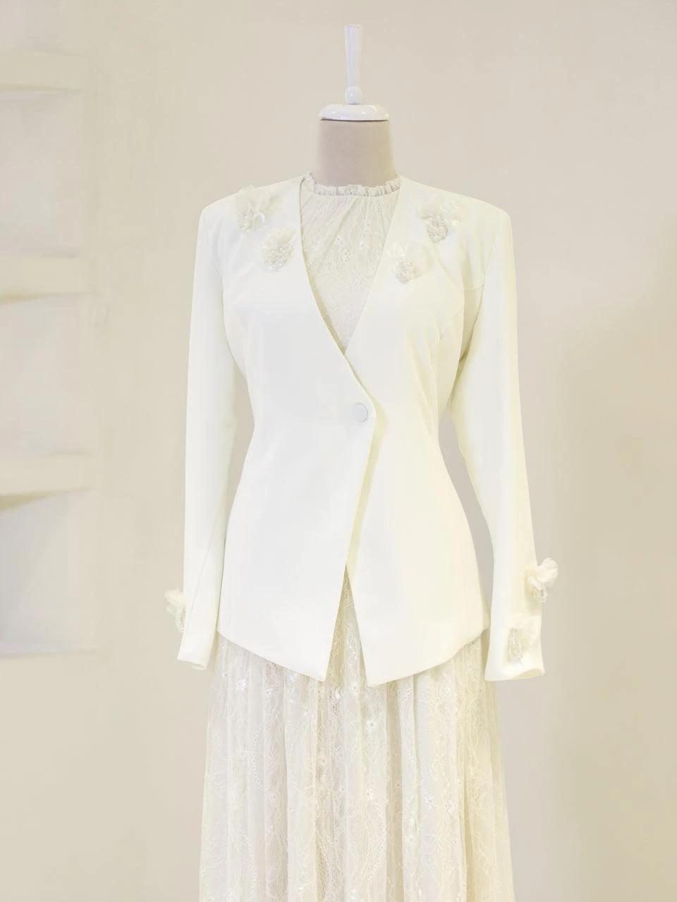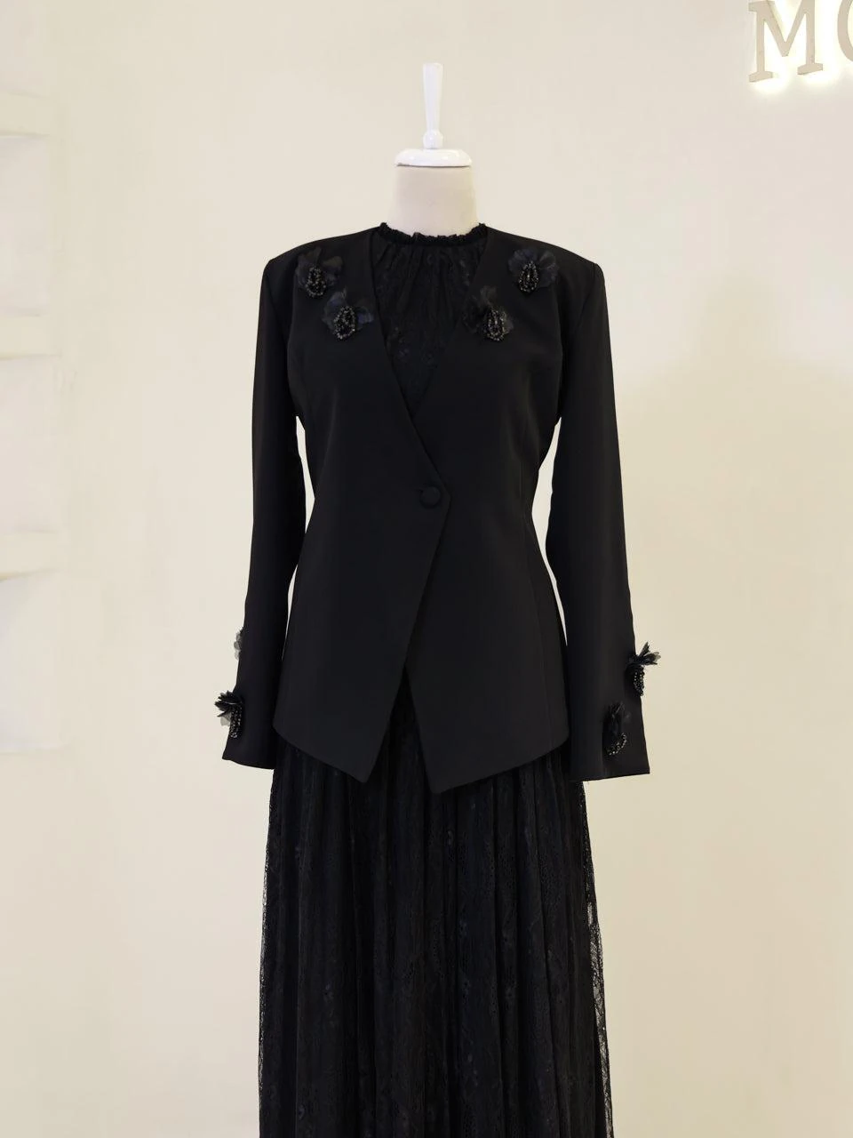 The Maxine Modest Outfit Set is crafted to offer both style and comfort. The set includes a lace inner dress and a crepe jacket. The inner dress is equipped with a back zipper for easy wear, while the jacket features a detachable design with a lace-up back. The outfit is fully lined and showcases a flared skirt silhouette. The embellishments on the set are securely attached, ensuring durability.