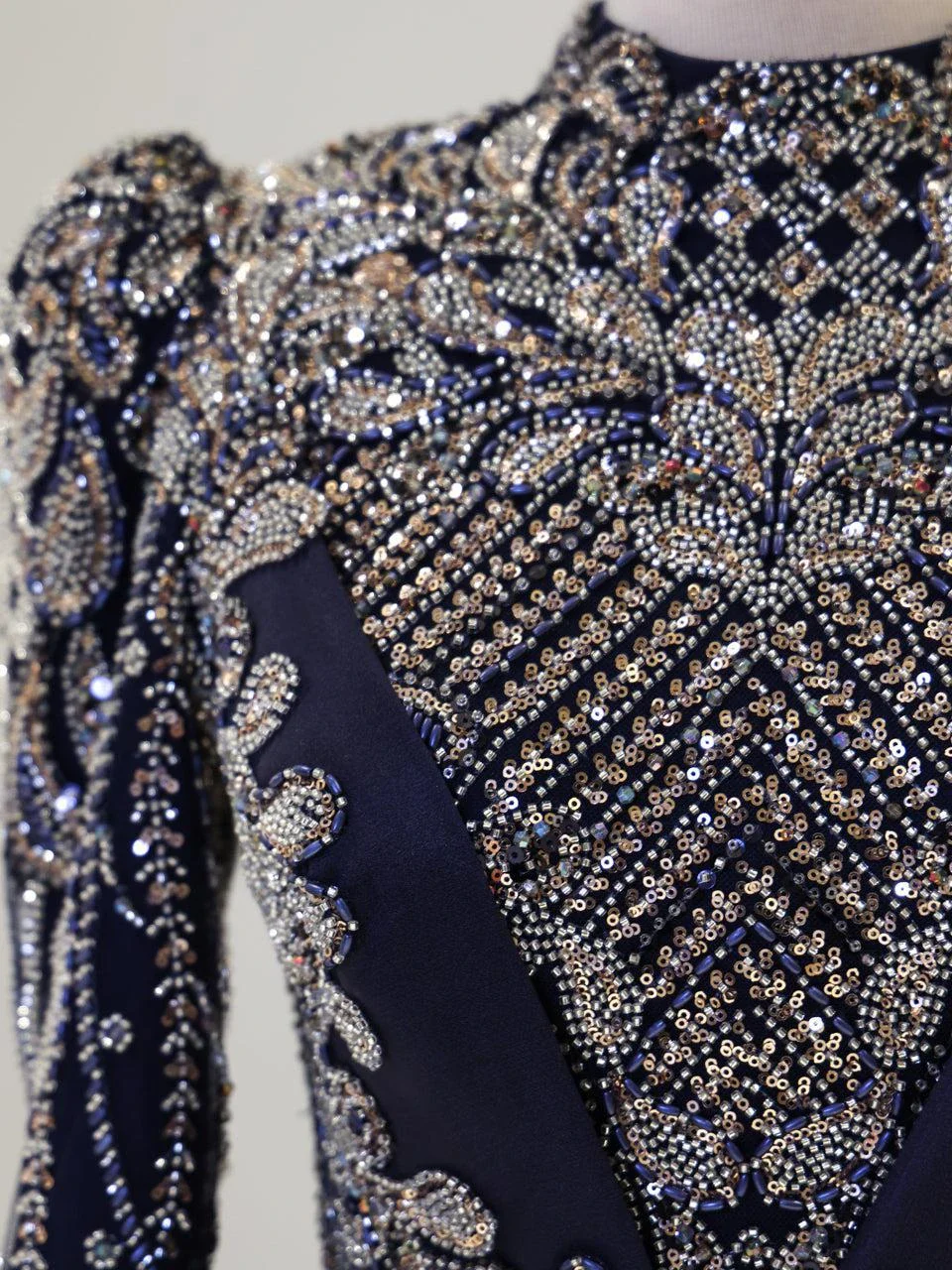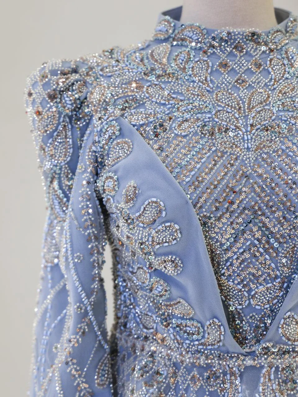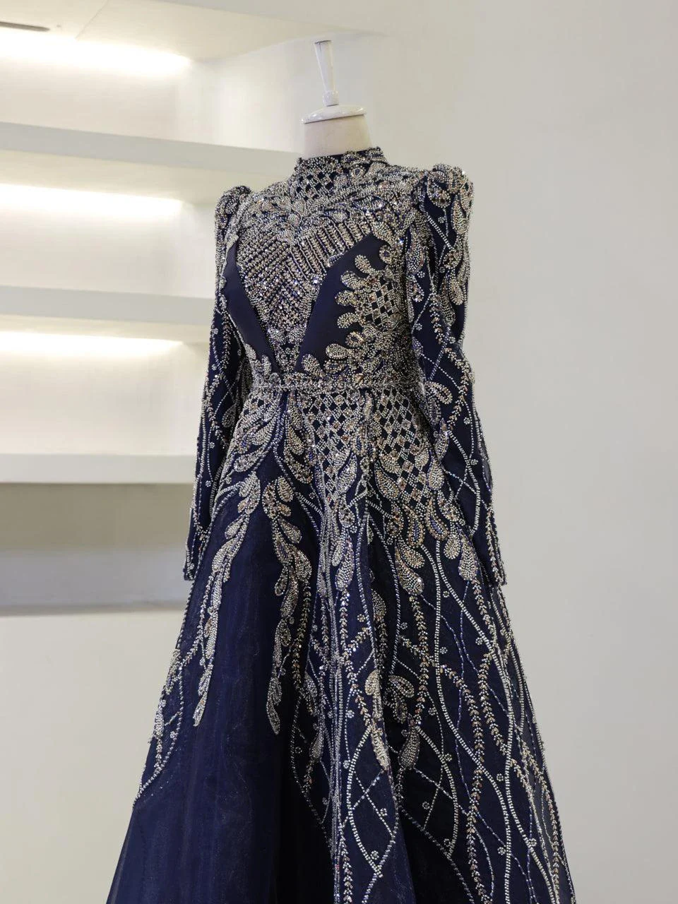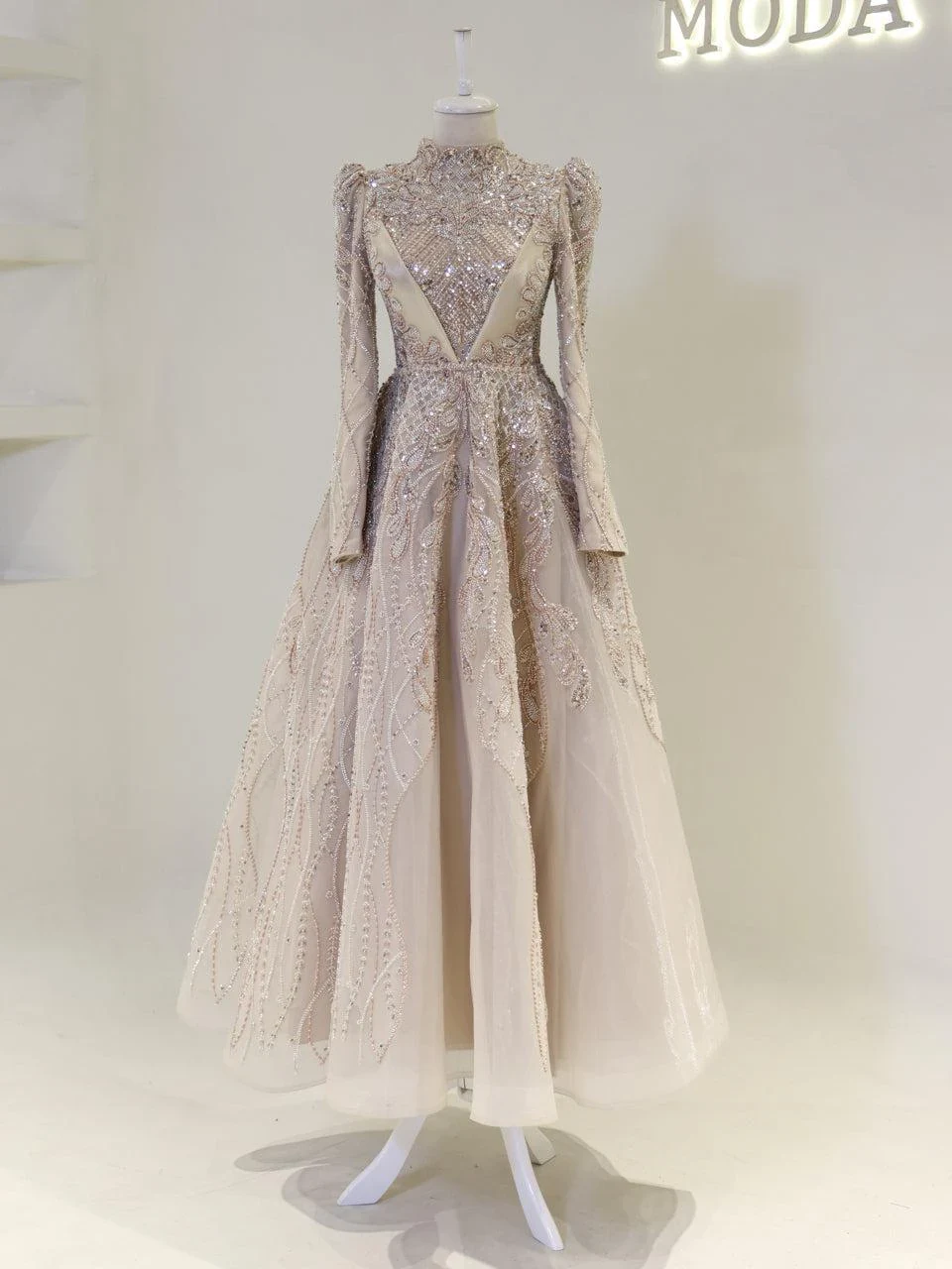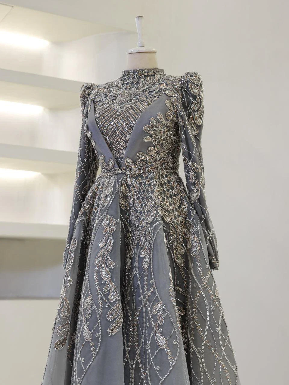 The Mayda Modest Evening Dress is crafted with precision, featuring a standard fit and an average length of 145 cm. Made from tulle fabric, it includes a lining for added comfort. The dress is designed with a voluminous skirt, enhancing its elegant appearance. It is adorned with glued embellishments, which may experience minor shedding that will not affect the overall look of the dress. The preparation time for this dress is 5-7 days.
