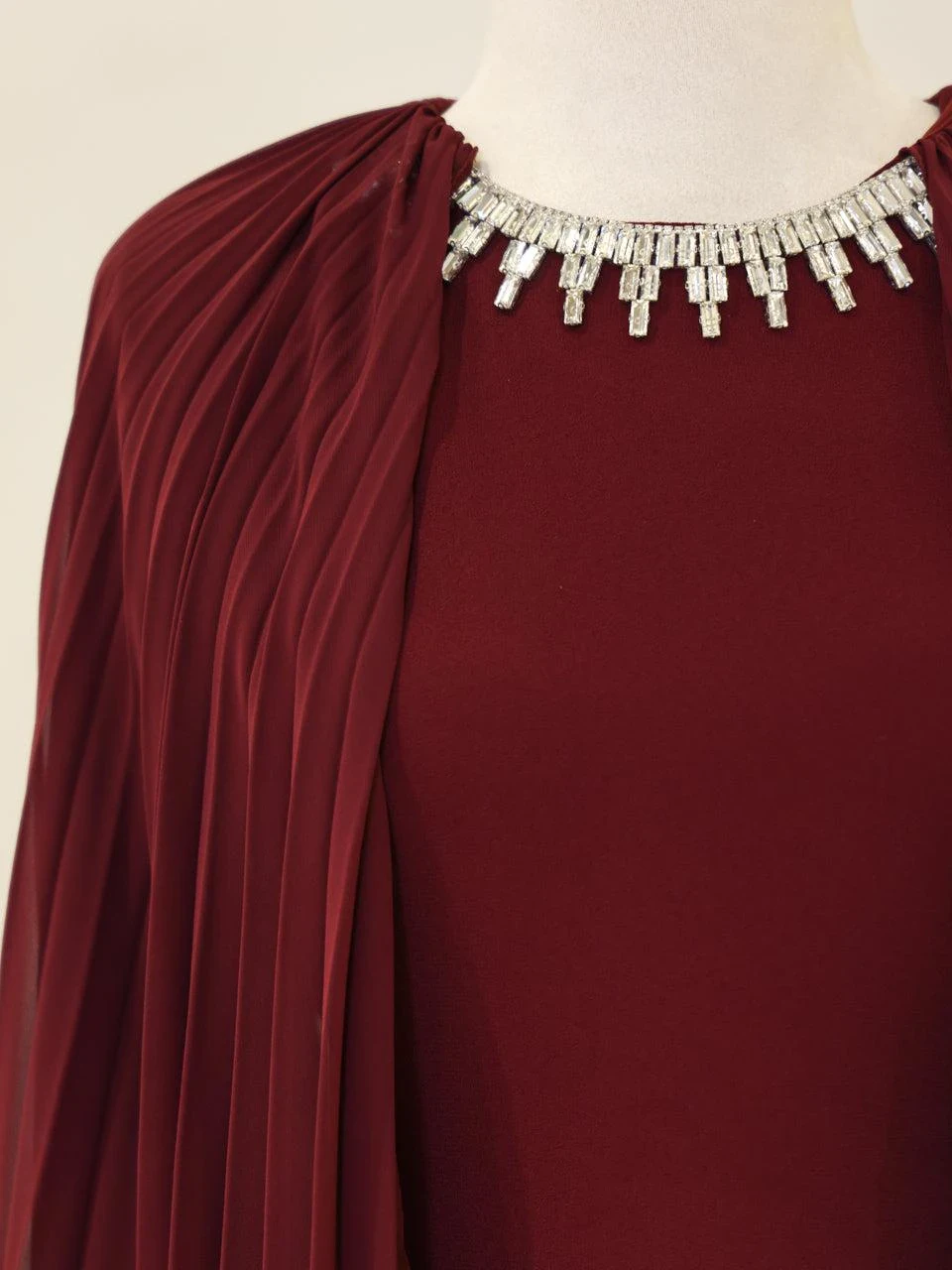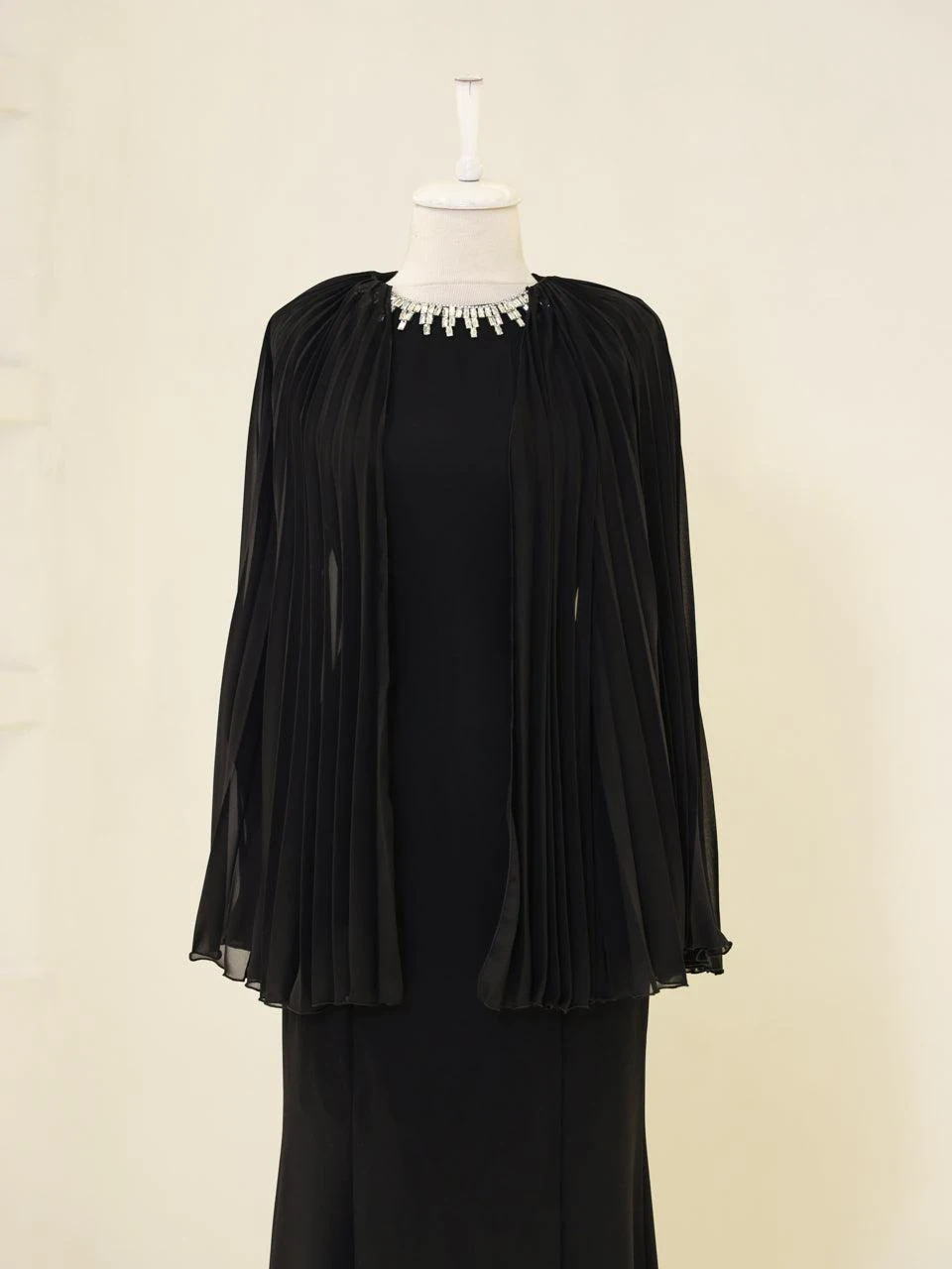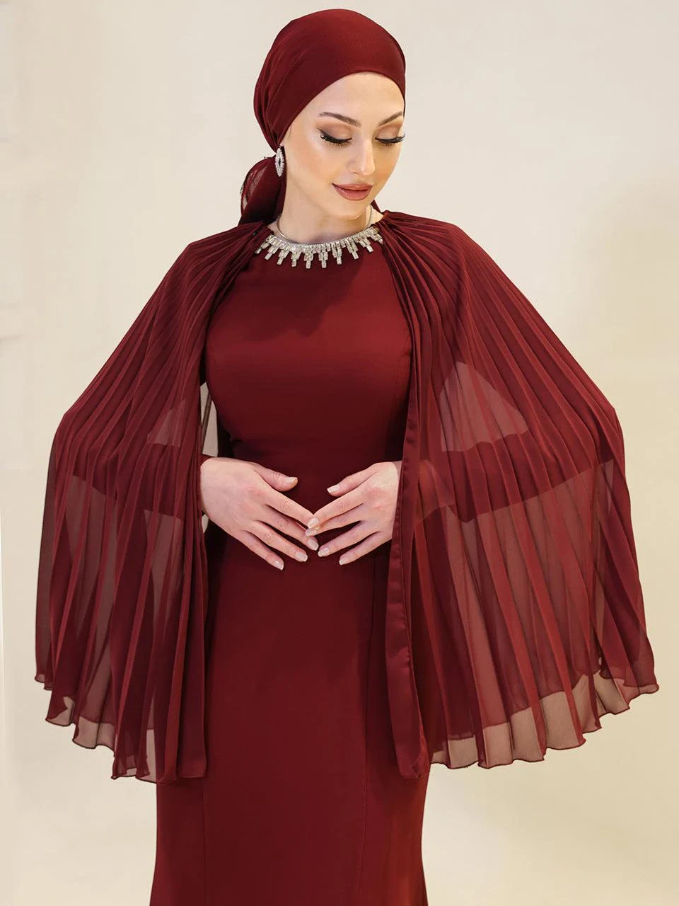 The Melya Modest Evening Dress is designed with a full fit and an average length of 155 cm. Made from crepe fabric, this dress features a lining for added comfort. It has a back zipper closure and cape details on both shoulders that are not detachable. The dress is crafted in a mermaid silhouette.