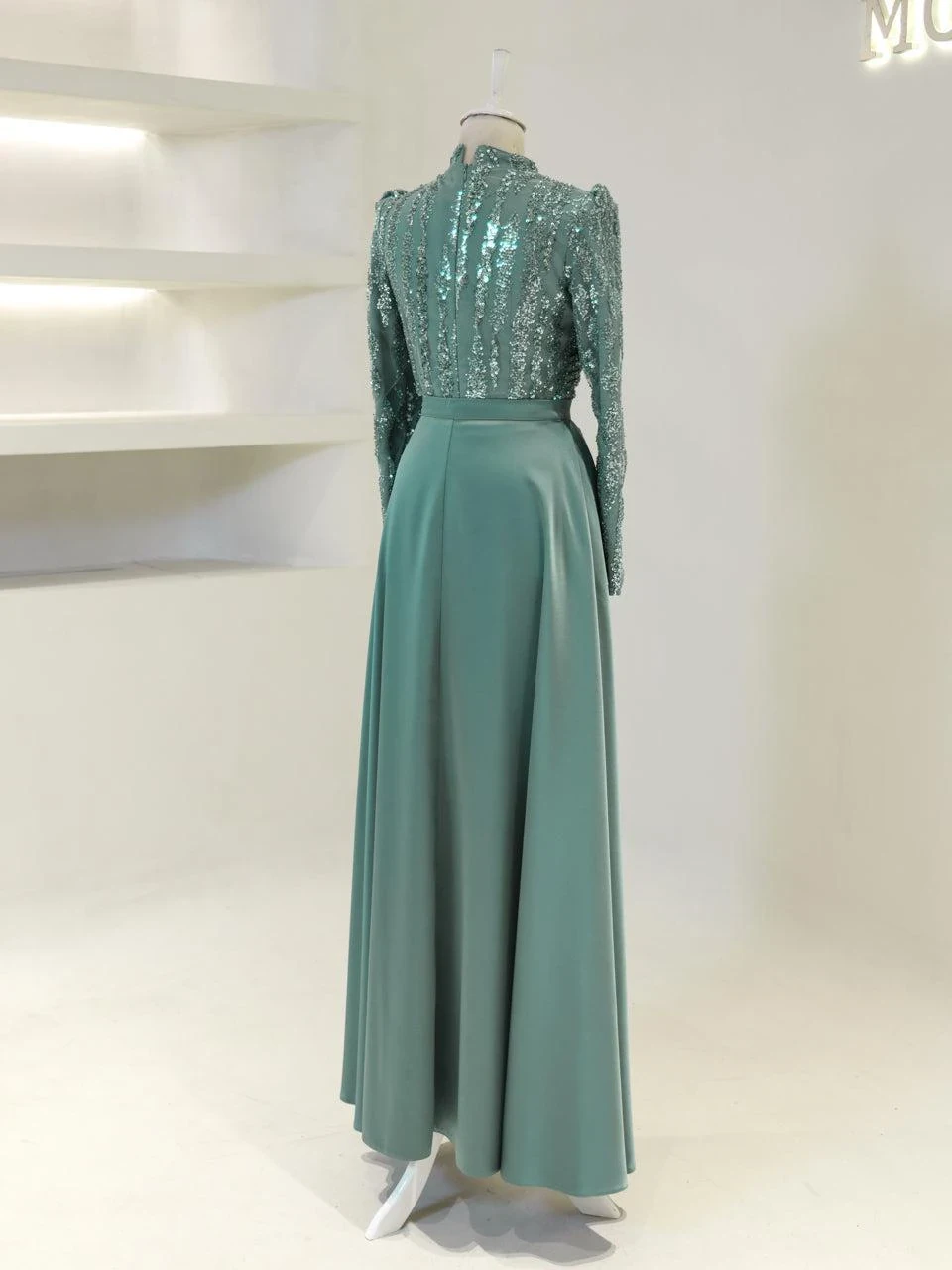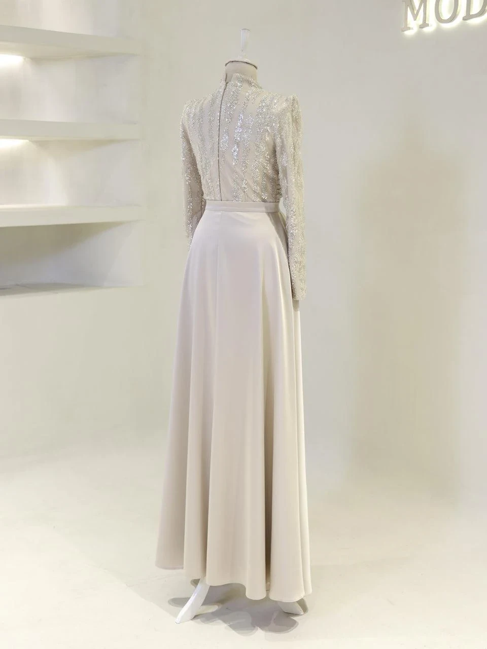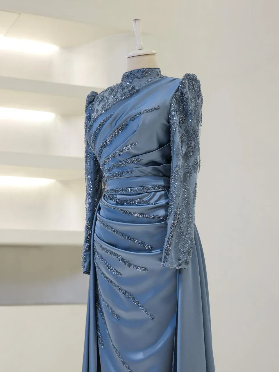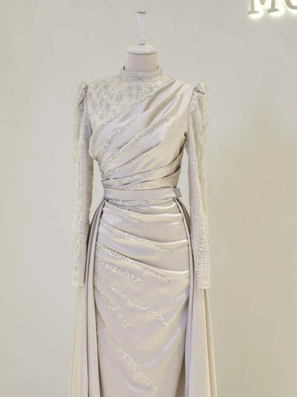 The Messina Modest Evening Dress is crafted with precision, offering a true-to-size fit and a length of 160 cm. Made from satin fabric, this dress includes a lining for added comfort. It features a back zipper closure and comes with a built-in chest pad for support. The embellishments are securely attached, ensuring durability. The skirt has a detachable cape, allowing for versatile styling, and is designed in a flared form.