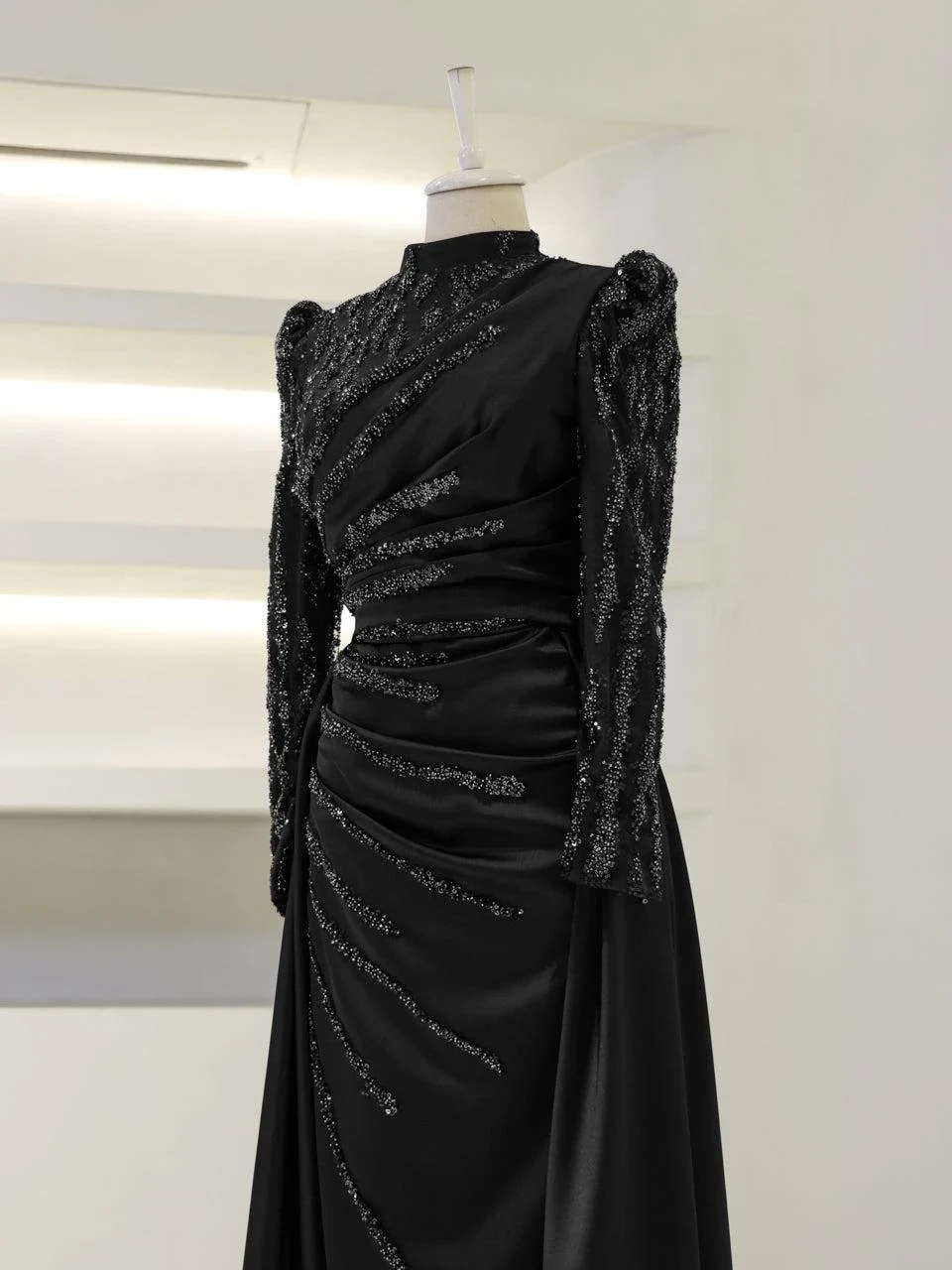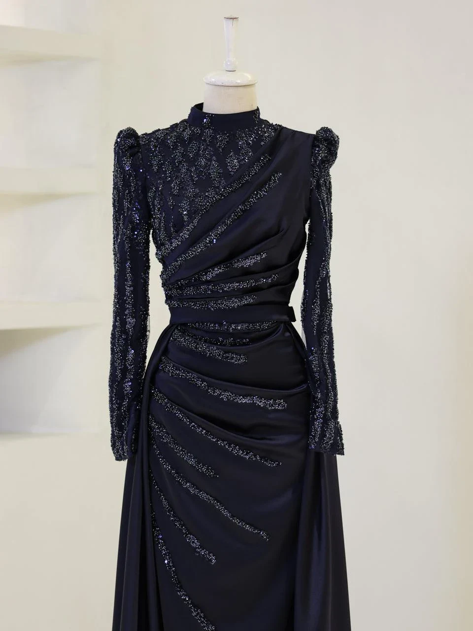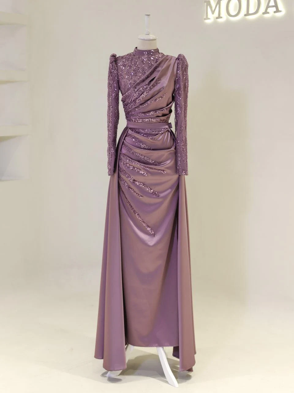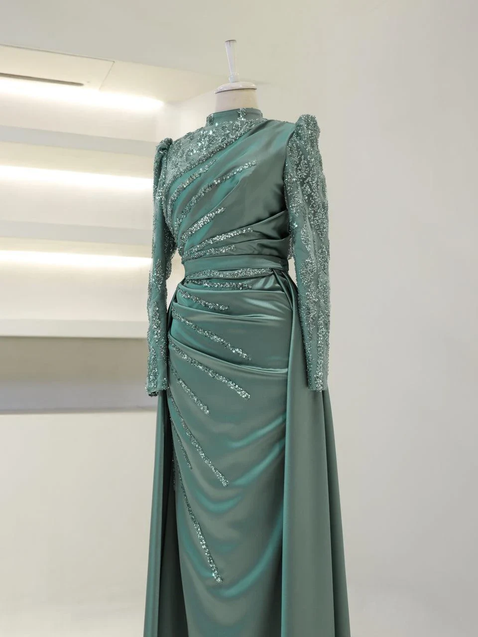 The Messina Modest Evening Dress is crafted with precision, offering a true-to-size fit and a length of 160 cm. Made from satin fabric, this dress includes a lining for added comfort. It features a back zipper closure and comes with a built-in chest pad for support. The embellishments are securely attached, ensuring durability. The skirt has a detachable cape, allowing for versatile styling, and is designed in a flared form.