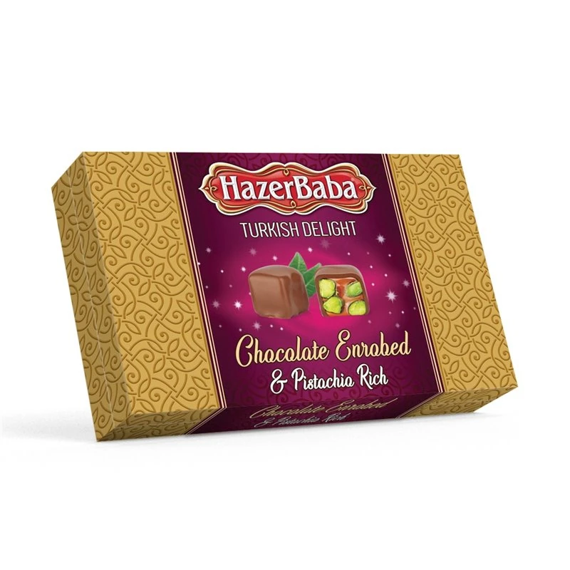 This Milk Chocolate Covered Double Pistachio Turkish Delight combines the rich flavors of traditional Turkish delight with a smooth milk chocolate coating. The Turkish delight contains 68% pistachio delight, made with sugar, 16% pistachios, corn starch, water, vanilla aroma, and citric acid as an acidity regulator. The milk chocolate coating makes up 32% of the product and includes sugar, cocoa butter, full cream milk powder, 11% cocoa mass, soy lecithin as an emulsifier, and natural vanilla flavoring. This product may contain traces of other nuts, gluten, and sesame.