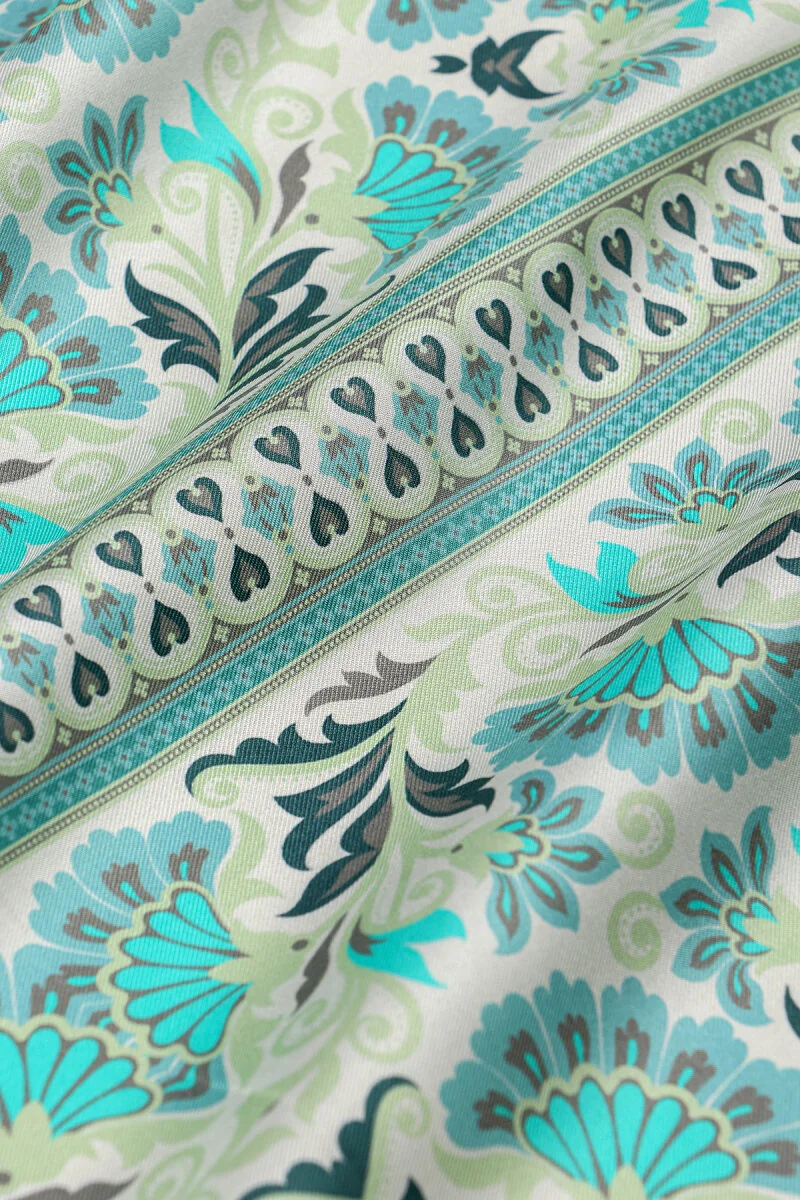 The Mint Carnation Pattern Twill Silk Scarf combines elegance with versatility. The intricate carnation design is crafted to complement both classic and modern wardrobes. Measuring 90×90 cm, this scarf is made from 100% twill silk, providing ease of use and a luxurious feel. Originating from Bursa, Turkey, it adds a strong touch to your style with its refined details and aesthetic lines.
