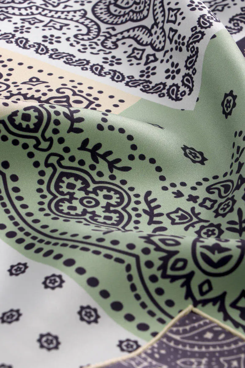 The Mint Patchwork Pattern Twill Silk Scarf combines modern design with functionality. Crafted using the twill weaving technique, this scarf offers durability and longevity. Its sophisticated patchwork pattern blends various colors and designs, making it suitable for any style. With dimensions of 90 x 90 cm, this scarf is easy to wear and adds a touch of elegance to your outfit. Made in Bursa, Turkey, it is an ideal choice for those seeking elegance and practicality.