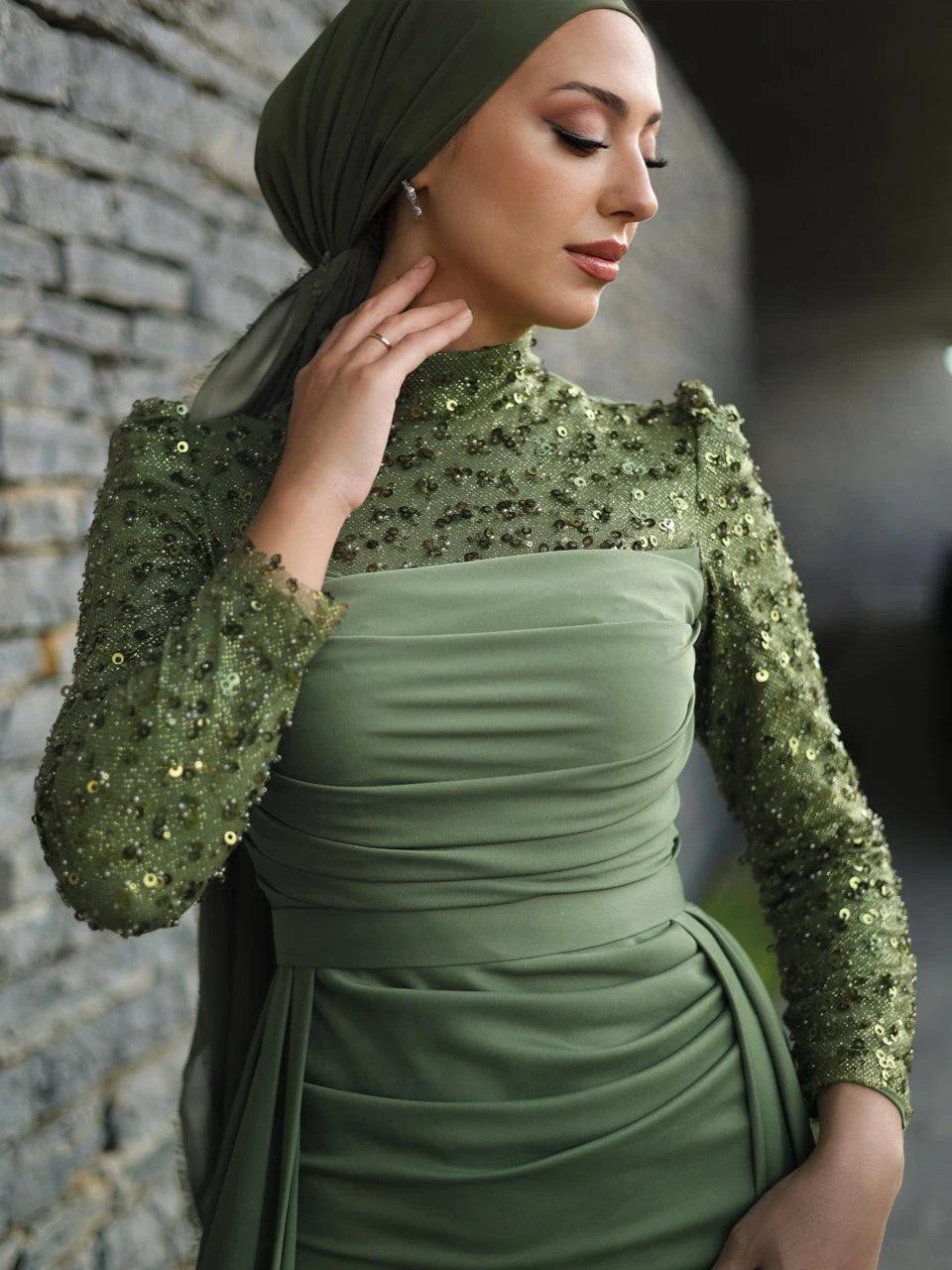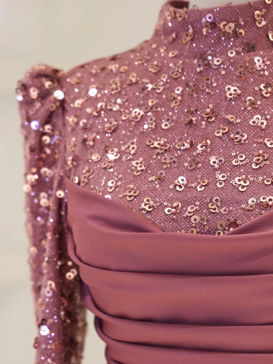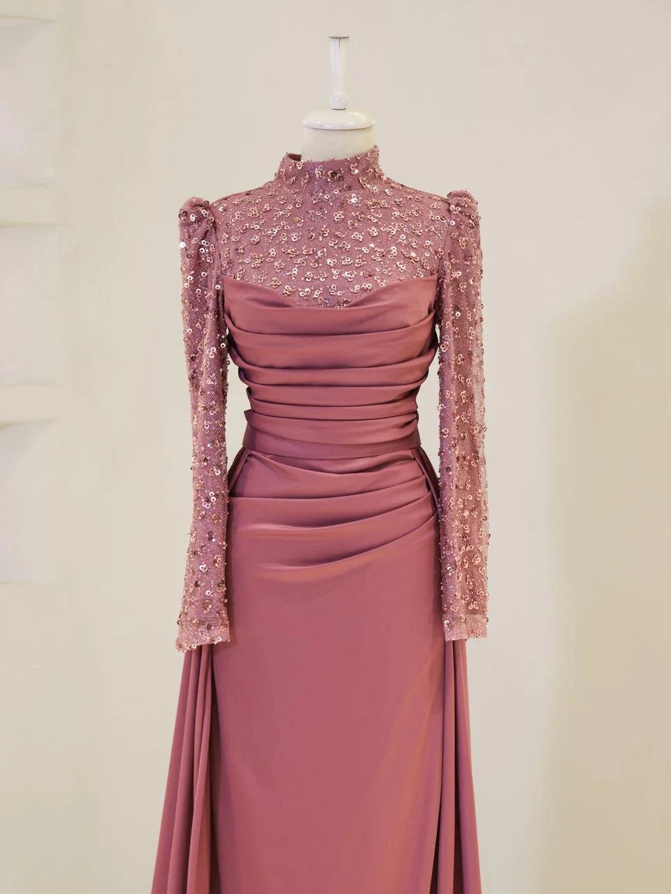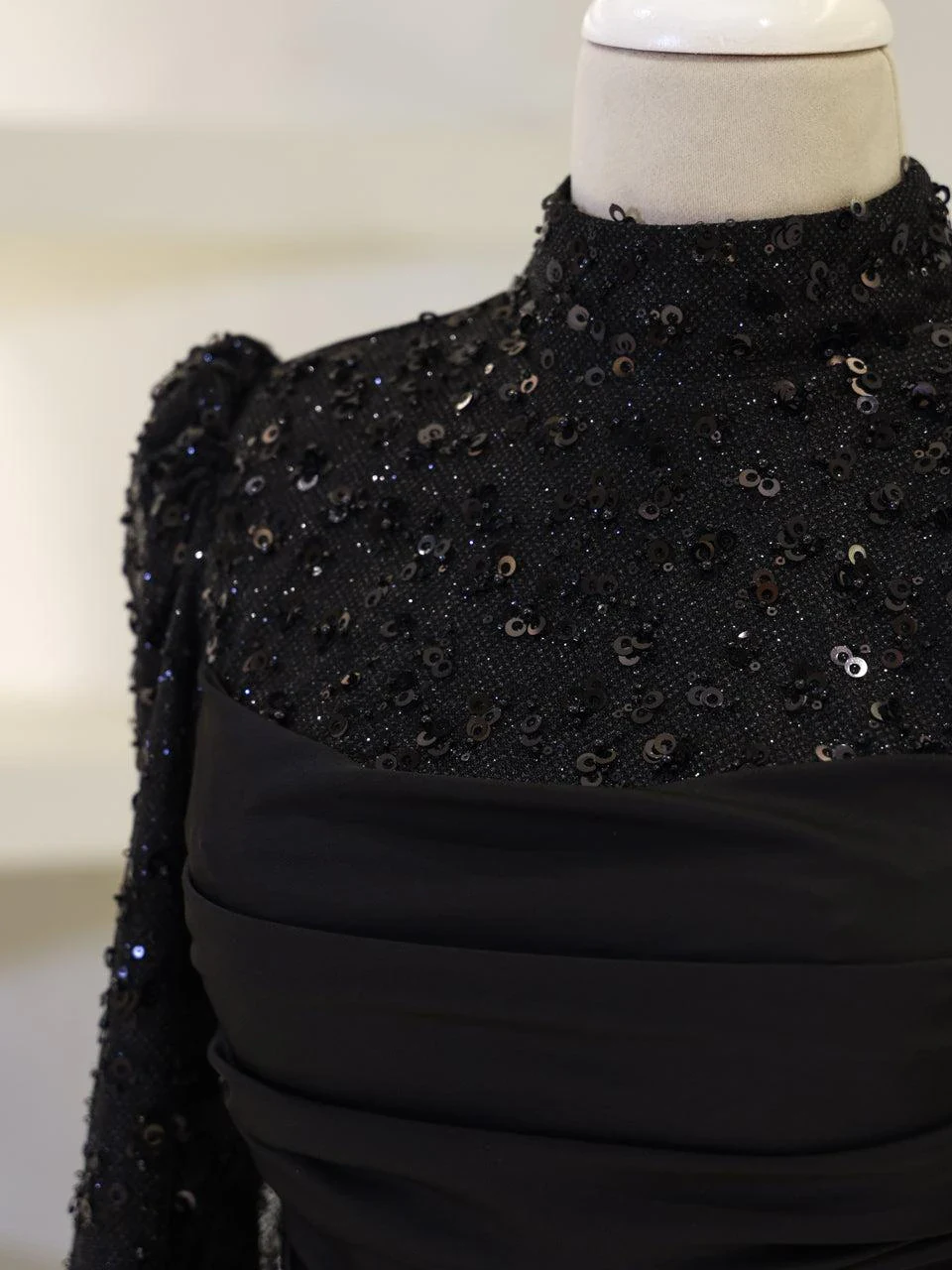 The Misty Modest Evening Dress is crafted from satin fabric, offering a sophisticated look suitable for special occasions. It features a standard fit with an average front length of 160 cm and a back length of 175 cm. The dress includes sequin-embellished tulle details on the chest and sleeves, adding a touch of elegance. It is fully lined and has a back zipper closure for ease of wear. The dress is designed with a bust pad for added comfort and support, and includes drape detailing. The belt is non-detachable, maintaining the dress’s sleek silhouette. The skirt has a straight form, enhancing its classic appeal.
