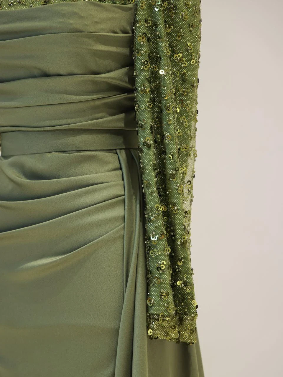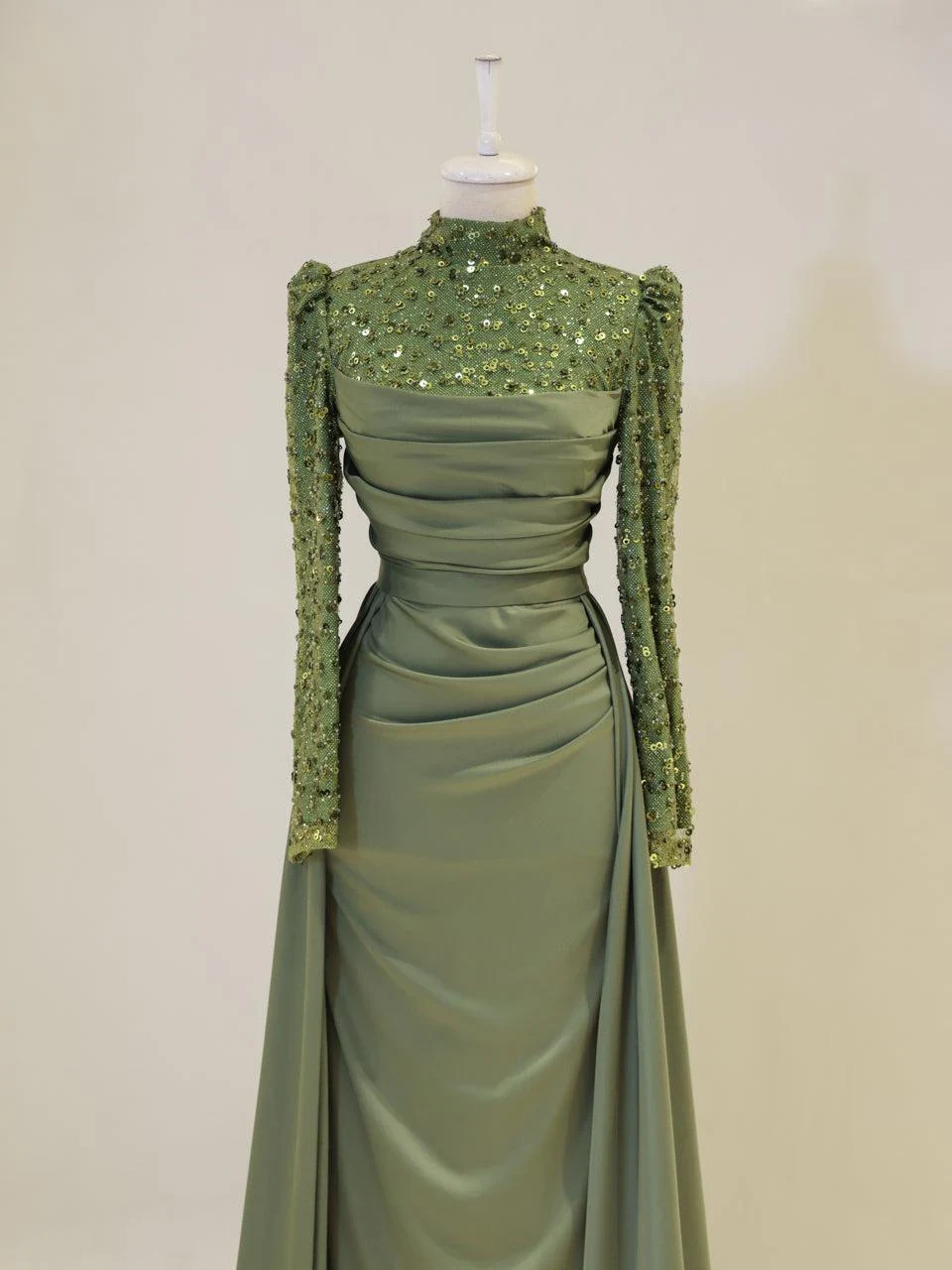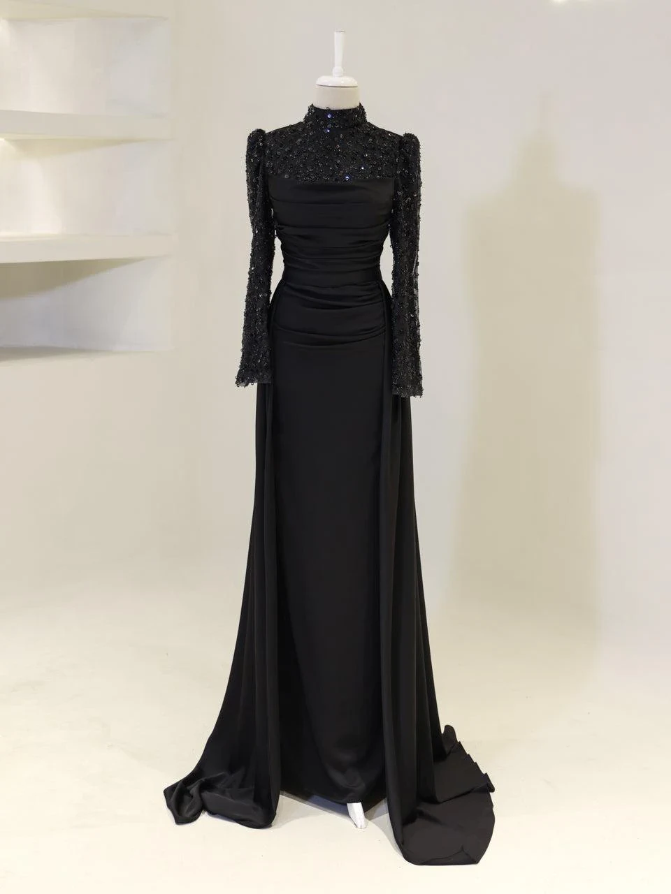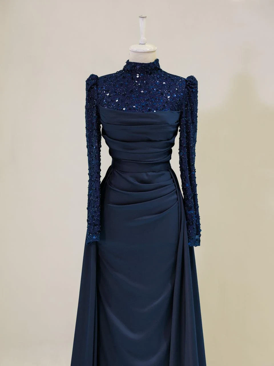 The Misty Modest Evening Dress is crafted from satin fabric, offering a sophisticated look suitable for special occasions. It features a standard fit with an average front length of 160 cm and a back length of 175 cm. The dress includes sequin-embellished tulle details on the chest and sleeves, adding a touch of elegance. It is fully lined and has a back zipper closure for ease of wear. The dress is designed with a bust pad for added comfort and support, and includes drape detailing. The belt is non-detachable, maintaining the dress’s sleek silhouette. The skirt has a straight form, enhancing its classic appeal.