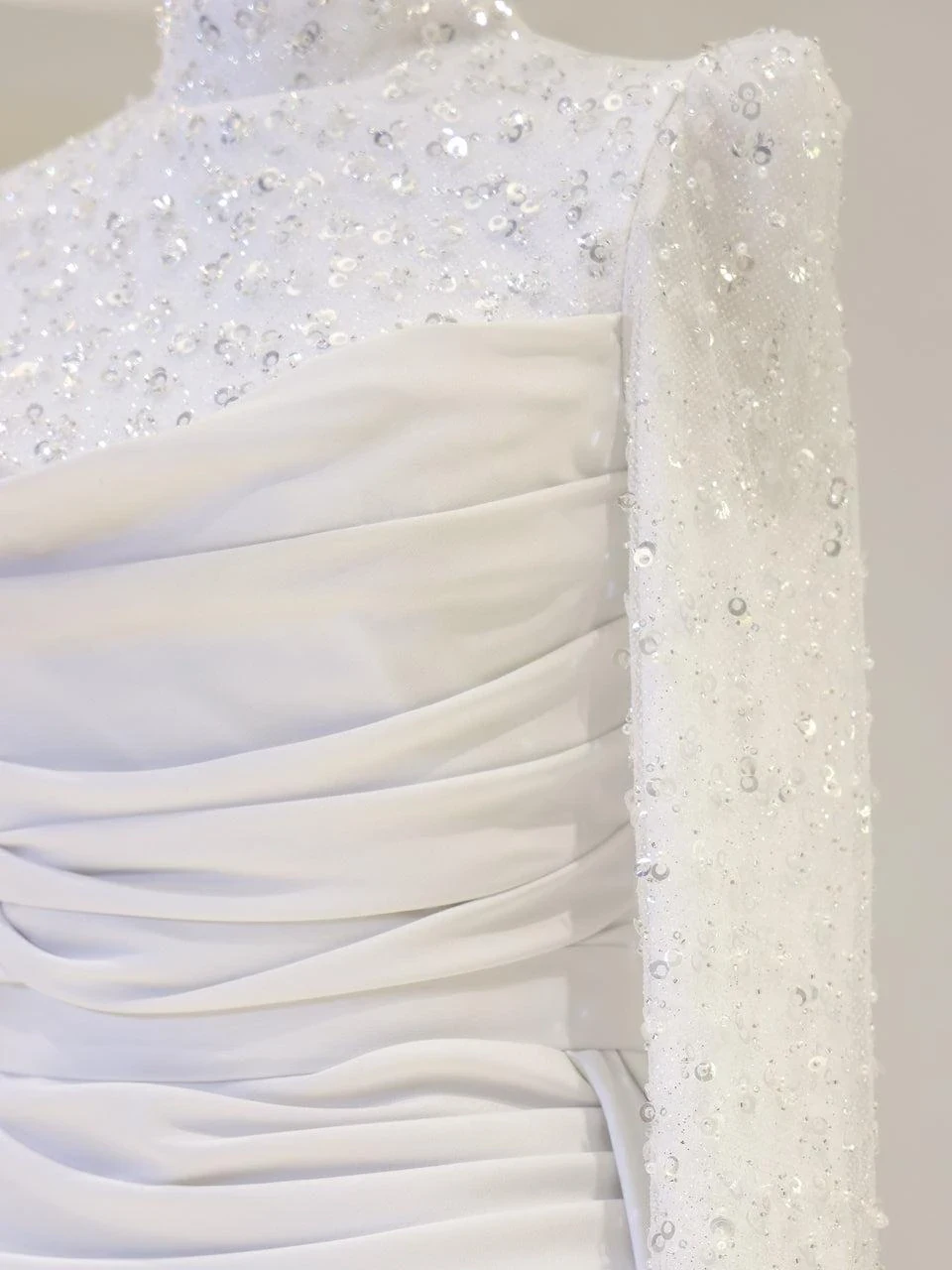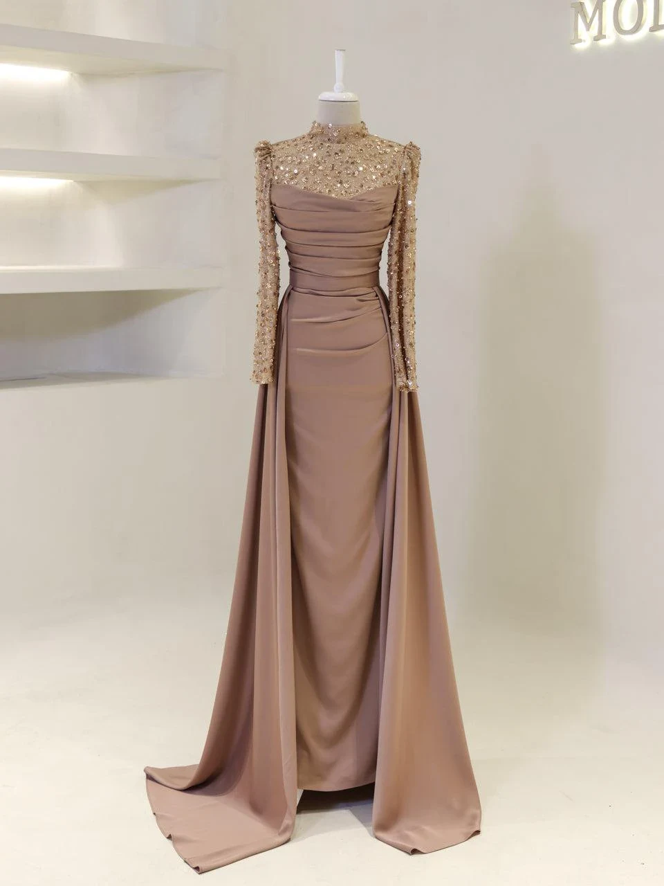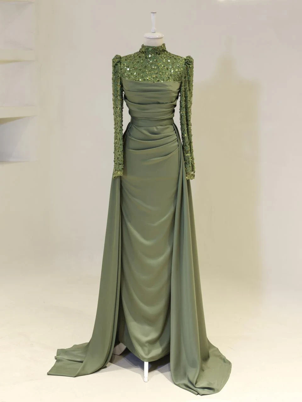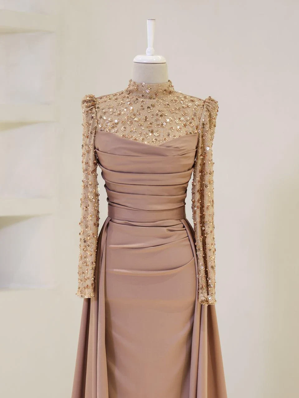 The Misty Modest Evening Dress is crafted from satin fabric, offering a sophisticated look suitable for special occasions. It features a standard fit with an average front length of 160 cm and a back length of 175 cm. The dress includes sequin-embellished tulle details on the chest and sleeves, adding a touch of elegance. It is fully lined and has a back zipper closure for ease of wear. The dress is designed with a bust pad for added comfort and support, and includes drape detailing. The belt is non-detachable, maintaining the dress’s sleek silhouette. The skirt has a straight form, enhancing its classic appeal.