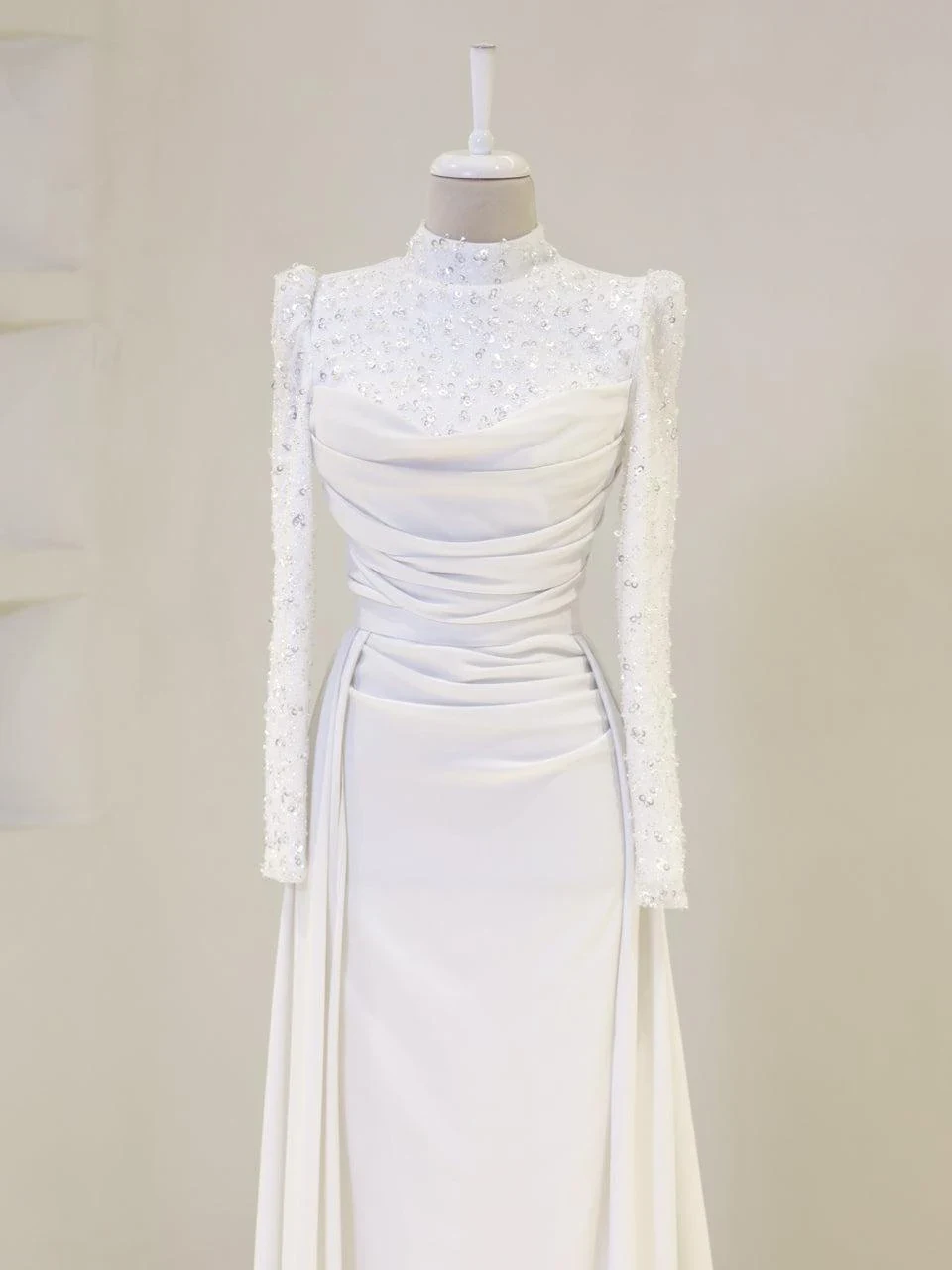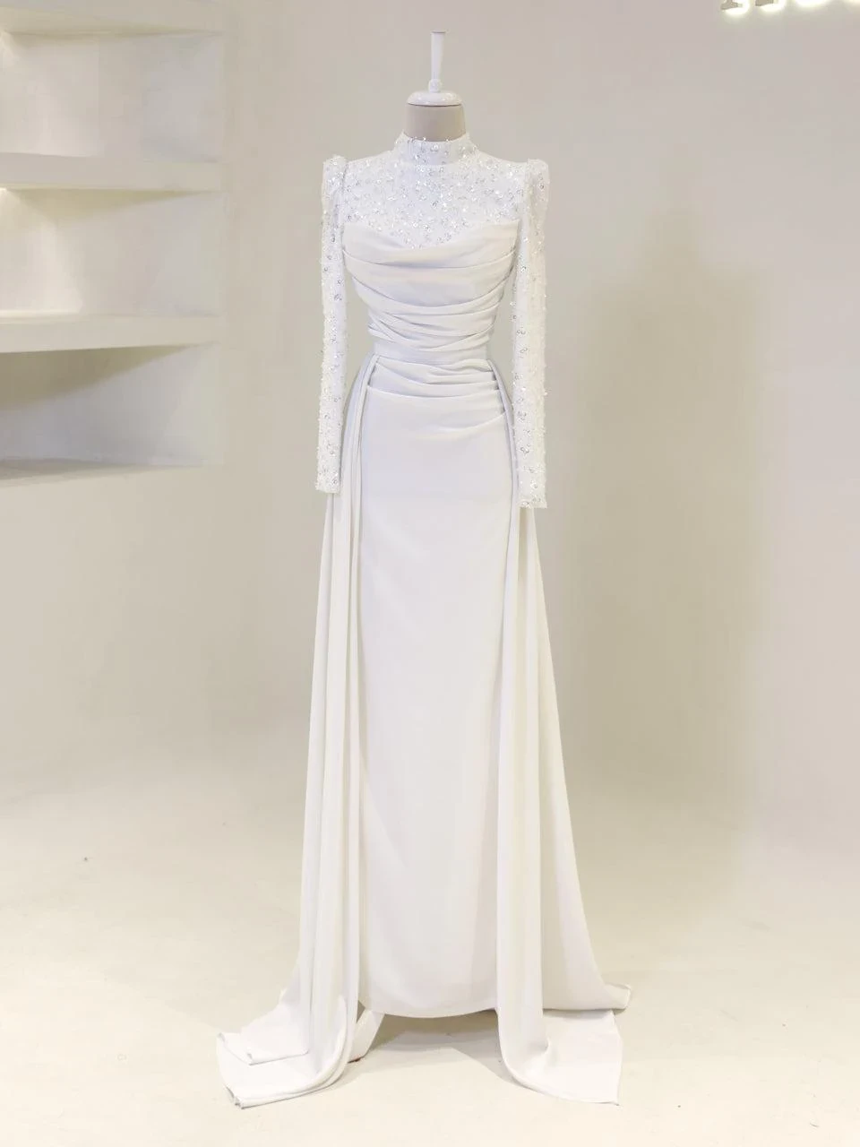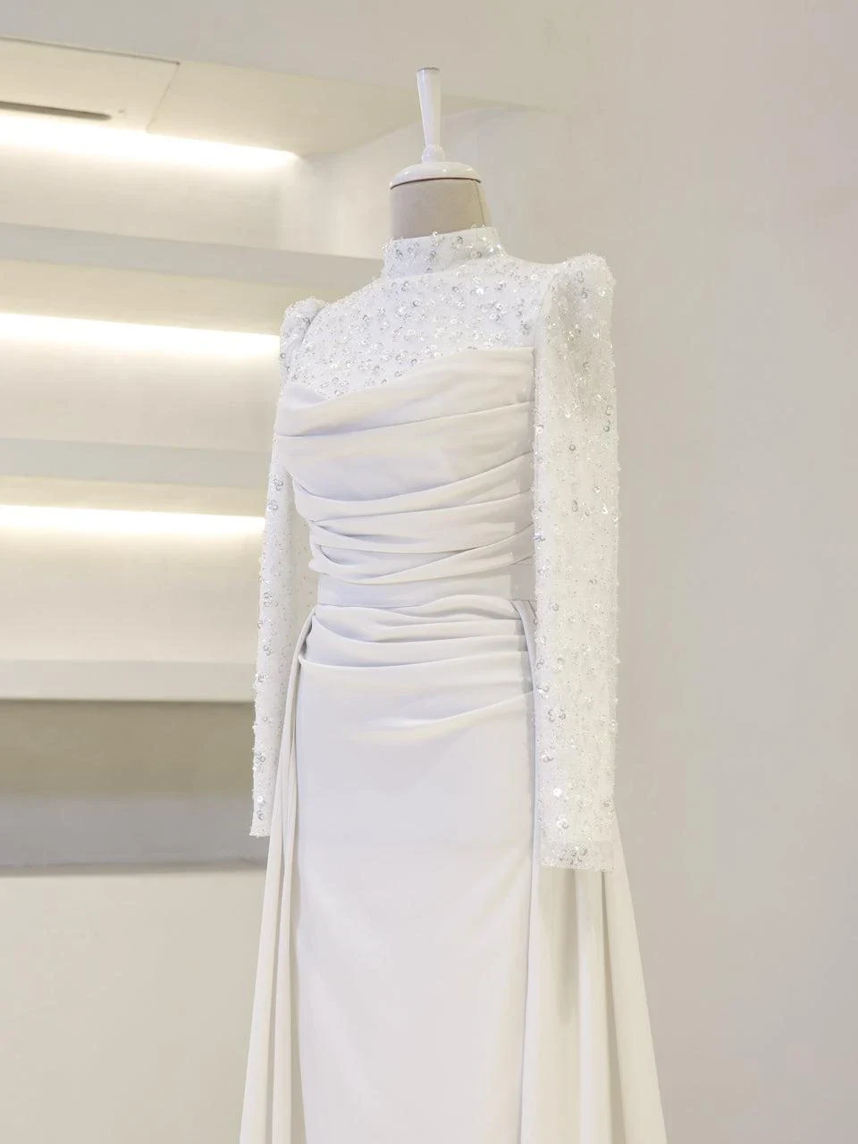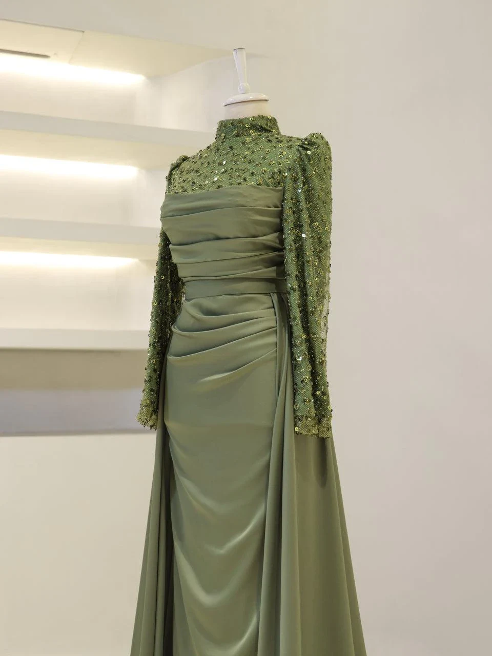 The Misty Modest Evening Dress is crafted from satin fabric, offering a sophisticated look suitable for special occasions. It features a standard fit with an average front length of 160 cm and a back length of 175 cm. The dress includes sequin-embellished tulle details on the chest and sleeves, adding a touch of elegance. It is fully lined and has a back zipper closure for ease of wear. The dress is designed with a bust pad for added comfort and support, and includes drape detailing. The belt is non-detachable, maintaining the dress’s sleek silhouette. The skirt has a straight form, enhancing its classic appeal.