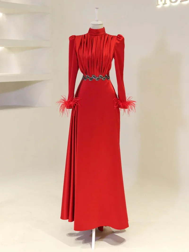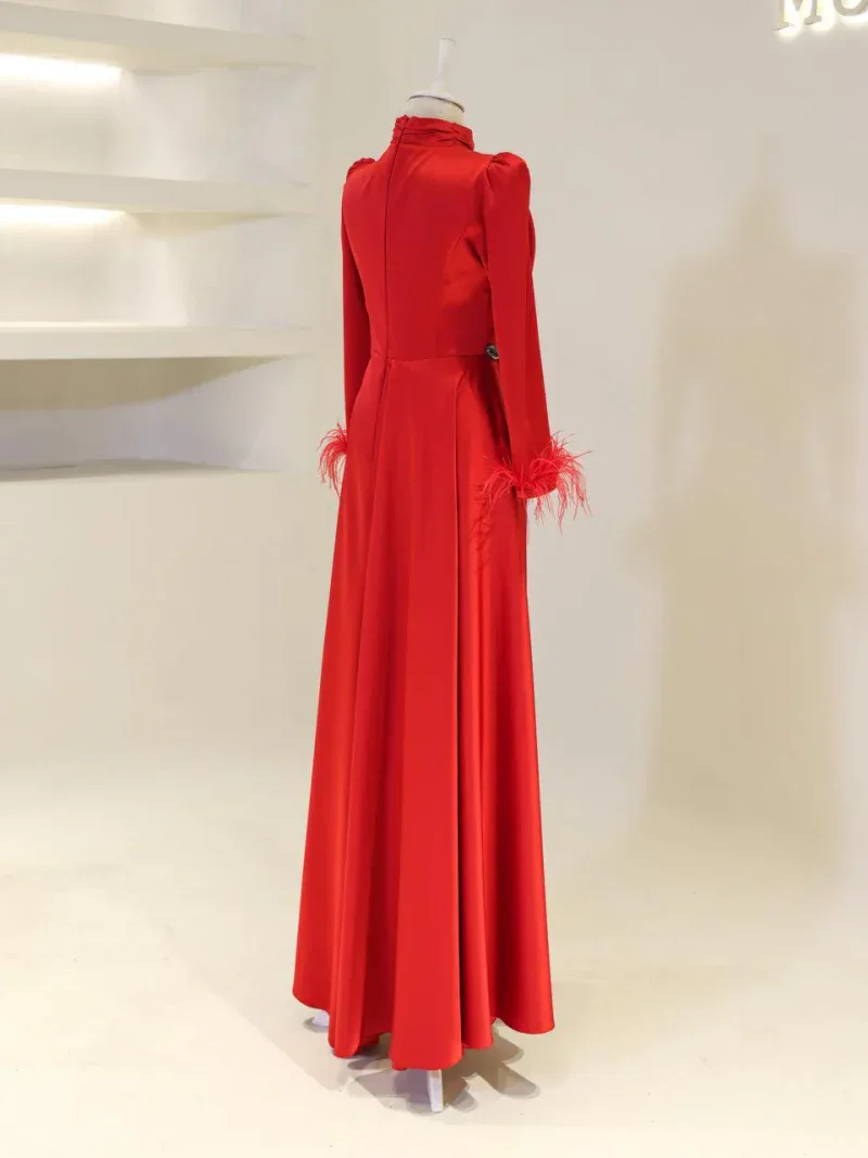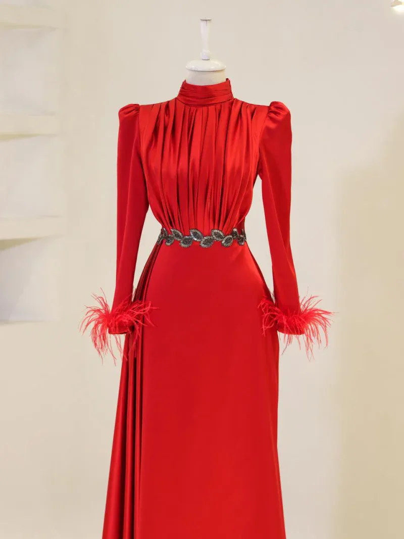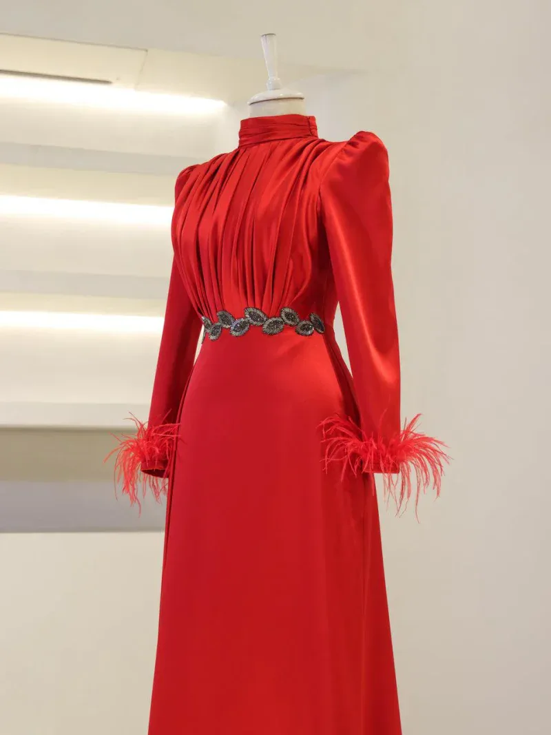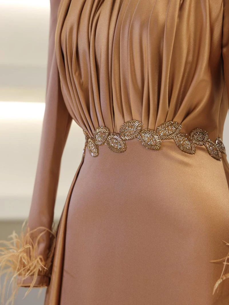 I recently wore this Modest Evening Dress for a formal event, and it was an absolute showstopper! The elegant leaf stone embellishments and feather detailing added such a luxurious touch, and I felt both sophisticated and comfortable all night long. Thank you for creating such a beautiful piece!