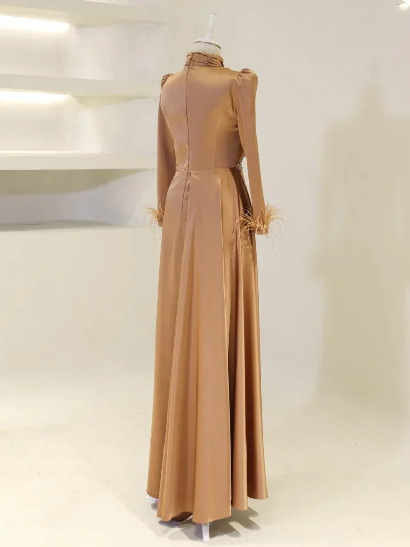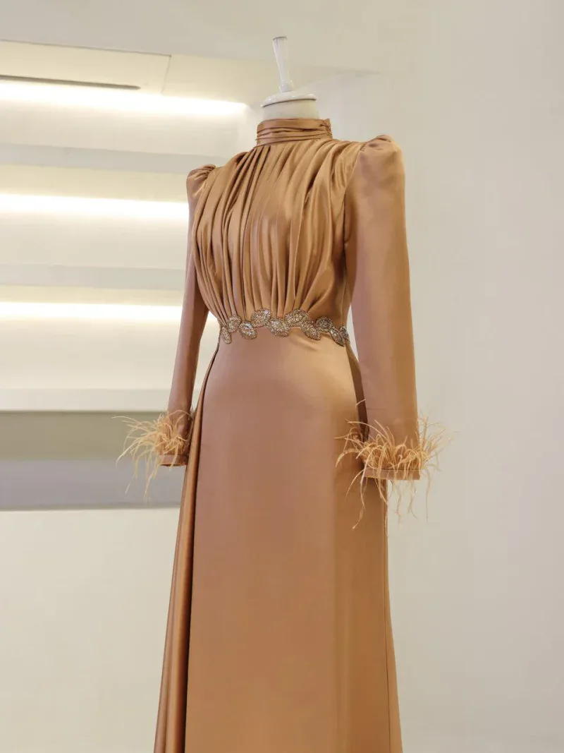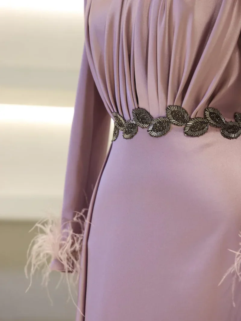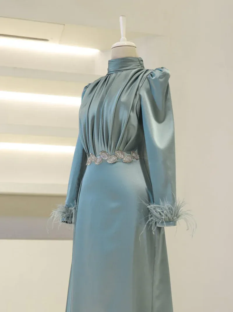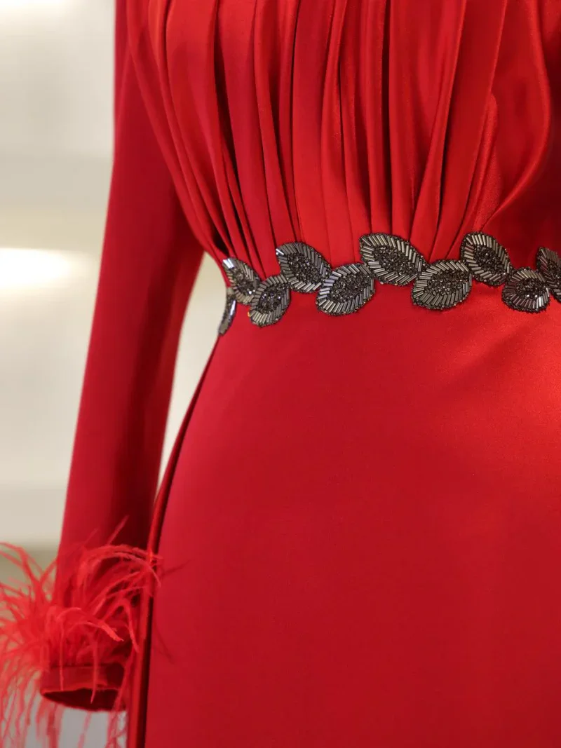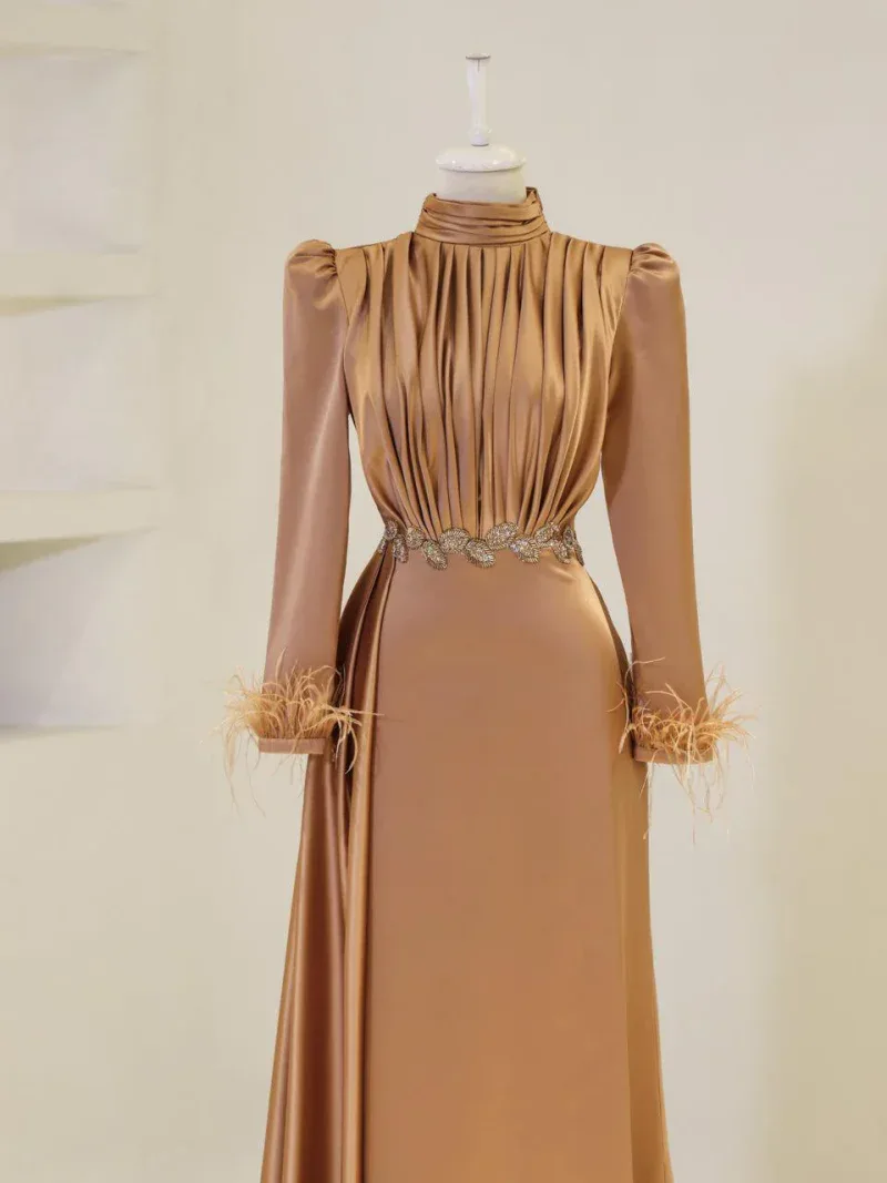 I recently wore this Modest Evening Dress for a formal event, and it was an absolute showstopper! The elegant leaf stone embellishments and feather detailing added such a luxurious touch, and I felt both sophisticated and comfortable all night long. Thank you for creating such a beautiful piece!