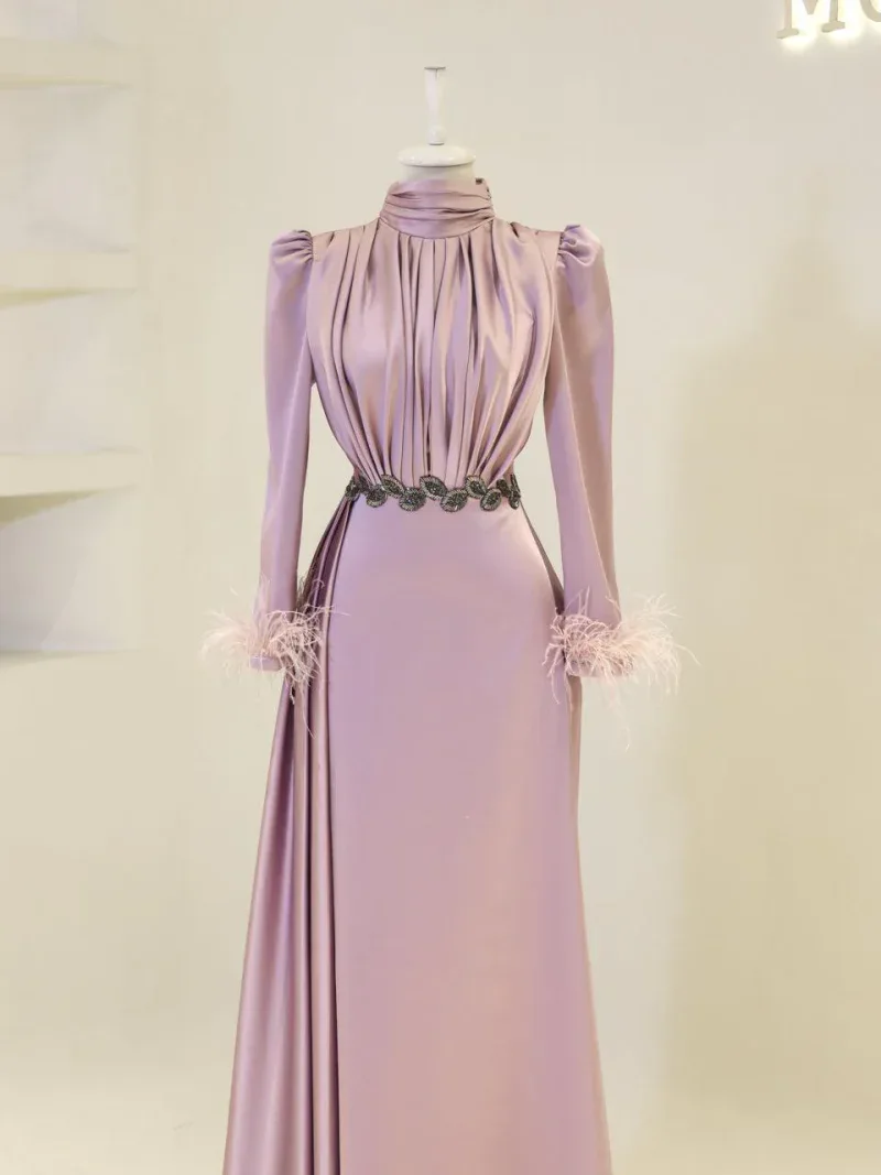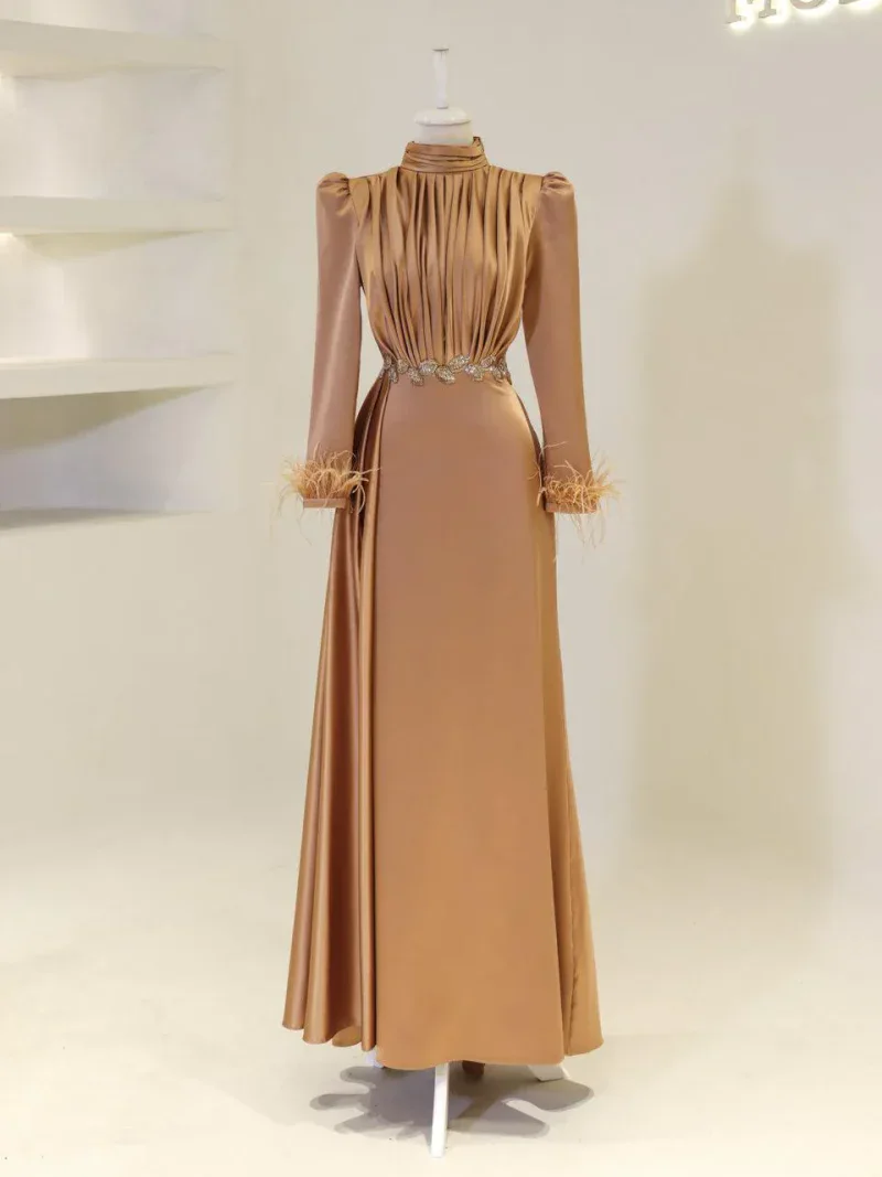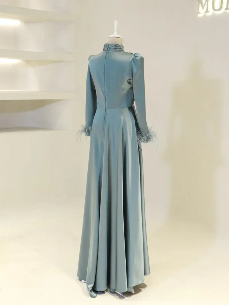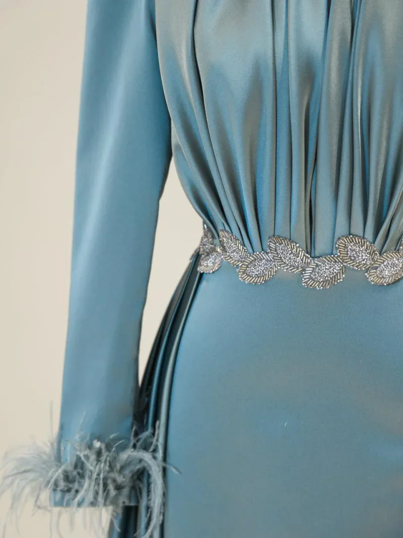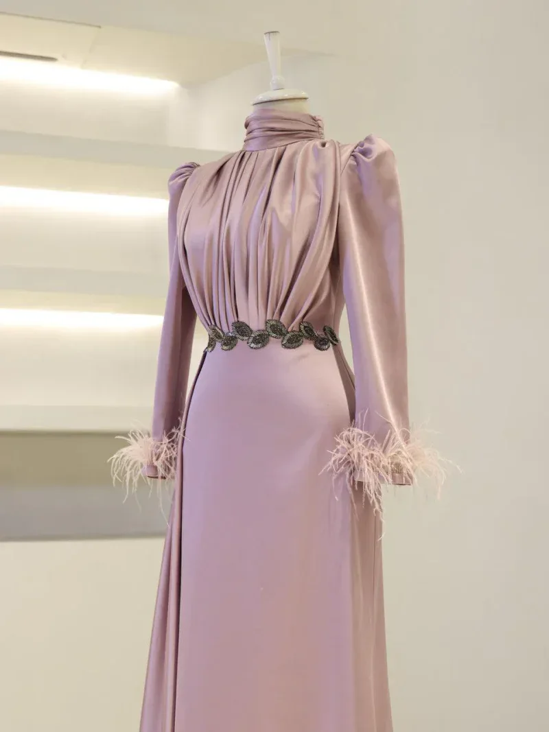 I recently wore this Modest Evening Dress for a formal event, and it was an absolute showstopper! The elegant leaf stone embellishments and feather detailing added such a luxurious touch, and I felt both sophisticated and comfortable all night long. Thank you for creating such a beautiful piece!