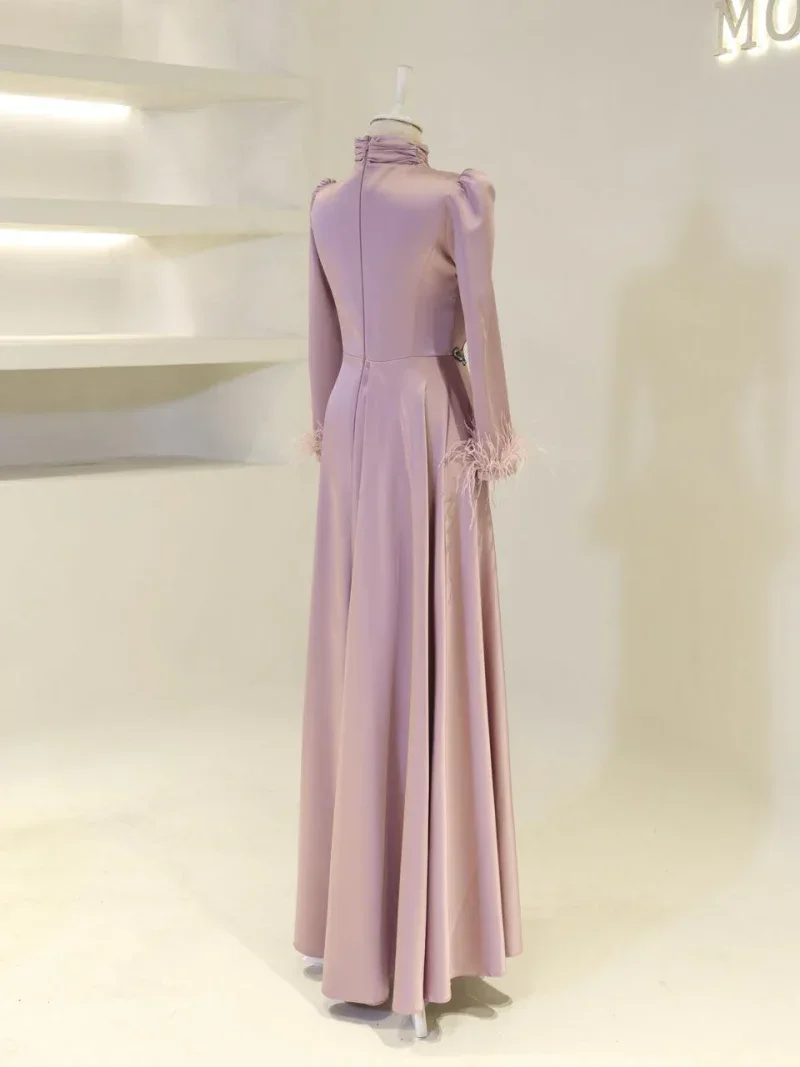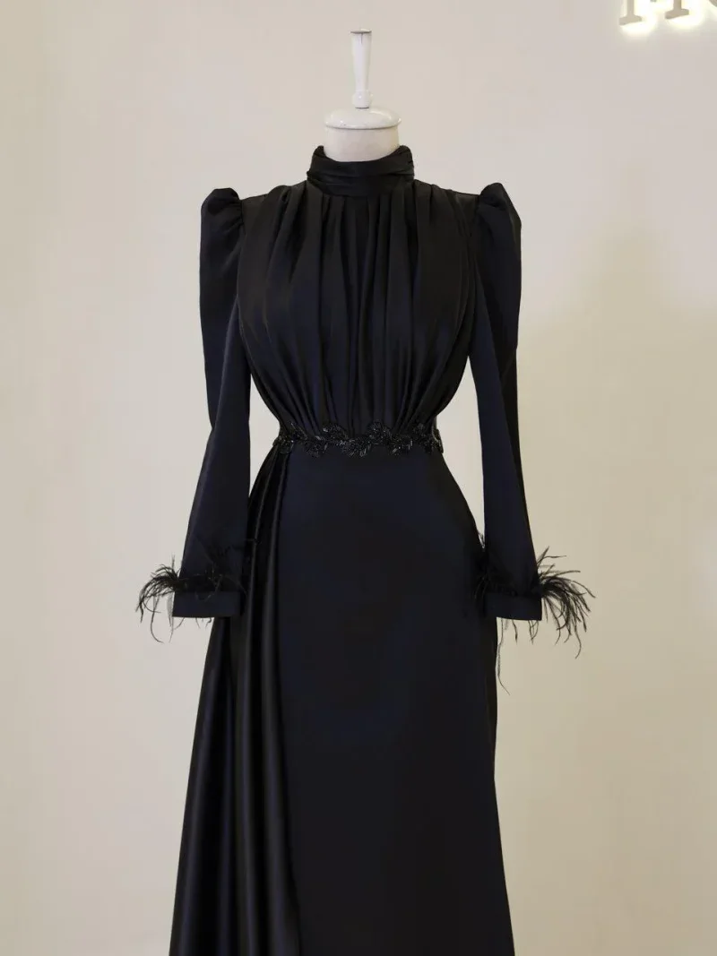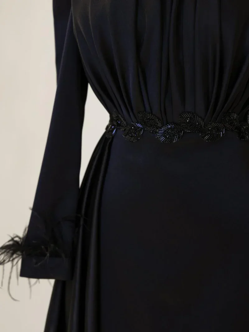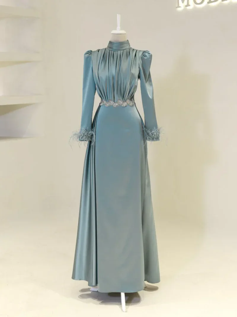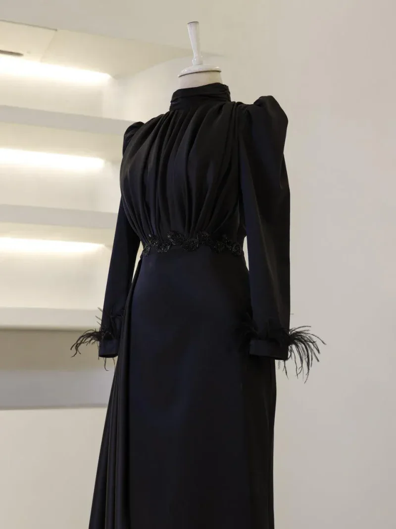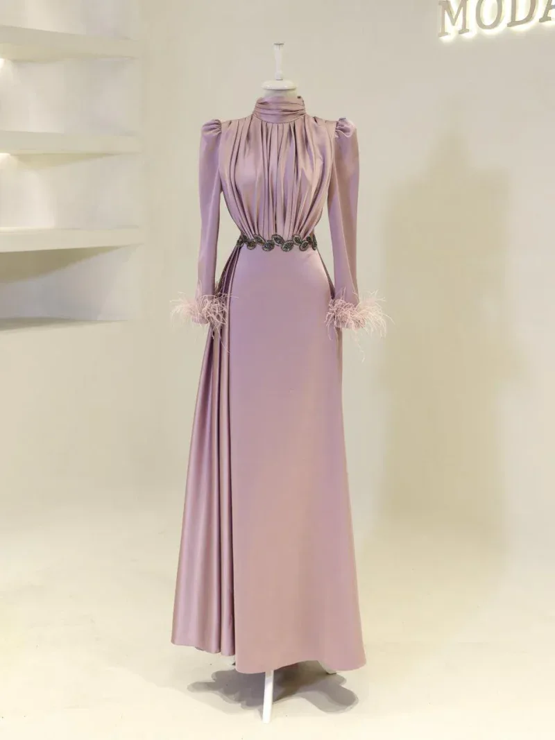 I recently wore this Modest Evening Dress for a formal event, and it was an absolute showstopper! The elegant leaf stone embellishments and feather detailing added such a luxurious touch, and I felt both sophisticated and comfortable all night long. Thank you for creating such a beautiful piece!
