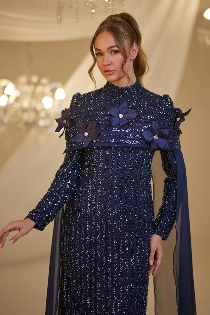 Our Hafsa Evening Gown features a sheer tulle cape with elegant floral appliqués on the shoulders and full sequin embellishments throughout. This sophisticated design is fully lined and includes a hidden zipper closure at the back for a seamless look.