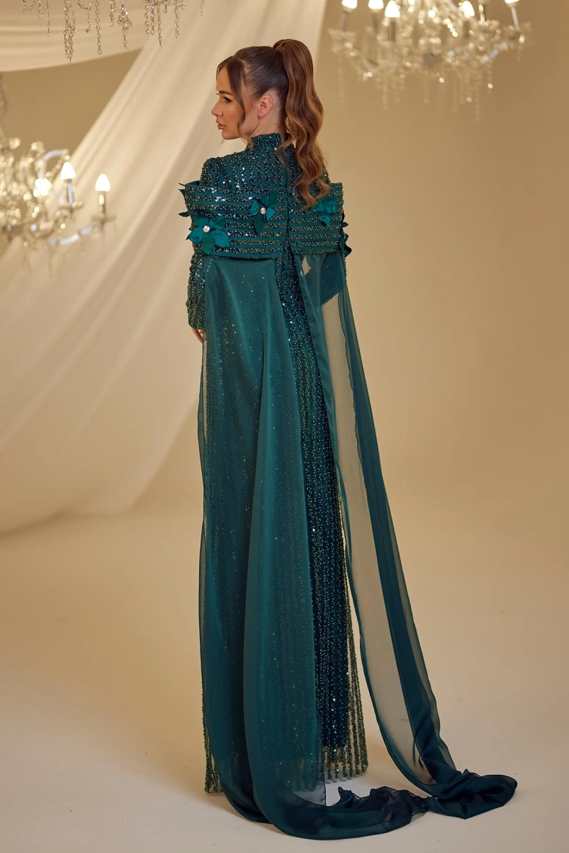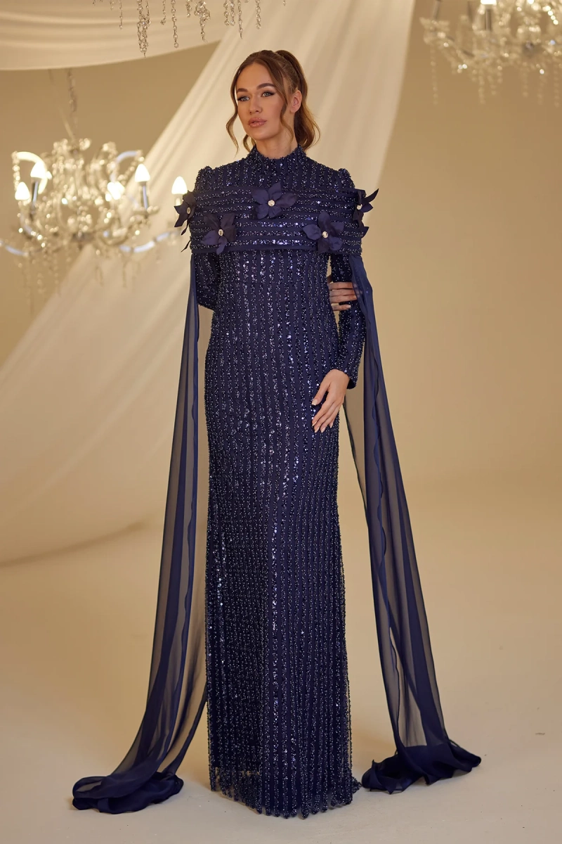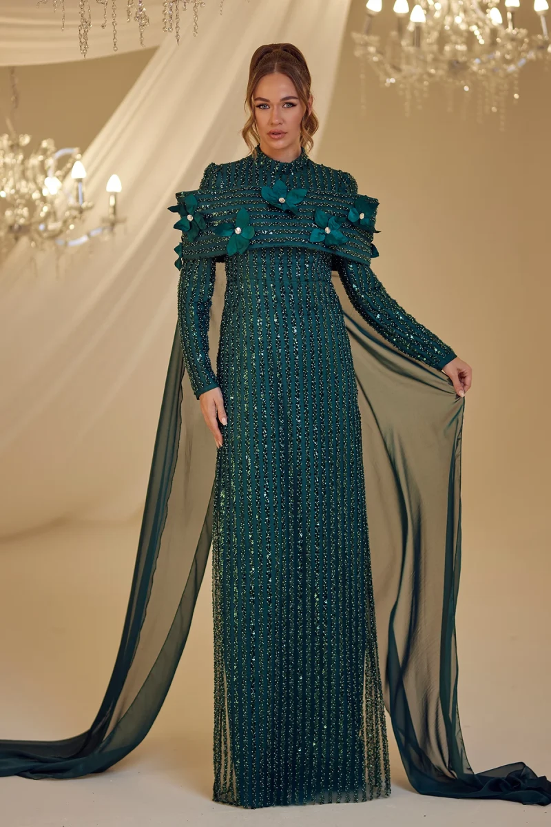 I recently wore this beautiful modest evening gown to a family wedding and received so many compliments! The floral cape and sequin embellishments added just the right amount of elegance, and I felt both comfortable and confident all night. Thank you for such a stunning dress!