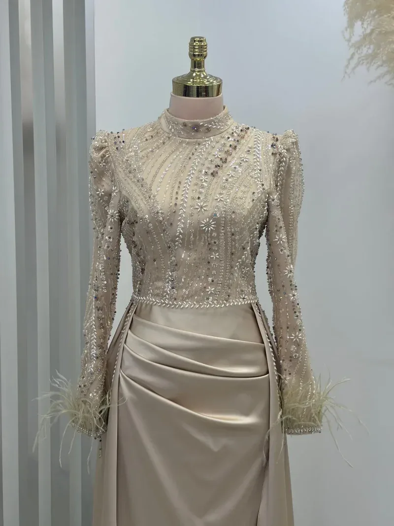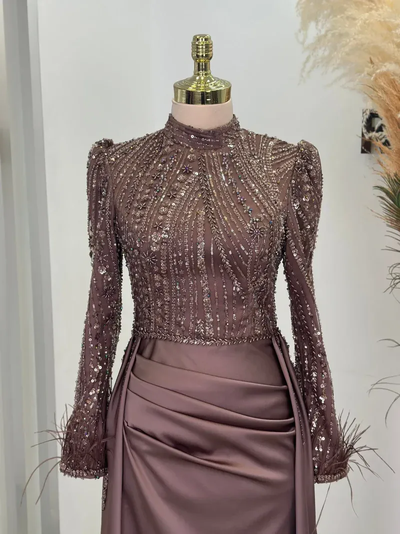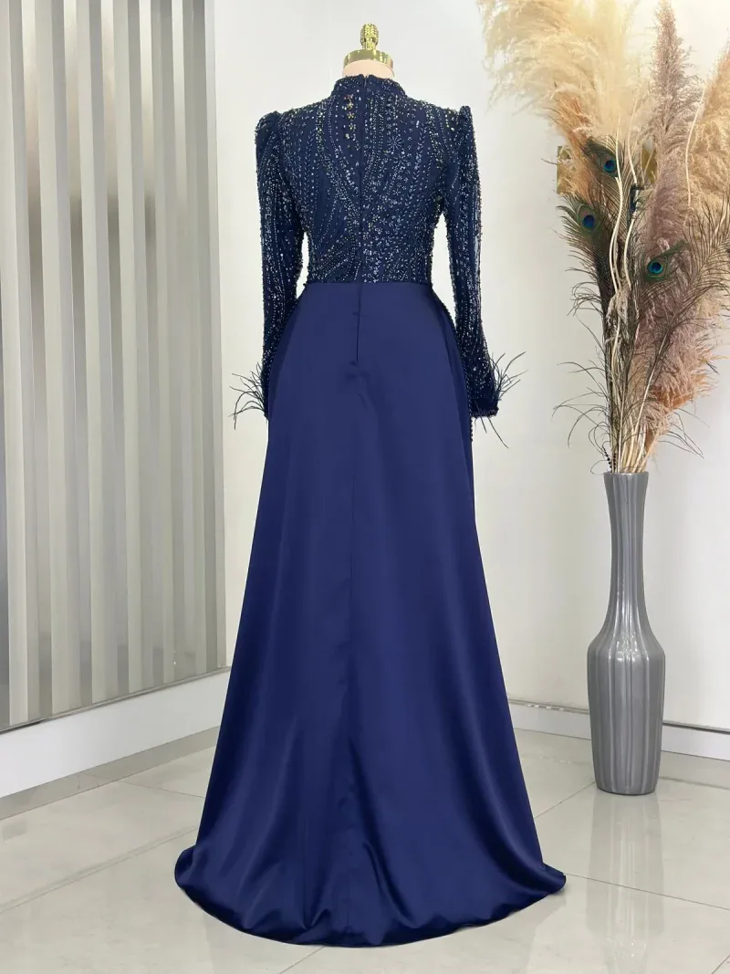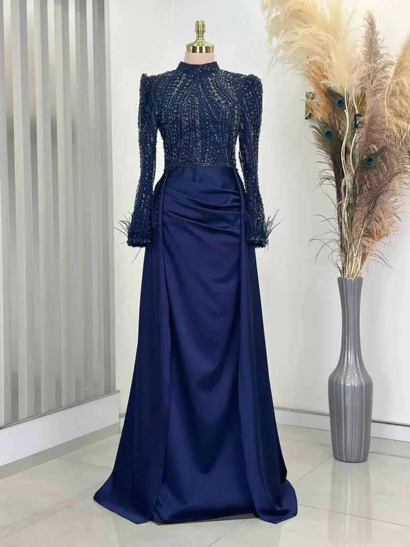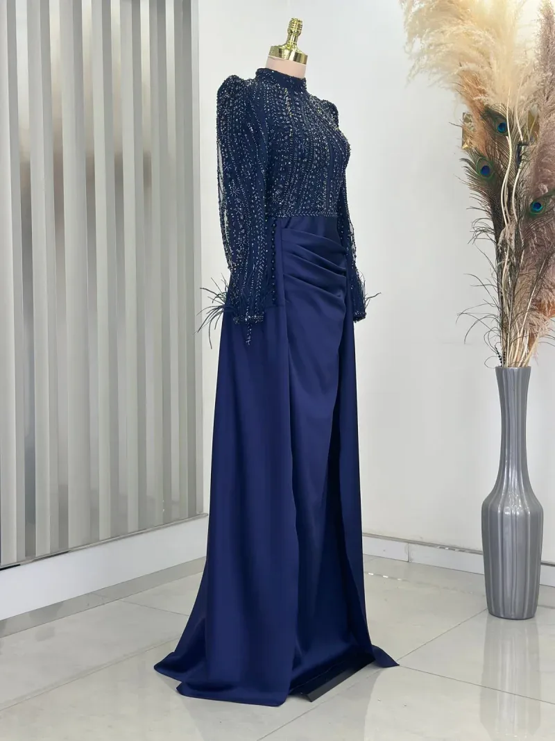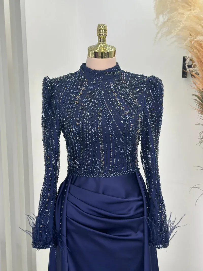 This elegant evening gown is the perfect choice for those wanting to dazzle on special occasions. Standing out with its chic design and fine details, the dress completes your sophisticated look. The depth of navy blue and its lustrous fabric create an aristocratic presence, while the embroidered top draws attention as an elegant accent. The long sleeves and body-hugging cut reveal a graceful silhouette while offering comfortable wear. The high neckline and subtle pleats at the skirt section add a modern and classic touch to the dress. This unique gown, which will make you feel like a princess at special events, engagement ceremonies, or weddings, truly deserves a place in every wardrobe. With this design that combines elegance and sophistication, you’ll feel both special and at the forefront of fashion. A must-have for all women who want to look magnificent from head to toe!