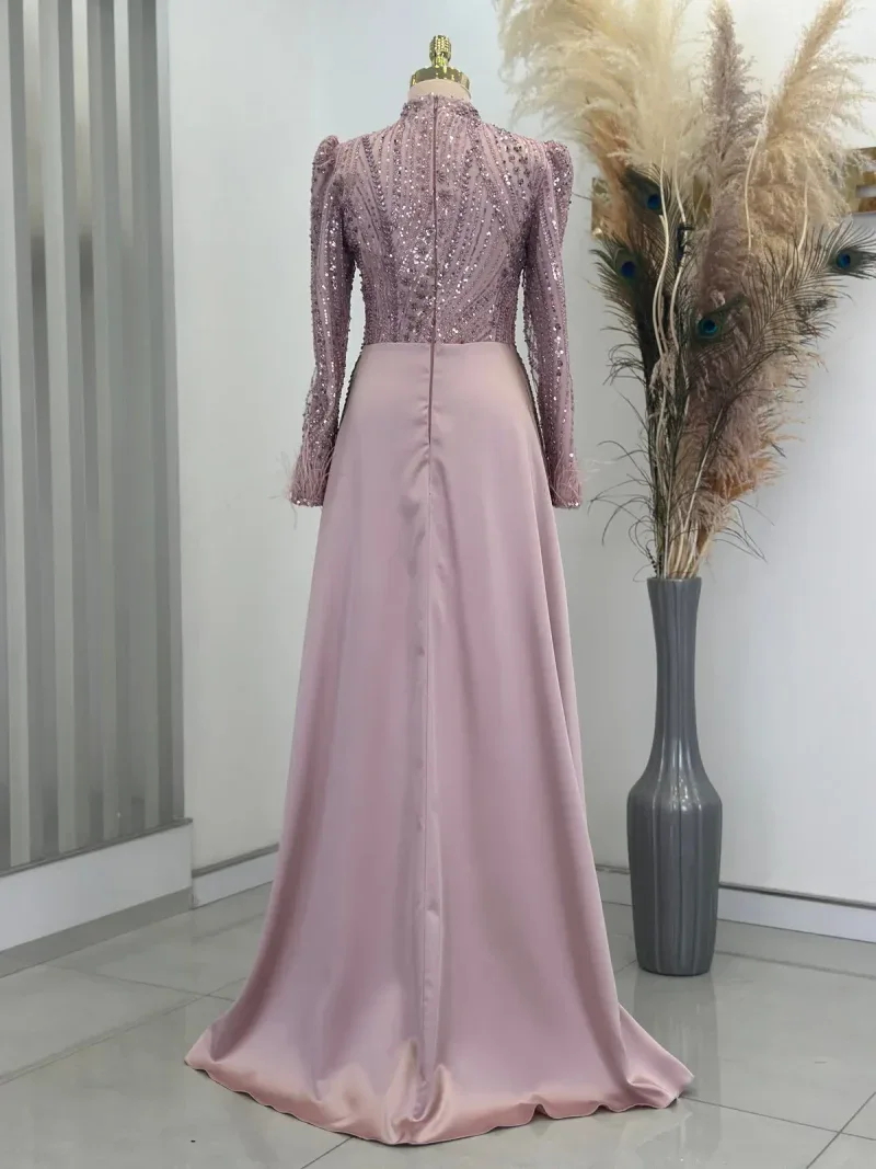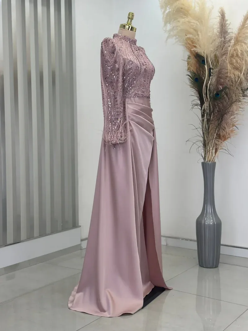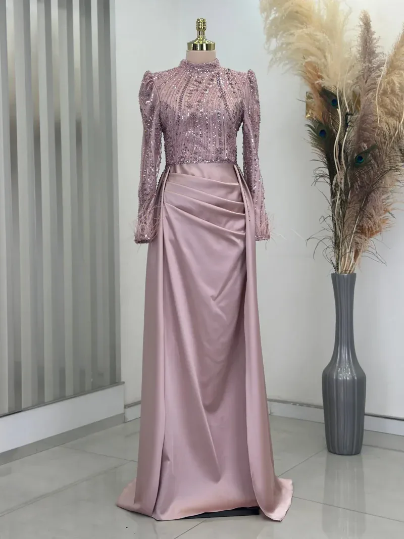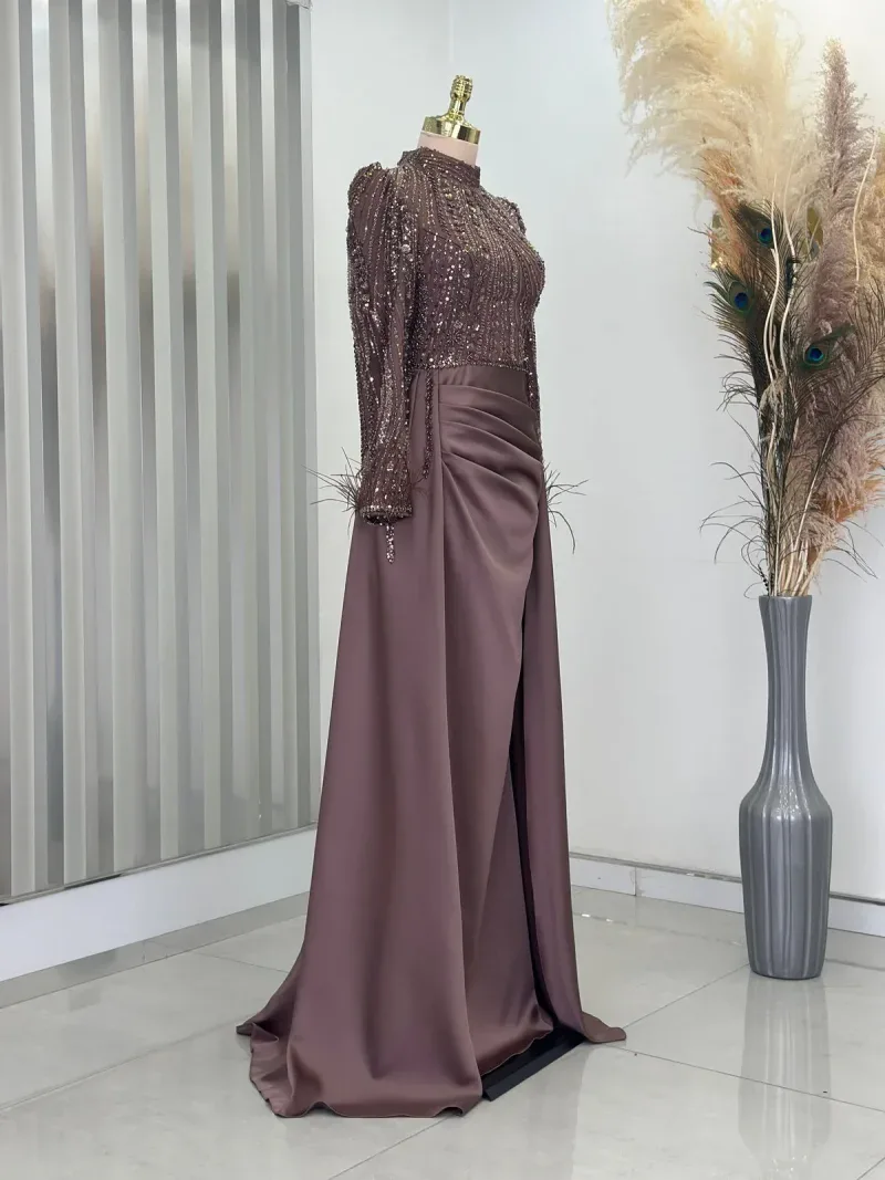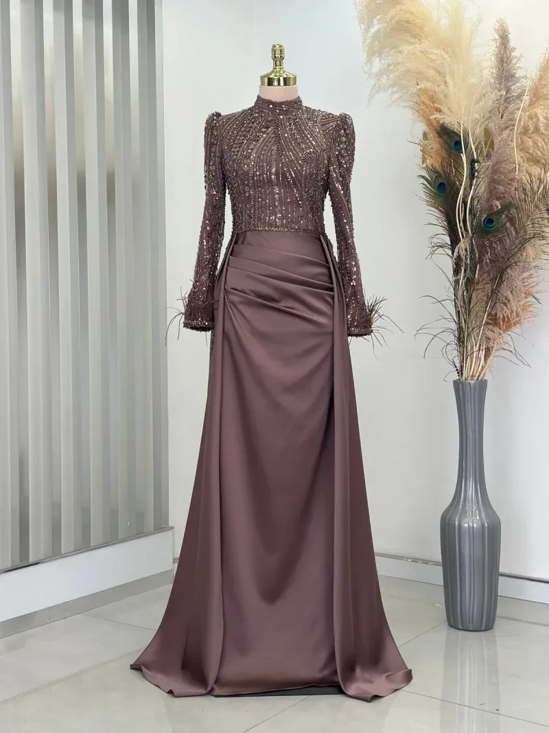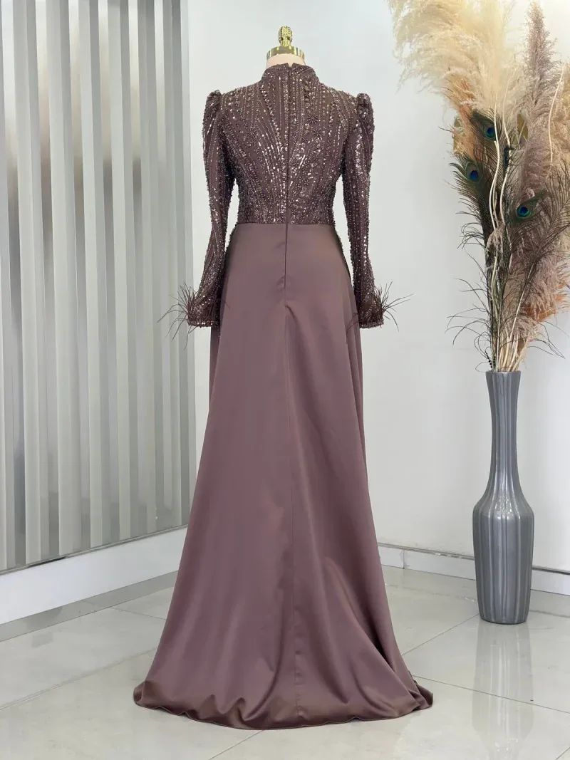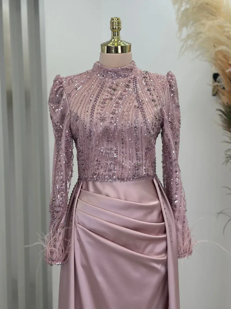 This elegant evening gown is the perfect choice for those wanting to dazzle on special occasions. Standing out with its chic design and fine details, the dress completes your sophisticated look. The depth of navy blue and its lustrous fabric create an aristocratic presence, while the embroidered top draws attention as an elegant accent. The long sleeves and body-hugging cut reveal a graceful silhouette while offering comfortable wear. The high neckline and subtle pleats at the skirt section add a modern and classic touch to the dress. This unique gown, which will make you feel like a princess at special events, engagement ceremonies, or weddings, truly deserves a place in every wardrobe. With this design that combines elegance and sophistication, you’ll feel both special and at the forefront of fashion. A must-have for all women who want to look magnificent from head to toe!