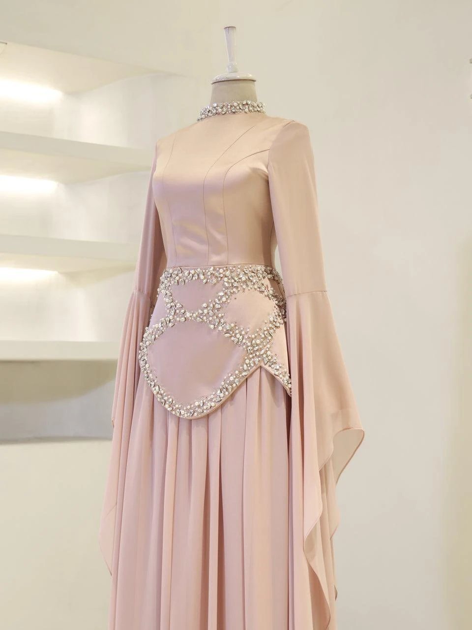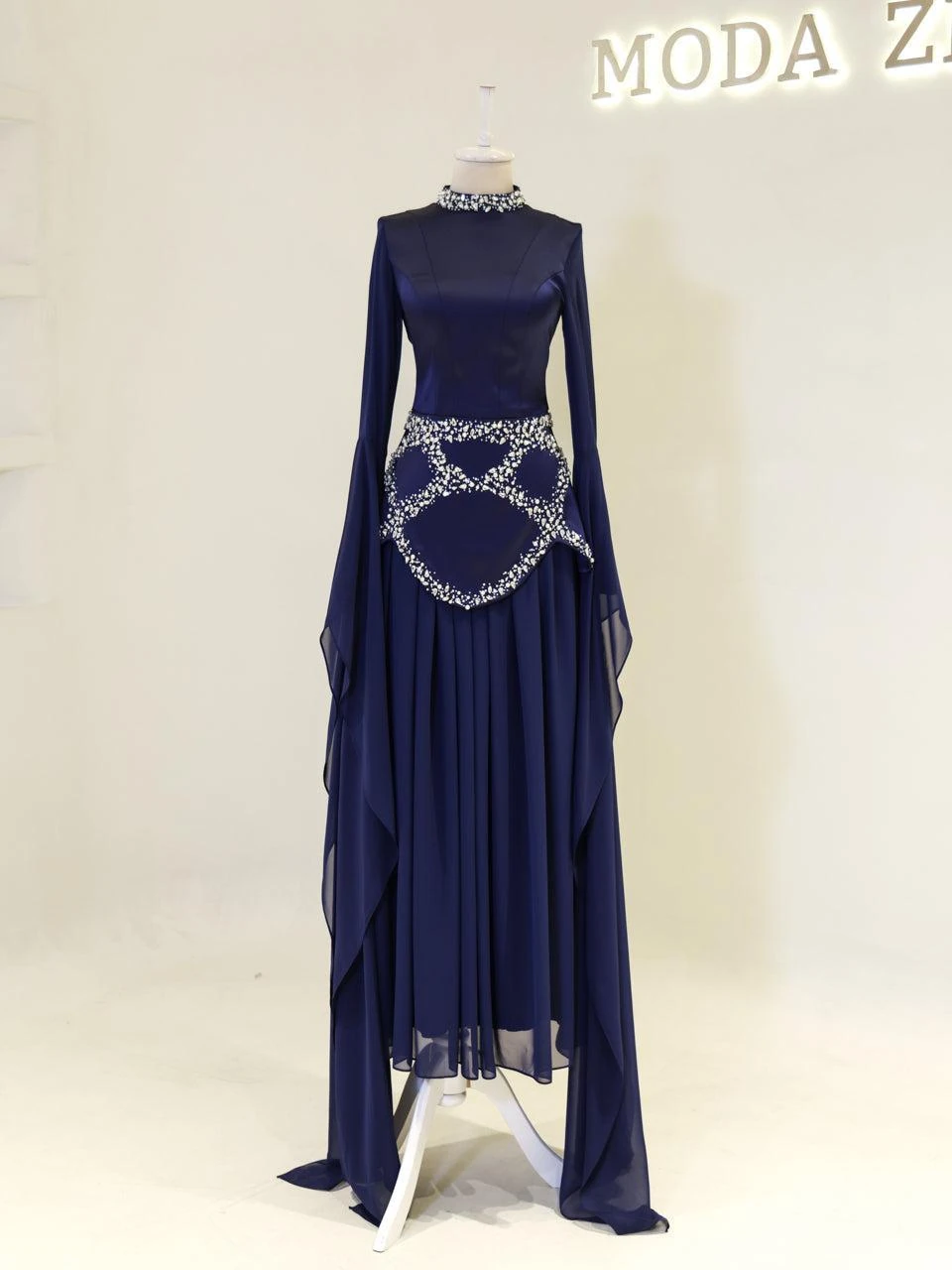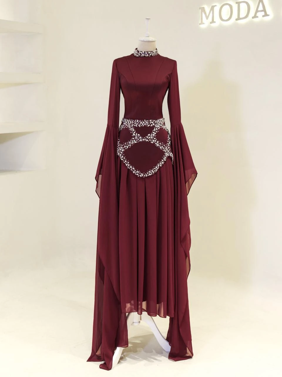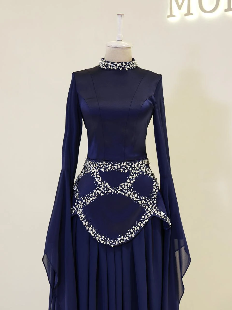 The Moliere Modest Outfit Set is designed with precision to fit true to size. The blouse measures 65 cm in length, while the skirt extends to 110 cm. The top is crafted from satin crepe fabric, providing a smooth and elegant appearance, and the skirt is made from chiffon, offering a lightweight and flowing feel. The set includes a lining for added comfort and coverage. It features a back tie and zipper for secure fastening. The outfit is equipped with a built-in bust pad for added support. The sleeves are designed in a flared style, and the embellishments are attached using adhesive and studs. The skirt has a flared design. Note: Due to the adhesive nature of the embellishments, some may become loose over time, but this will not affect the overall look of the set.