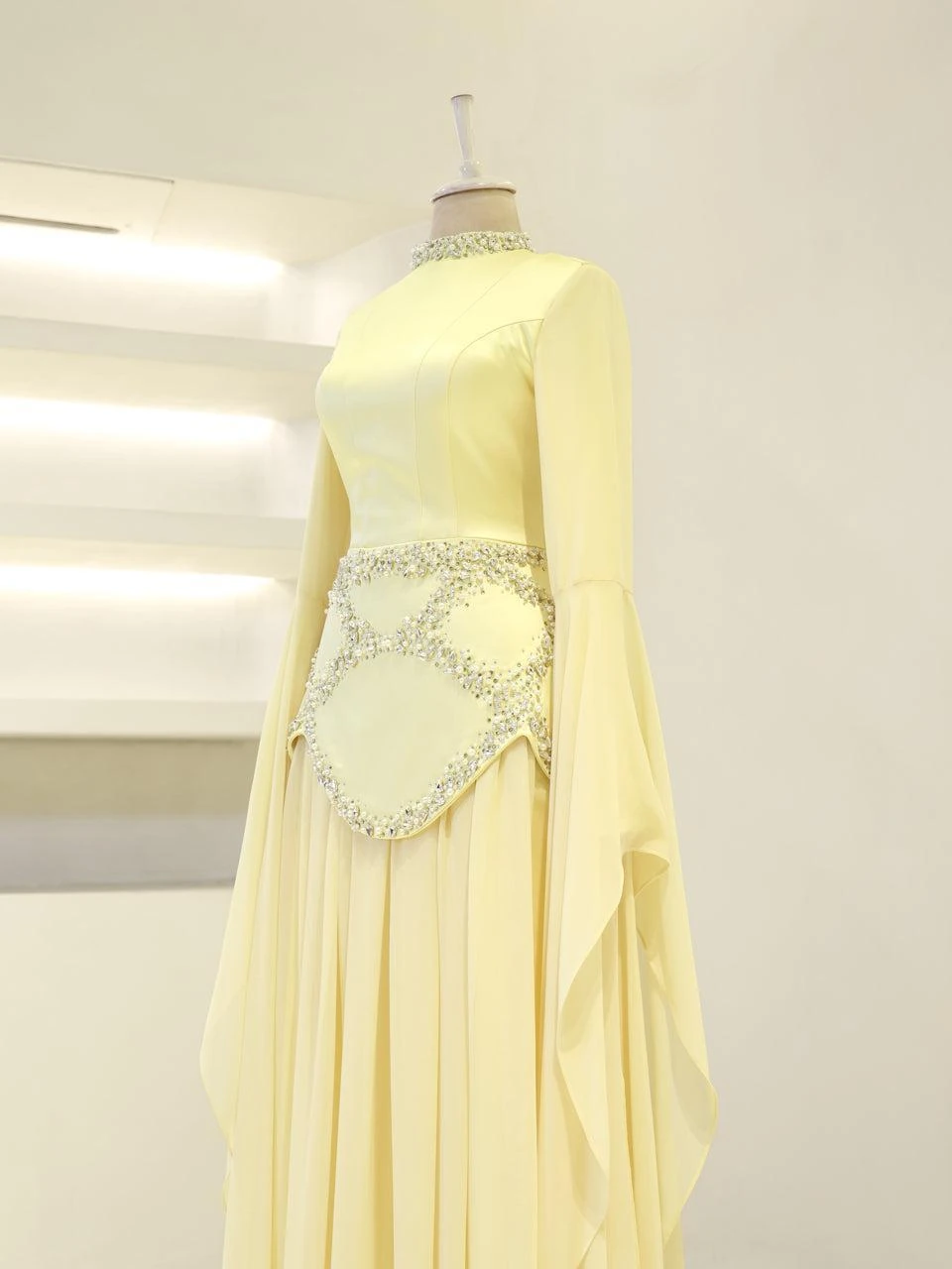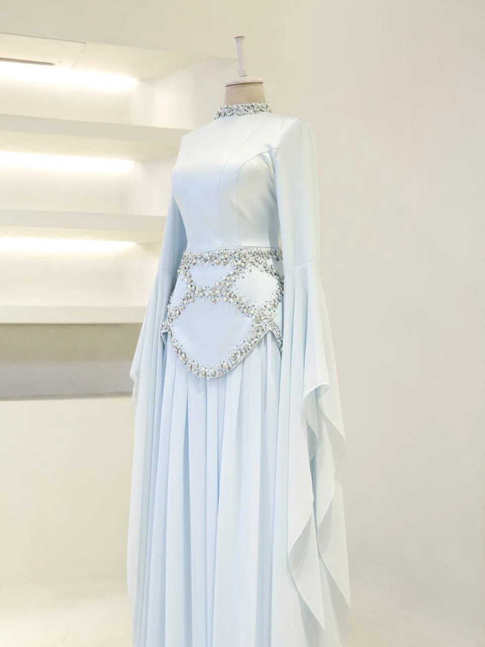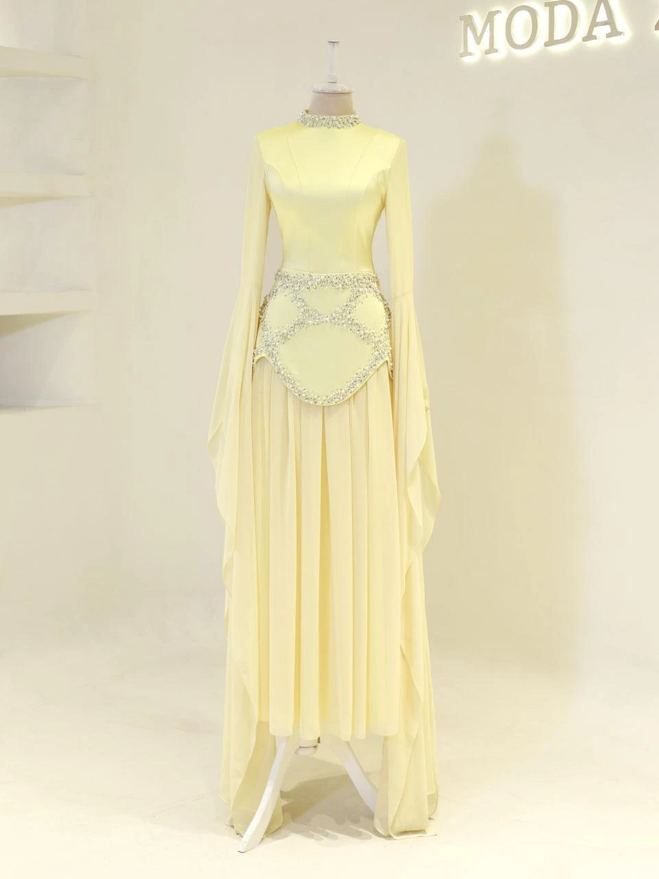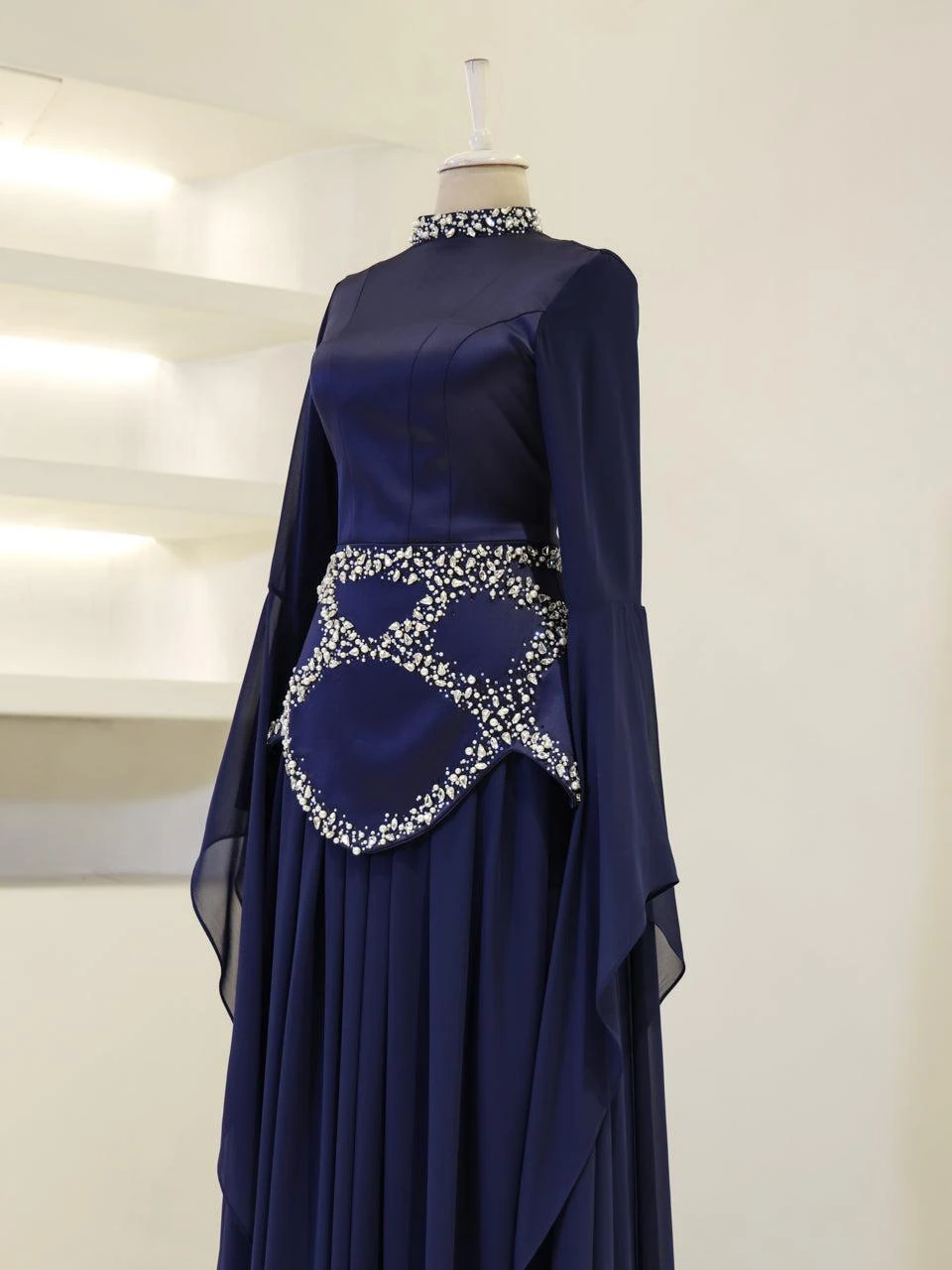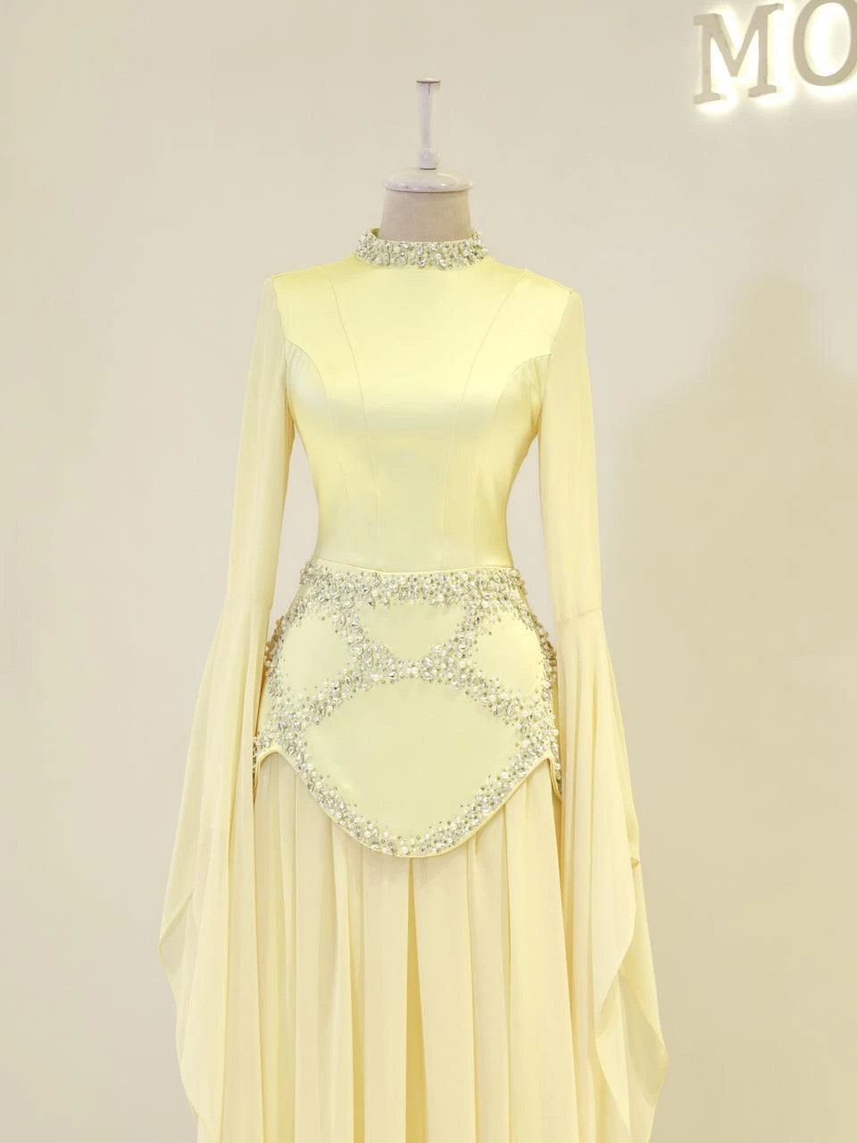 The Moliere Modest Outfit Set is designed with precision to fit true to size. The blouse measures 65 cm in length, while the skirt extends to 110 cm. The top is crafted from satin crepe fabric, providing a smooth and elegant appearance, and the skirt is made from chiffon, offering a lightweight and flowing feel. The set includes a lining for added comfort and coverage. It features a back tie and zipper for secure fastening. The outfit is equipped with a built-in bust pad for added support. The sleeves are designed in a flared style, and the embellishments are attached using adhesive and studs. The skirt has a flared design. Note: Due to the adhesive nature of the embellishments, some may become loose over time, but this will not affect the overall look of the set.