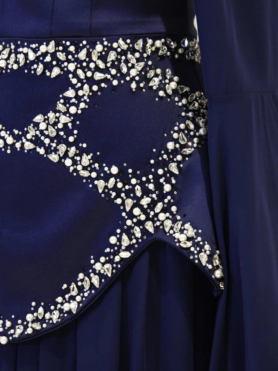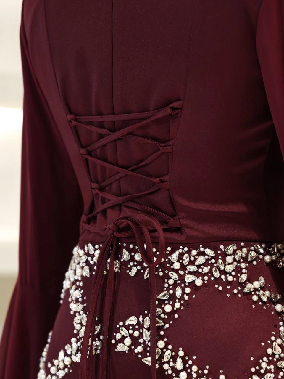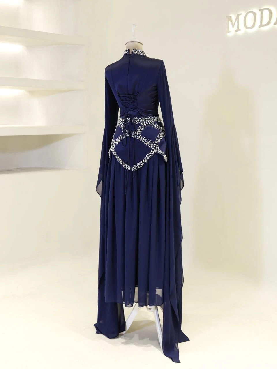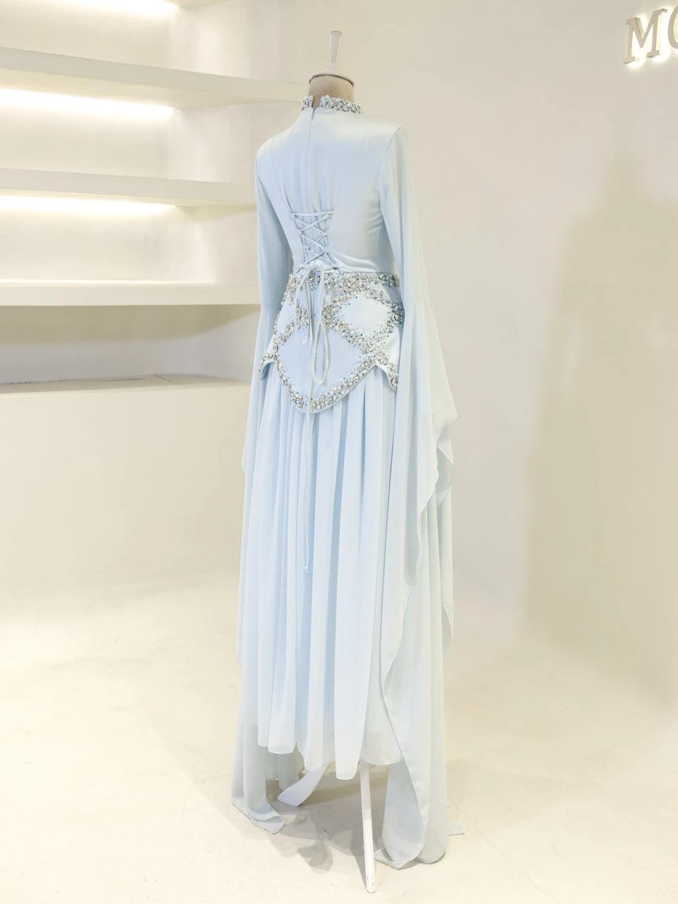The Moliere Modest Outfit Set is designed with precision to fit true to size. The blouse measures 65 cm in length, while the skirt extends to 110 cm. The top is crafted from satin crepe fabric, providing a smooth and elegant appearance, and the skirt is made from chiffon, offering a lightweight and flowing feel. The set includes a lining for added comfort and coverage. It features a back tie and zipper for secure fastening. The outfit is equipped with a built-in bust pad for added support. The sleeves are designed in a flared style, and the embellishments are attached using adhesive and studs. The skirt has a flared design. Note: Due to the adhesive nature of the embellishments, some may become loose over time, but this will not affect the overall look of the set.