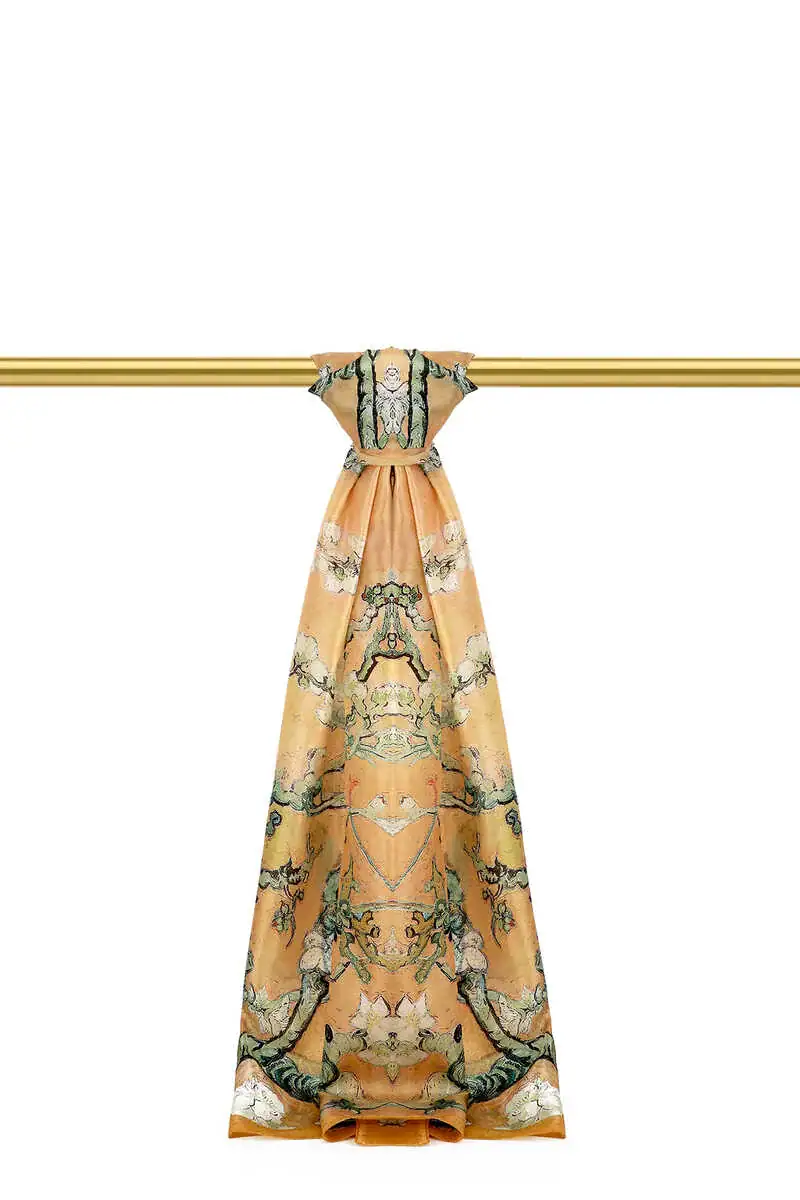 The Hardal Badem Çiçeği Desen Vual İpek Şal is a mustard-colored silk scarf featuring eye-catching patterns. Made from 100% silk, it measures 70 x 195 cm and is produced in Bursa, Turkey.