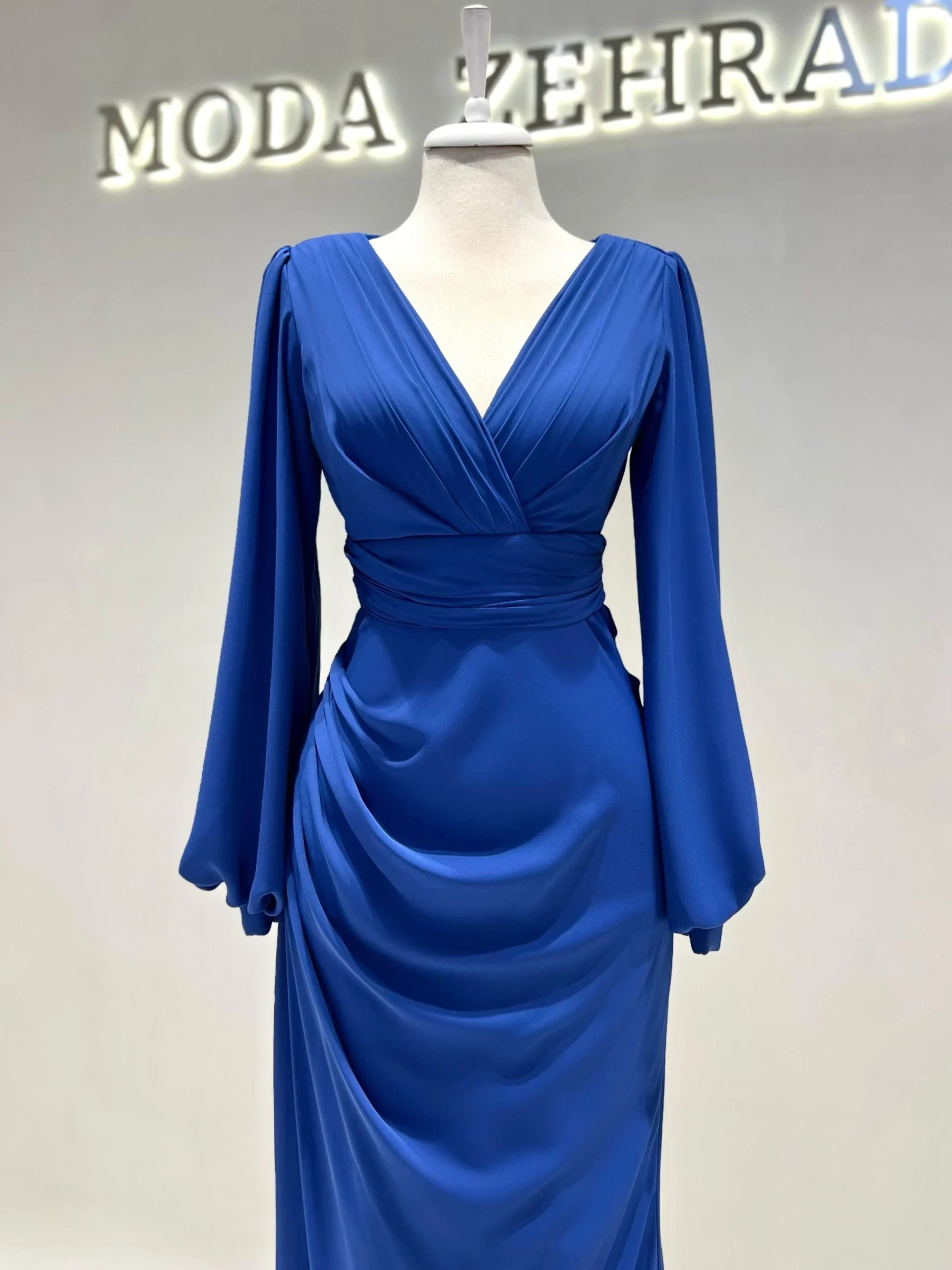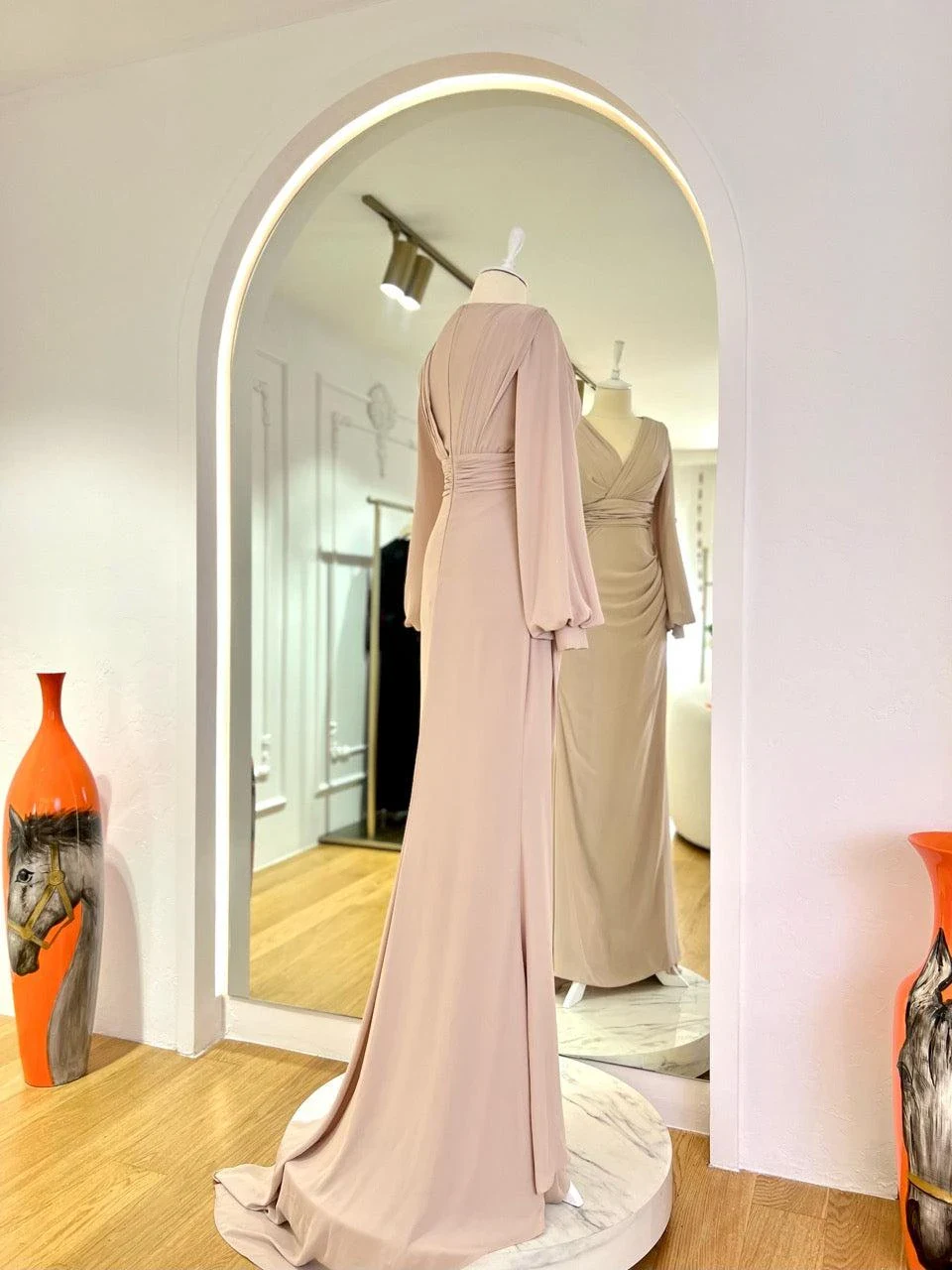The Nasrin Evening Dress features a length of 170 cm at the front and 215 cm at the back. Designed with a fitted silhouette, it is made from chiffon fabric and includes flared sleeves with button details at the cuffs. The dress has a V-neckline and a draped detail at the waist, providing an elegant touch. It is equipped with a back zipper and has an A-line skirt form. Please note: Due to its fitted design, it is recommended to purchase one size larger.