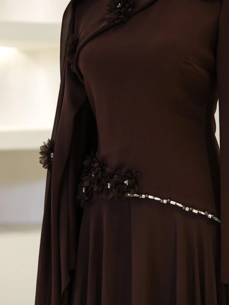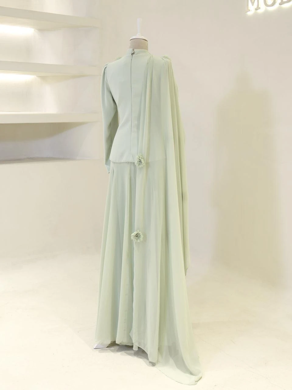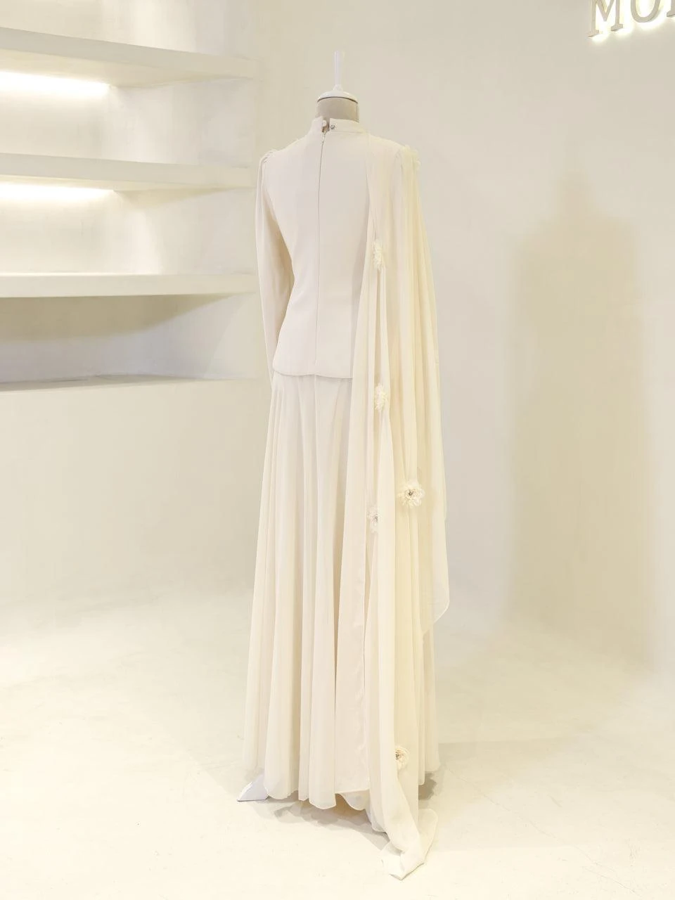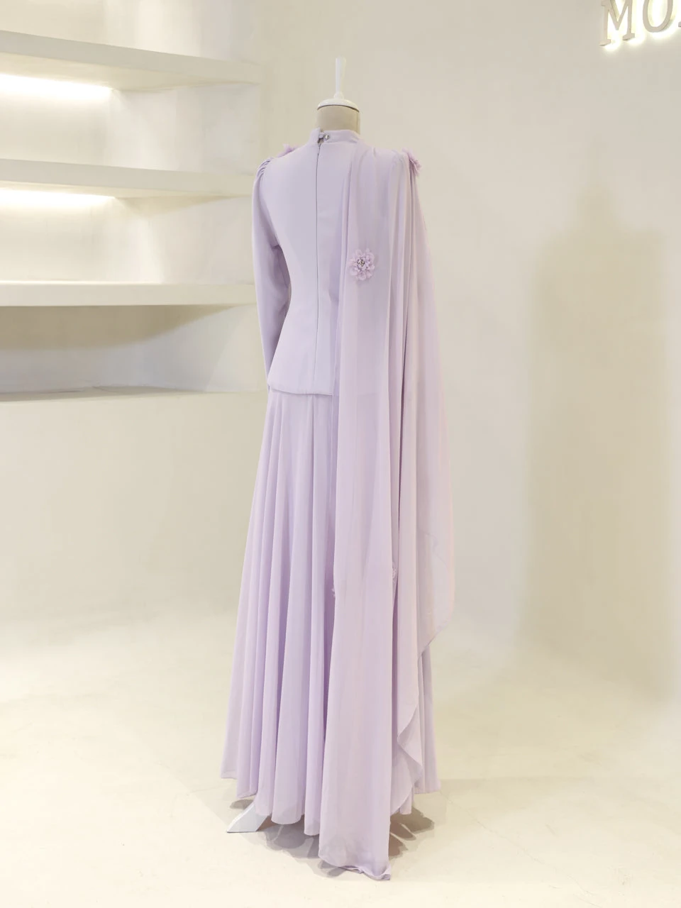 The Nathalia Modest Evening Dress is designed with a precise fit and measures 150 cm in length. The upper part is crafted from crepe fabric, while the lower part features chiffon fabric. It includes a back zipper closure and built-in chest pads for added comfort. The dress is adorned with a cape detail that extends from the right shoulder to the hem. It is fully lined and features both sewn and glued embellishments, with a flared skirt design.