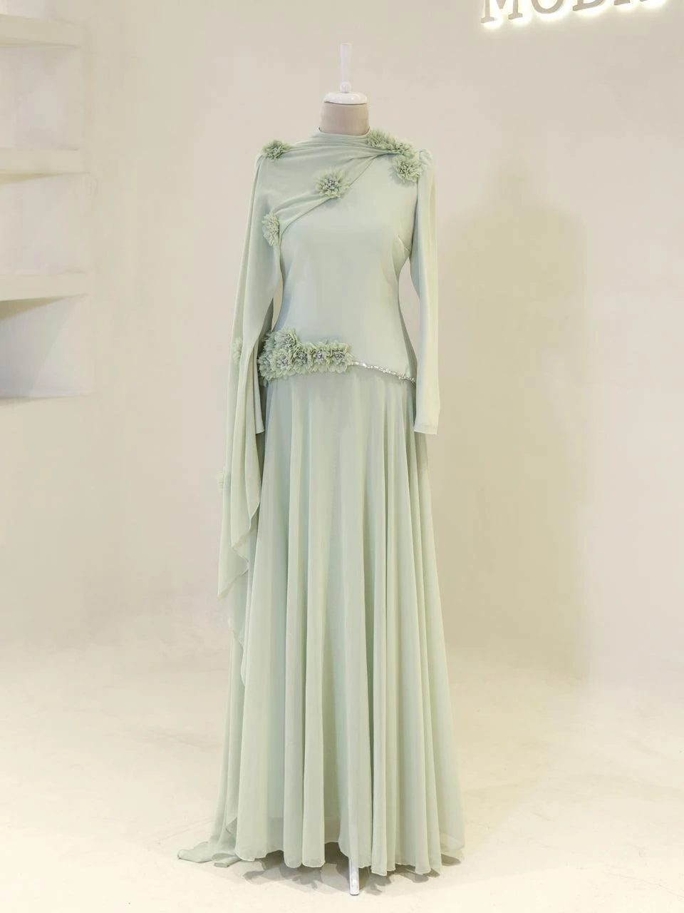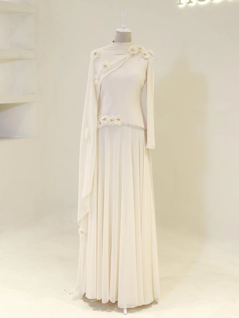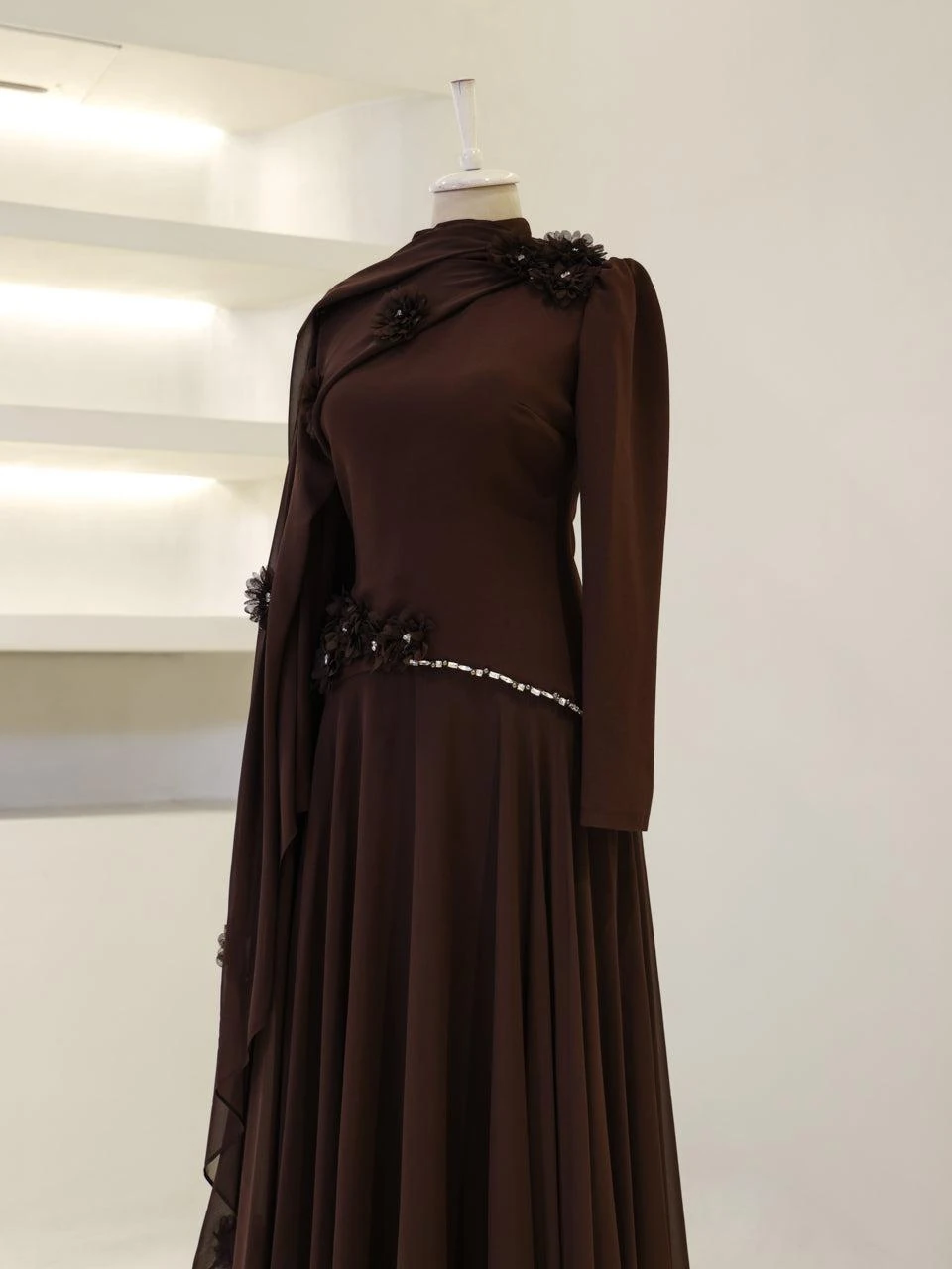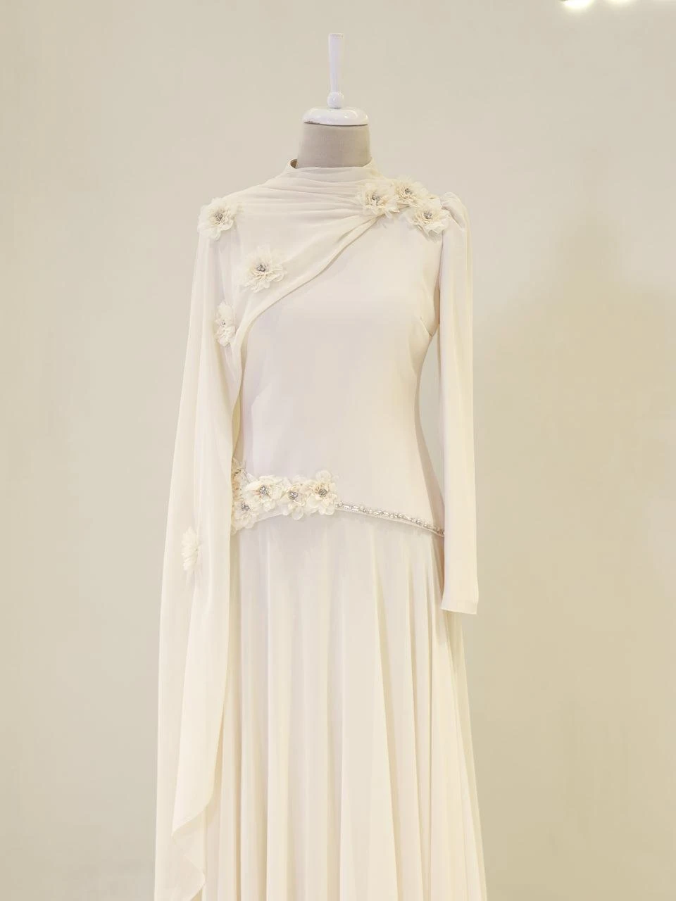 The Nathalia Modest Evening Dress is designed with a precise fit and measures 150 cm in length. The upper part is crafted from crepe fabric, while the lower part features chiffon fabric. It includes a back zipper closure and built-in chest pads for added comfort. The dress is adorned with a cape detail that extends from the right shoulder to the hem. It is fully lined and features both sewn and glued embellishments, with a flared skirt design.