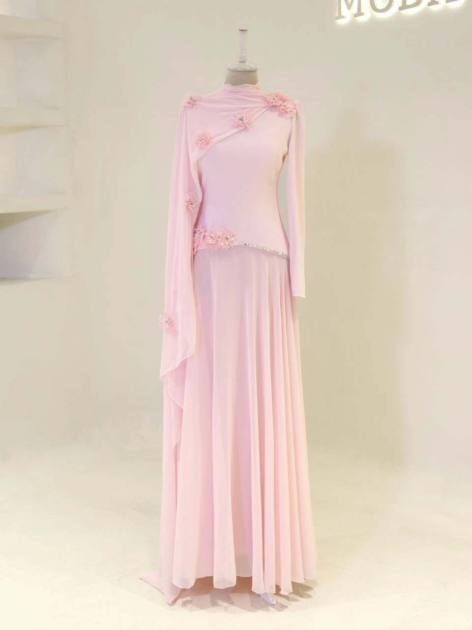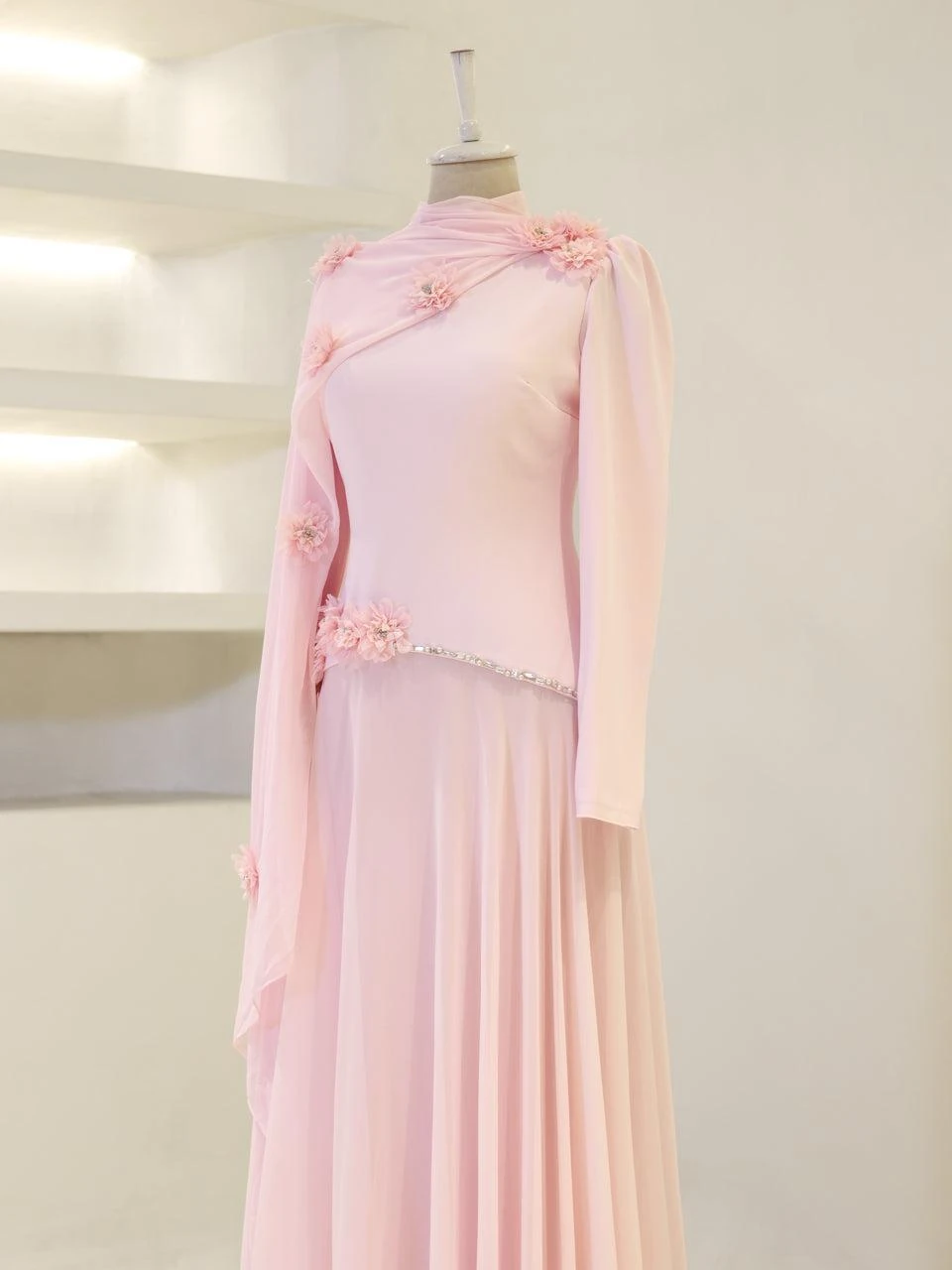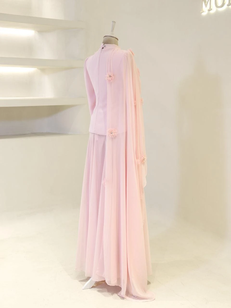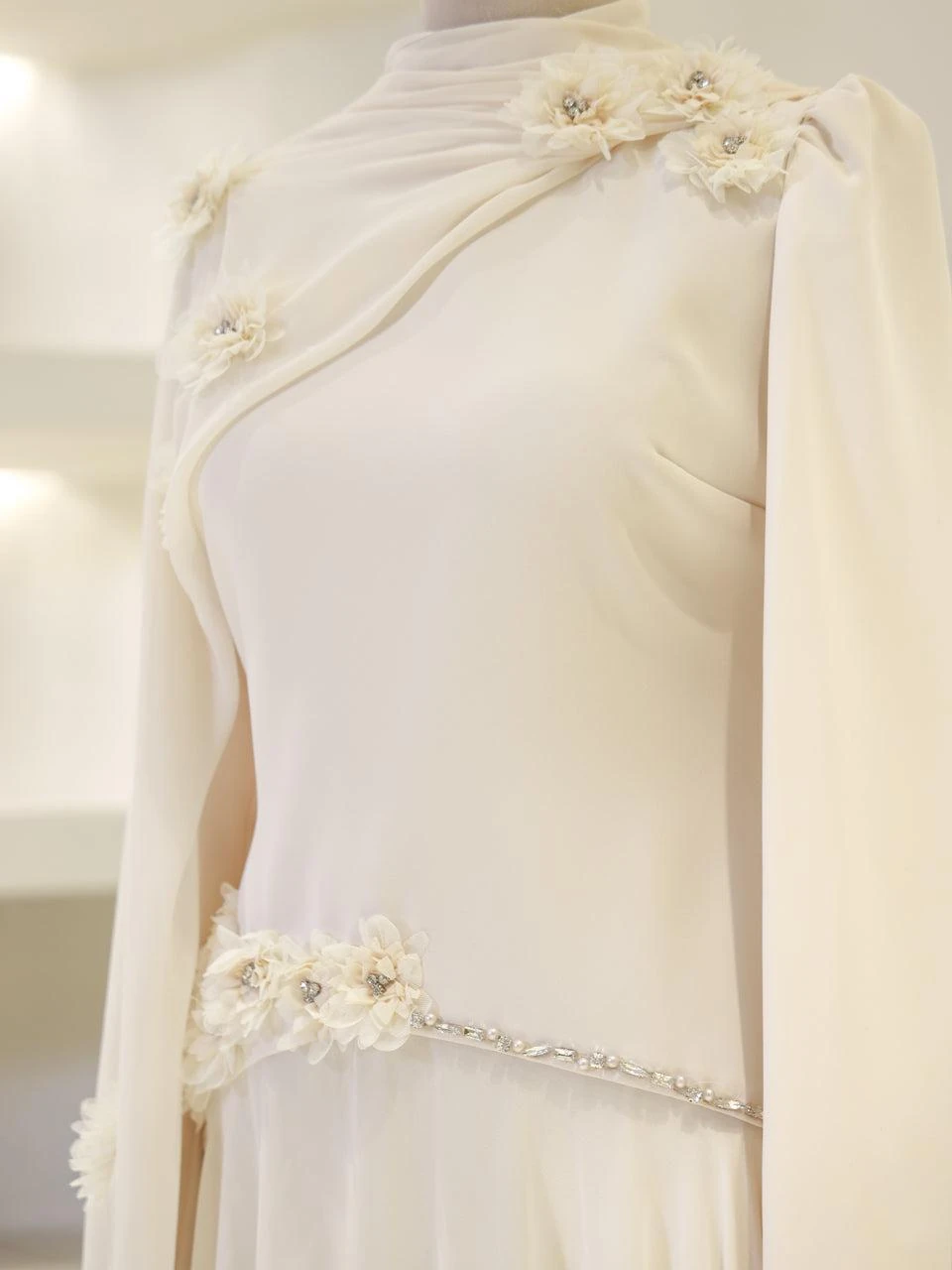 The Nathalia Modest Evening Dress is designed with a precise fit and measures 150 cm in length. The upper part is crafted from crepe fabric, while the lower part features chiffon fabric. It includes a back zipper closure and built-in chest pads for added comfort. The dress is adorned with a cape detail that extends from the right shoulder to the hem. It is fully lined and features both sewn and glued embellishments, with a flared skirt design.