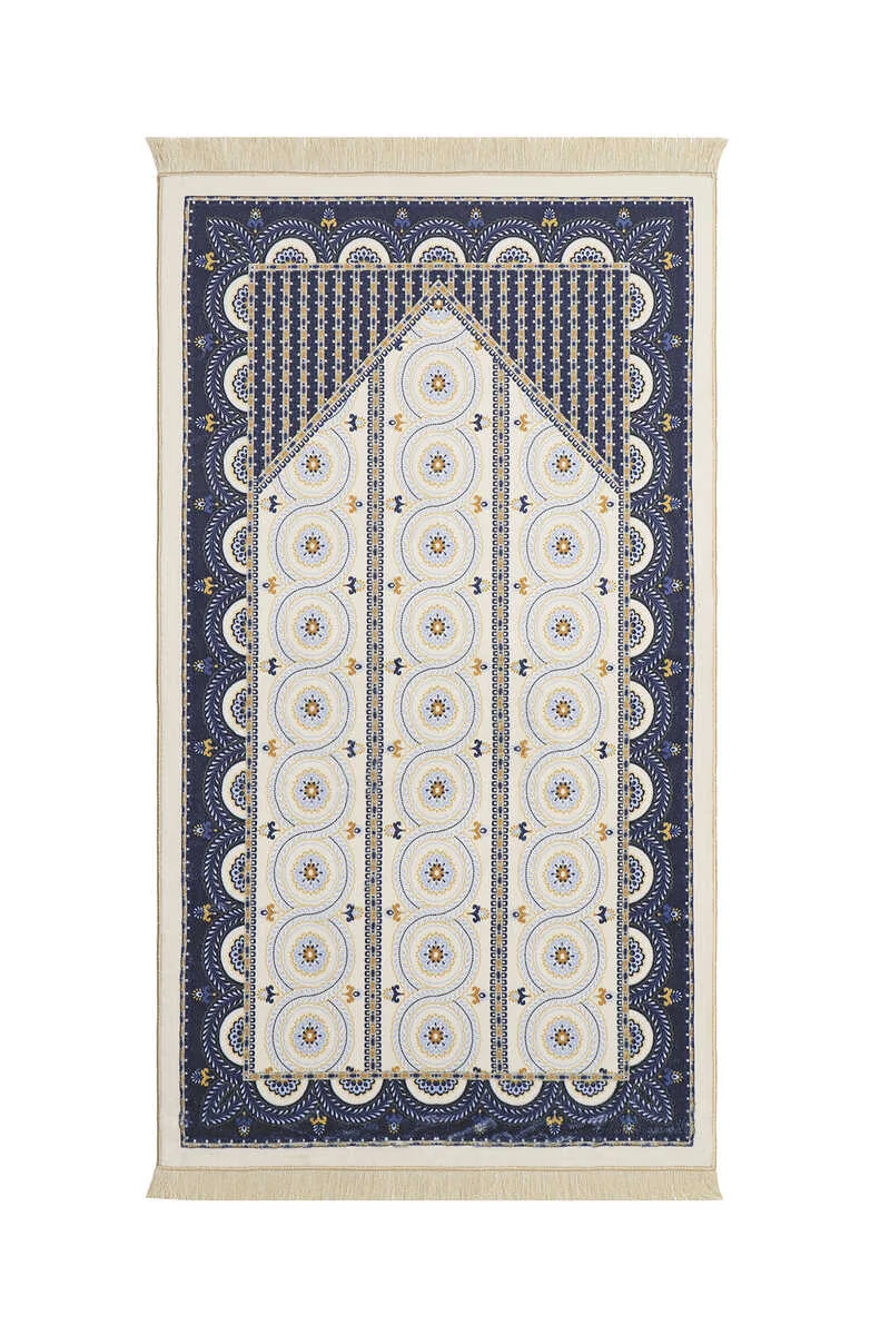The Lacivert Bambu Halı Seccade is a prayer rug featuring Turkish motifs and tile patterns with an silky texture and eye-catching colors. It measures 67×115 cm and is designed for comfortable use, originating from Bursa, Turkey.
