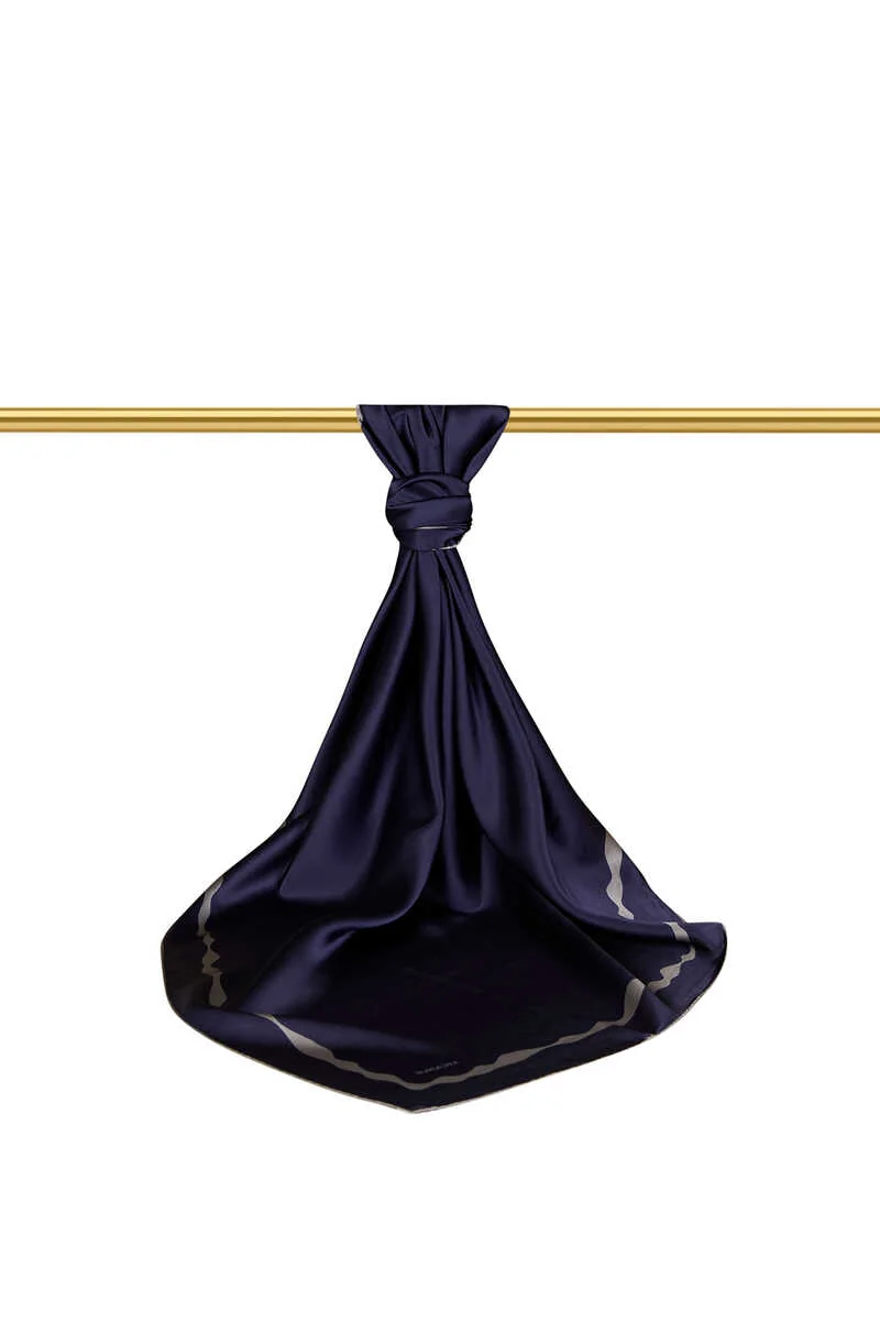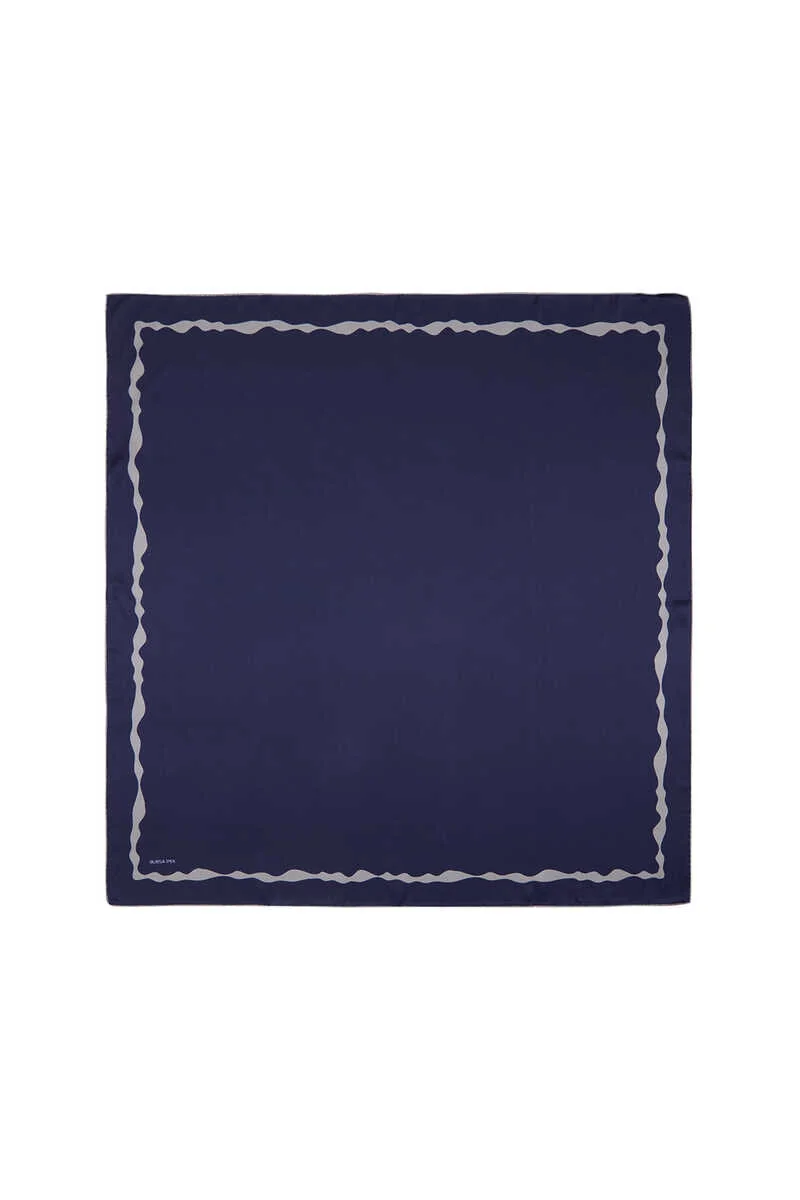 This navy blue silk scarf features a water wave pattern along the edges, offering a simple yet elegant design that suits any season. Crafted from 100% silk, it provides comfort and style in its generous 90×90 cm size. Originating from Bursa, Turkey, this scarf adds a touch of sophistication to any outfit.