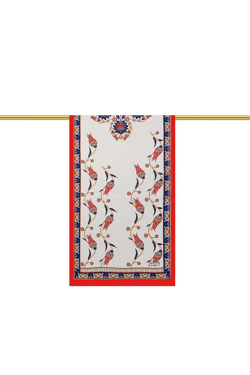 The Lacivert Kırmızı Sıra Lale İpek Fular is a silk scarf featuring eye-catching patterns in navy and red. Made from 100% silk, it measures 55x160cm and originates from Bursa, Turkey.