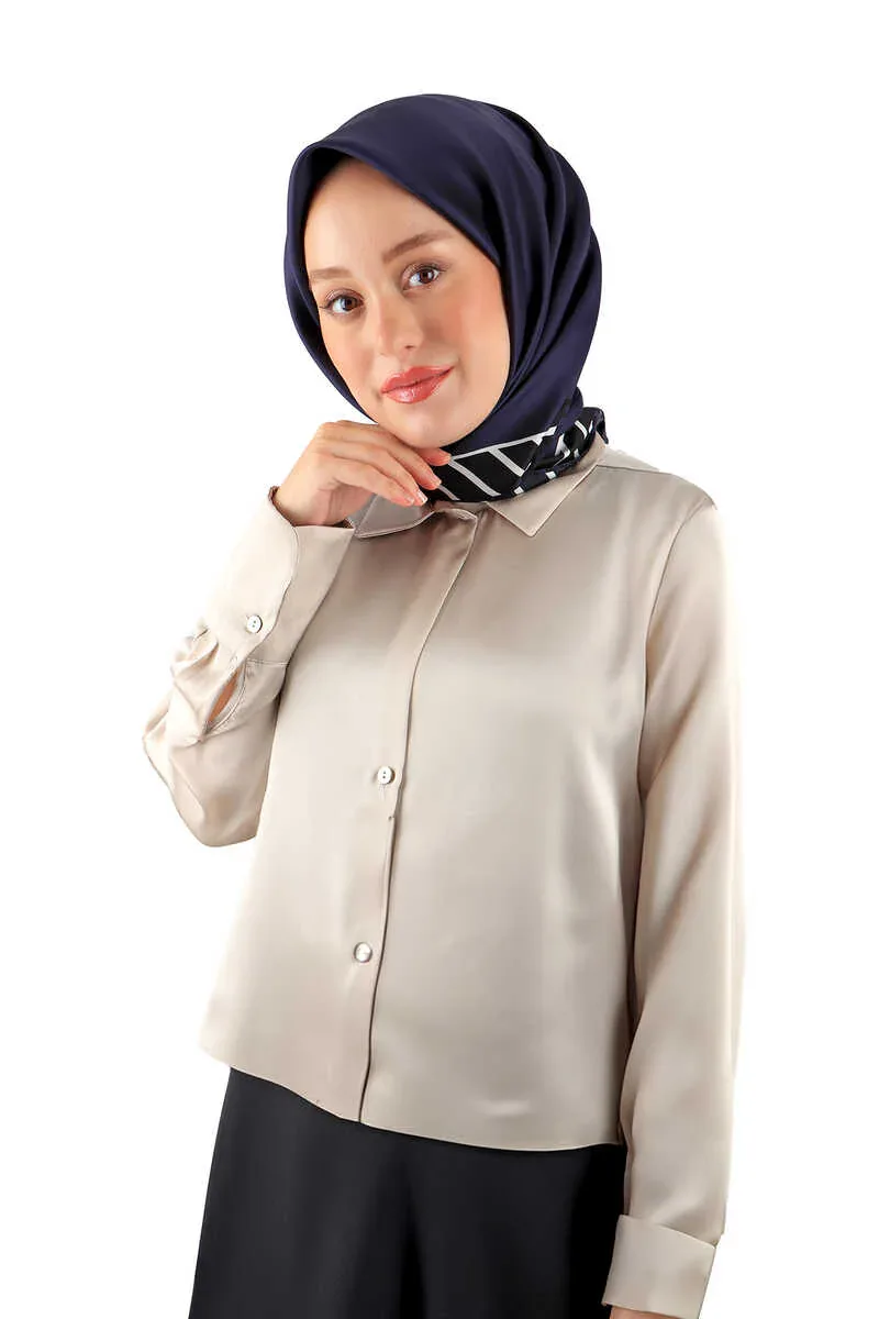 The Navy Stripe Pattern Twill Silk Scarf adds a touch of elegance to any outfit. Crafted from 100% twill silk, it offers a sturdy and upright appearance. With its simple design and broad color palette, this scarf is suitable for every season. Measuring 90 x 90 cm, it provides comfort and ease of use. Originating from Bursa, Turkey, this scarf reflects quality craftsmanship.