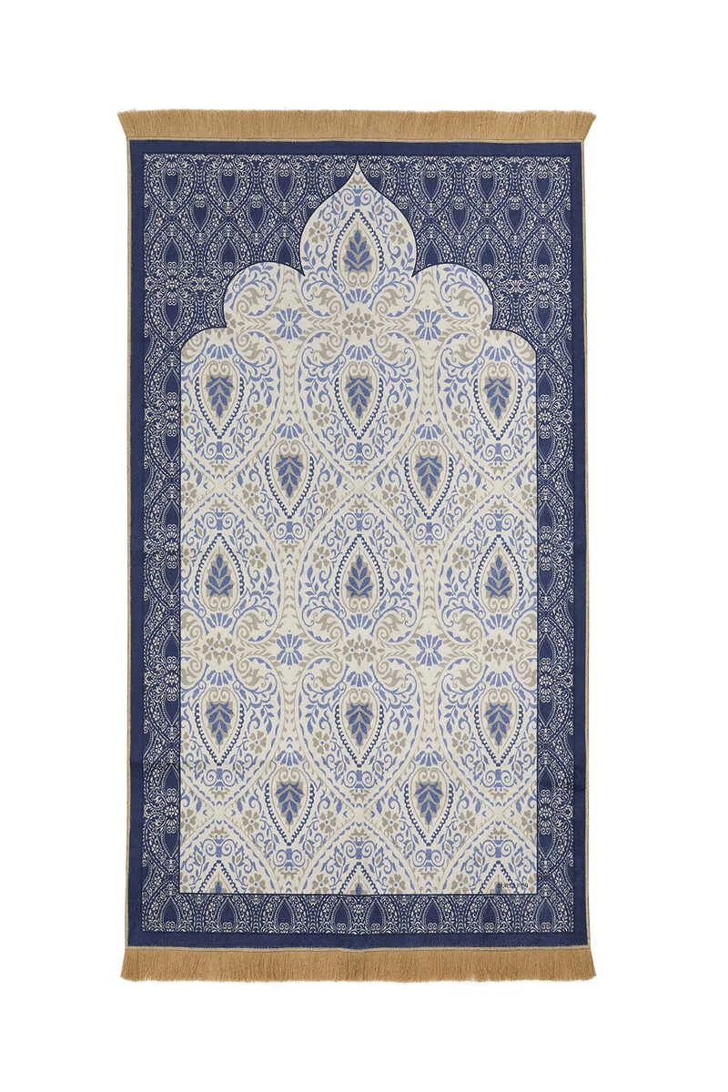 The Navy Velvet Prayer Rug combines traditional Turkish motifs with intricate tile patterns. Designed for both aesthetic appeal and comfort, it measures 65x115cm. The rug is crafted in Bursa, Turkey, known for its textile heritage. Its velvet texture adds a touch of elegance to any space while providing a soft surface for prayer.