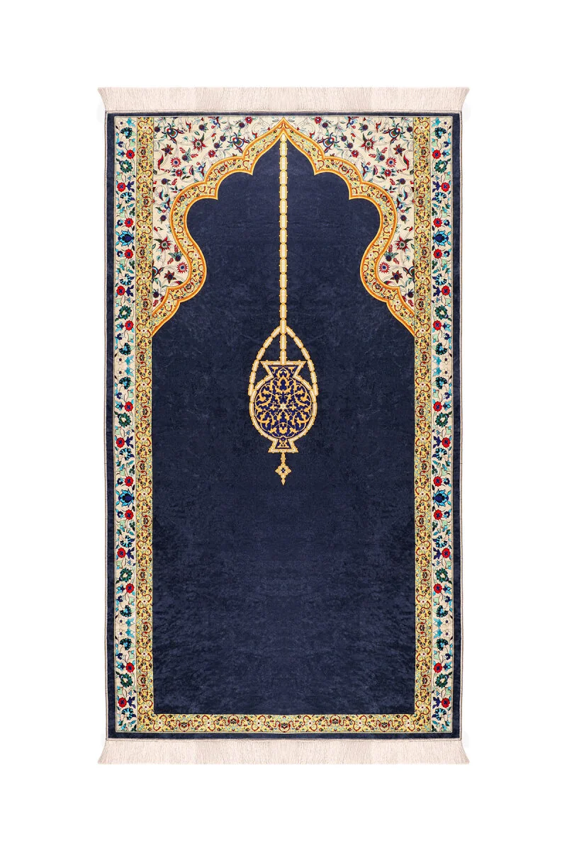 The Lacivert Süngerli Kadife Seccade is a velvet prayer rug designed for comfort and style, featuring a soft velvet surface and sponge filling for support. It measures 65 x 115 cm and is made in Bursa, Turkey.
