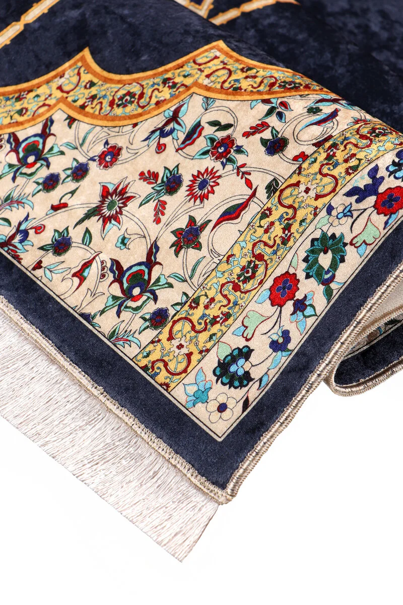 The navy velvet prayer rug is designed to enhance your prayer experience with comfort and style. Made from high-quality velvet fabric, it gently touches the skin while the sponge filling provides support for knees and feet. This ensures comfort even during extended use. Measuring 65 x 115 cm, it offers ease of use. Originating from Bursa, Turkey, this rug is a practical choice for daily prayers.